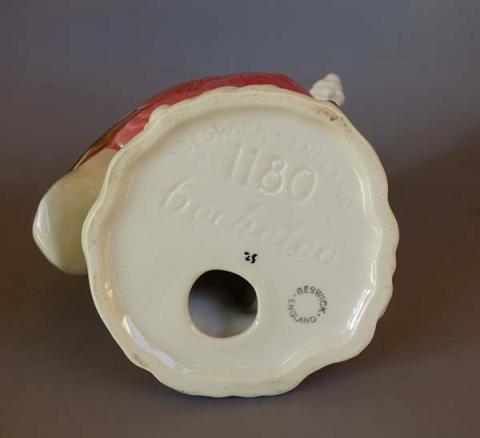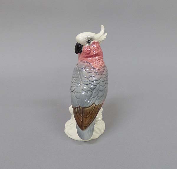 Figura de porcelana que representa una cacatúa hembra de tamaño mediano. Esta representada de forma muy realista. Su plumaje es de color rosa en el cuerpo, cabeza amarillo pálido y alas posteriores de color gris, las inferiores y mas largas de color café. Su pico es curvo de color negro. Sus patas anilladas de color gris. Esta parado en una sola pata sobre un montículo o piedra de pequeño tamaño y de color blanco.