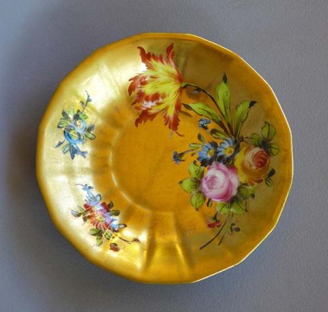 Conjunto para tomar el café compuesto por una taza y platillo. La taza de forma apanelada con pie. Completamente dorada, con aplicación de grupos de flores policromadas, el mismo diseño se repite en el plato. El interior de la taza también es dorado.
