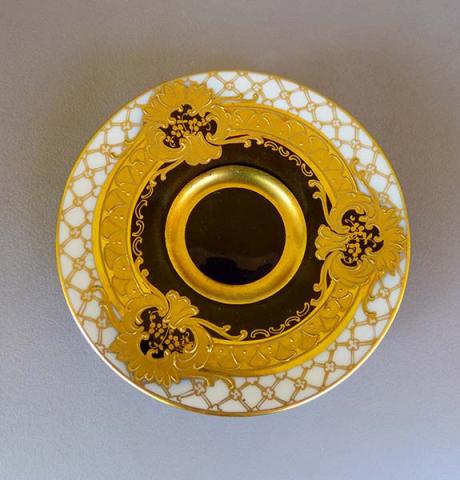 Conjunto de taza y platillo para tomar café, denominado demitasse (en frances) o mokkatasse (alemán). Corresponde en tamaño a la mitad de una taza de café. Esta decorada a mano con flores, acantos y otros motivos vegetales en sobredorado. Además de filigrana en forma de rejilla en la zona superior del borde. Al centro una franja dorada y el tercio inferior en azul cobalto. El platillo repite la misma decoración de franja ancha con motivos vegetales en la parte media, centro azul cobalto y cercano al borde franja de rejilla o malla con filigrana dorado.