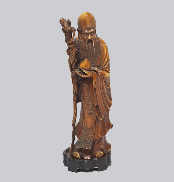 Talla en marfil de un personaje masculino de pie, de avanzada edad. Su cabeza es prominente y alargada, tiene escaso cabello y rostro sonriente. Viste túnica que lo cubre casi completamente dejando solo las puntas del calzado a la vista. En su mano izquierda porta un báculo y en la derecha y junto al pecho una calabaza llena del elixir de la vida. Descansa sobre una peana de madera calada.