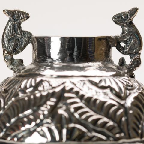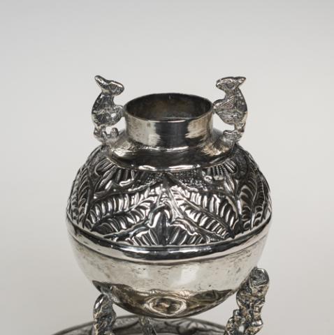 Recipiente de uso doméstico con diseño compuesto, que incluye un cuerpo globular con un cuello estrecho y una boca de forma circular. Exhibe dos asas ornamentadas con motivos zoomorfos. El cuerpo se apoya y eleva mediante tres soportes que se conectan en el centro de una base circular. El cuerpo del recipiente presenta una decoración elaborada con patrones florales y vegetales que se han repujado en relieve. Los soportes que unen el cuerpo con el platillo están adornados con representaciones de figuras vegetales, mientras que el platillo se distingue por su centro repujado y bordes laminados, que presentan grabados en relieve tanto en la parte superior como en la inferior.