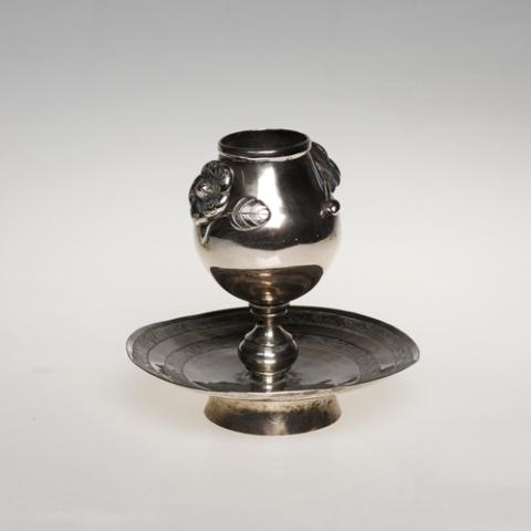 Recipiente de uso doméstico, diseñado para la preparación de la yerba mate, se configura por un vaso sin asa, que integra un fuste y una salvilla. En su parte superior, tiene una abertura circular y un cuello de longitud reducida, mientras que el vaso presenta una morfología elipsoidal con paredes que se ensanchan gradualmente hacia la parte inferior, culminando en una base abultada. El fuste se distingue por su semi esfera abultada rodeada por anillos y la salvilla se caracteriza por su morfología circular. El cuerpo está decorado por relieves que exhiben un diseño estilizado compuesto por motivos florales y vegetales, incluyendo dos relieves circulares que ornamentan tanto el borde como el centro de la salvilla.