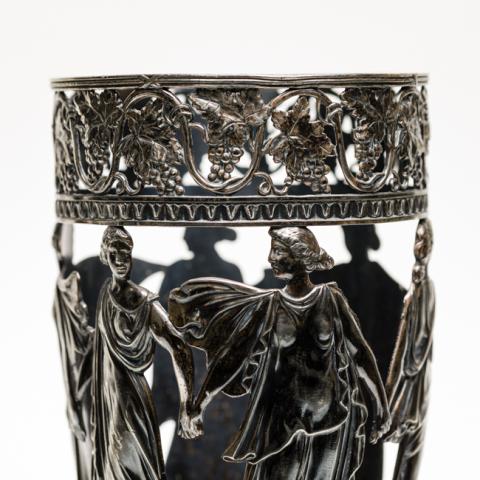 Recipiente de uso decorativo que corresponde a una vasija cilíndrica de diseño estilizado. En su extremo superior, muestra un volumen restringido con una boca circular breve que se eleva en una curva prominente, junto con un asa lateral apuntada y prominente para facilitar su manejo El cuello de la vasija es cilíndrico y alto y el cuerpo exhibe mayor dimensión en la parte superior, con paredes rectas dispuestas en una línea diagonal que forman una base restringida. En el extremo inferior, se presenta un pie abovedado alto y circular, La decoración, incluye relieves metálicos con figuras antropomorfas femeninas en la zona central del cuerpo y motivos vegetales. En su interior, contiene fragmentos de vidrios de color rojo, cuyo fin correspondía a es servir de contenedor de líquidos.