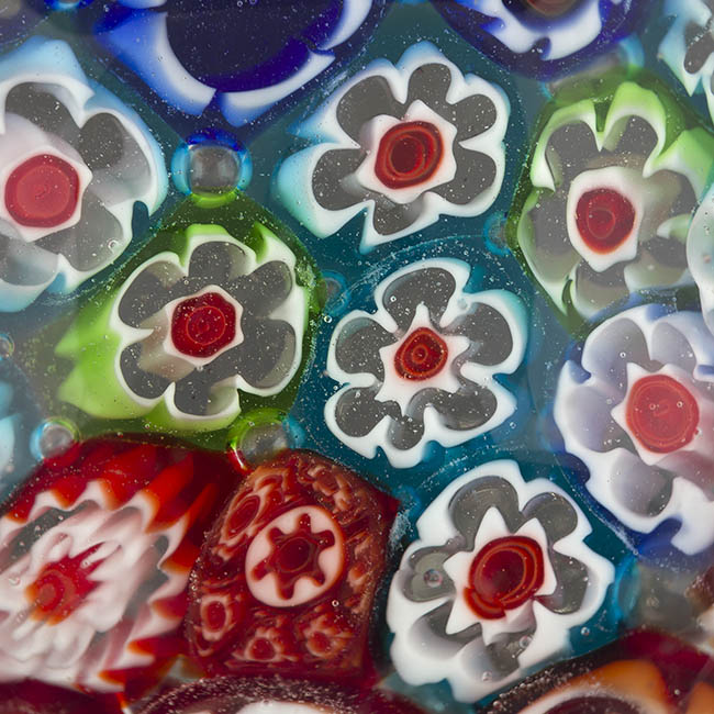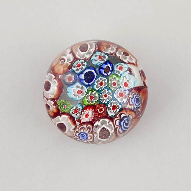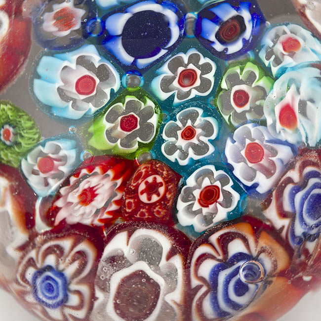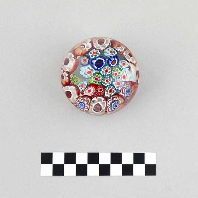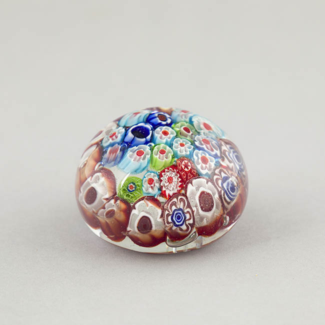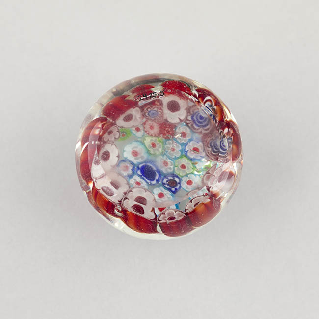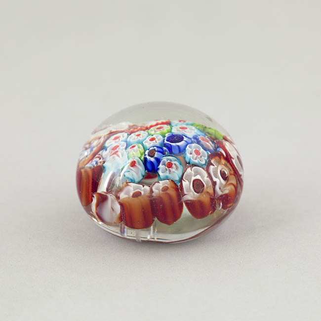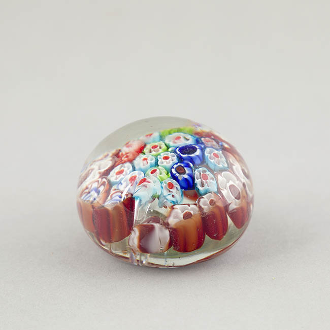 Objeto de uso ornamental y funcional, concebido para sujetar papeles sobre una superficie. Cuerpo de vidrio macizo y transparente con base plana. Su interior está completamente relleno por murrinas de diversos diseños y colores. Se identifican murrinas con contornos florales y estrellados.