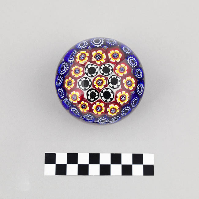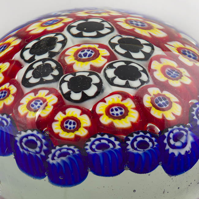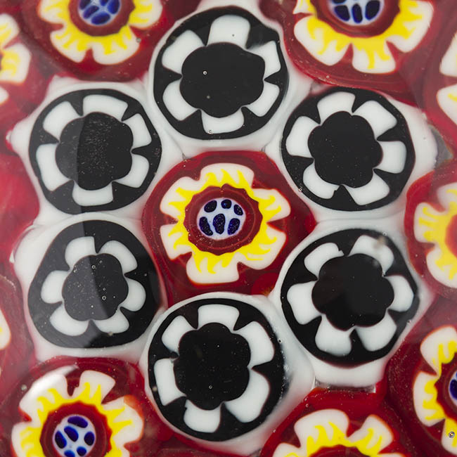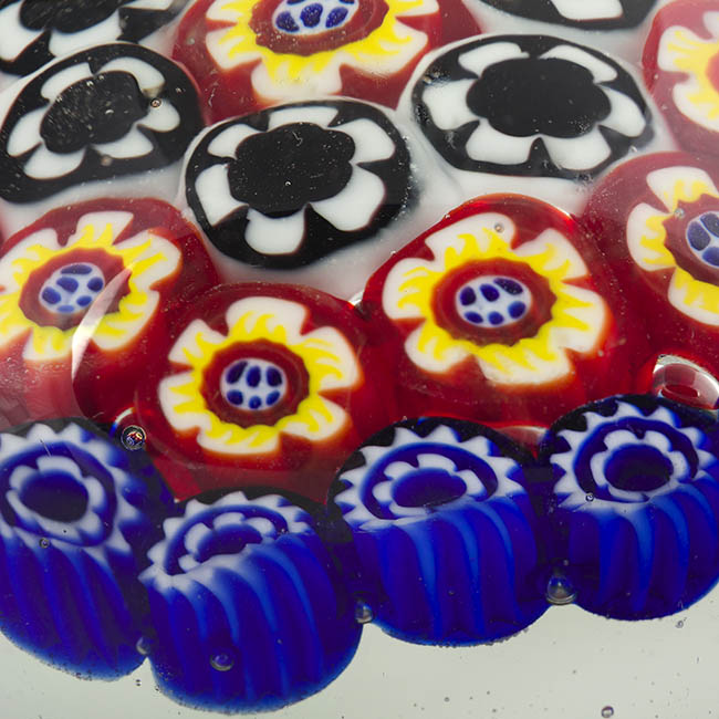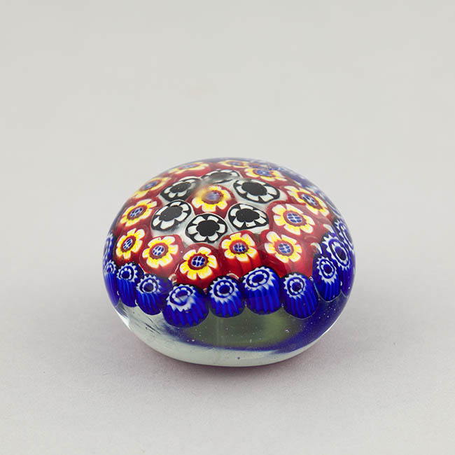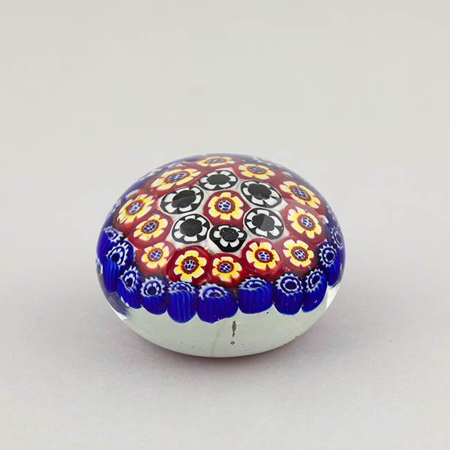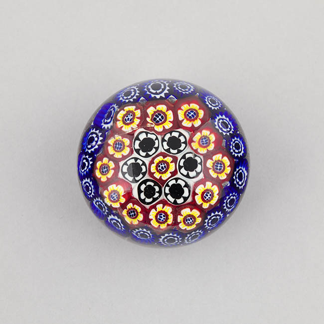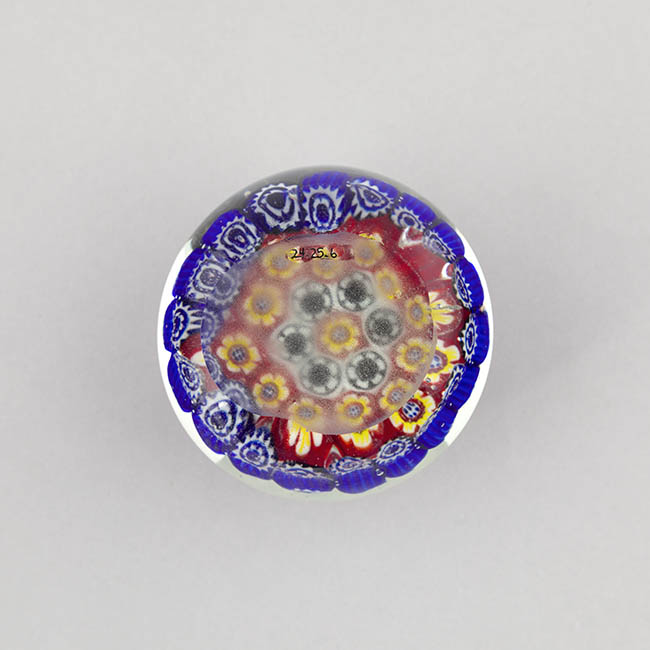 Objeto de uso ornamental y funcional, concebido para sujetar papeles sobre una superficie. Cuerpo de vidrio macizo y transparente con base plana. La composición interna se organiza en anillos concéntricos sobre un fondo rojo opaco. En el centro, un grupo de murrinas con pétalos negros y blancos alrededor de un núcleo amarillo. Este grupo está rodeado por un anillo de murrinas con pétalos amarillos y blancos. El conjunto está enmarcado por un anillo exterior de murrinas azules y blancas.