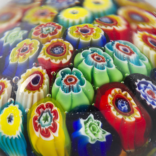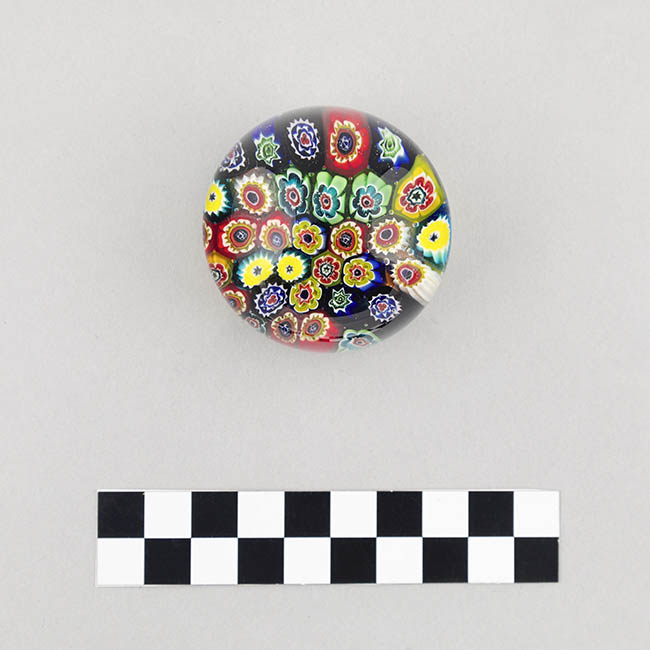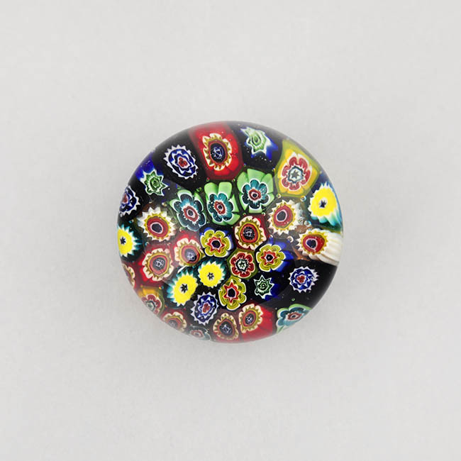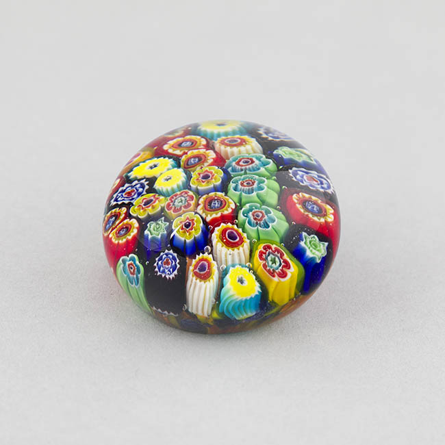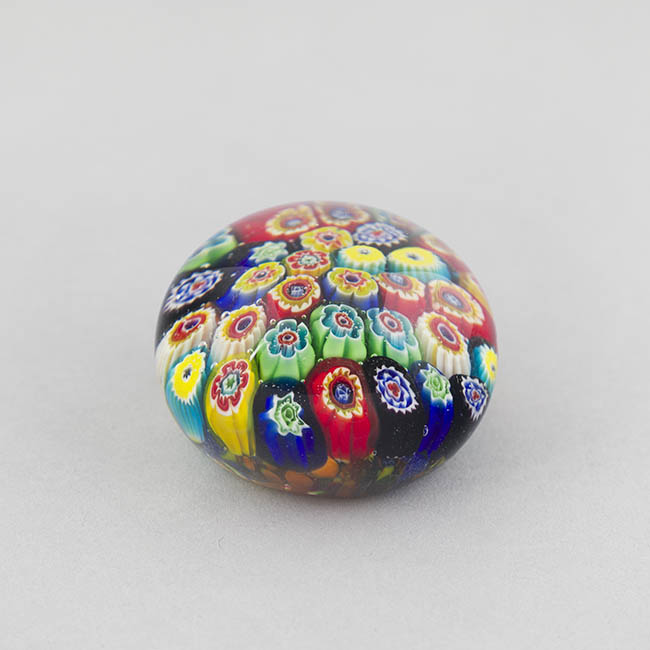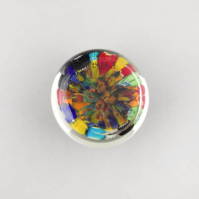 Objeto de uso ornamental y funcional, concebido para sujetar papeles sobre una superficie. Cuerpo de vidrio macizo y transparente con base plana. La decoración interna consiste en una agrupación densa y concéntrica de murrinas sobre un fondo opaco de color azul oscuro. Se distinguen varios anillos de murrinas con diseños y colores variados.