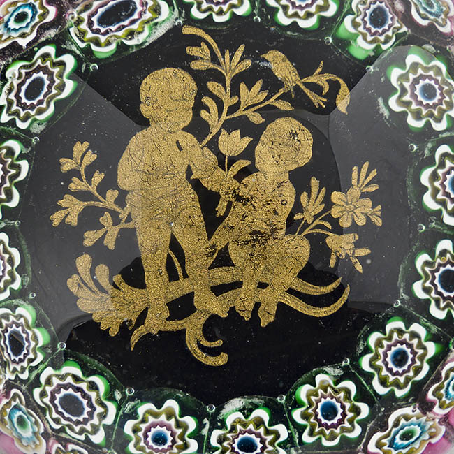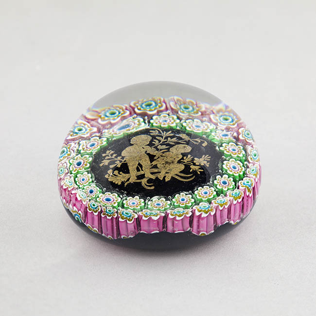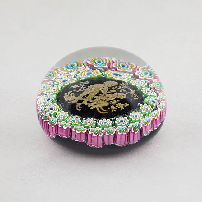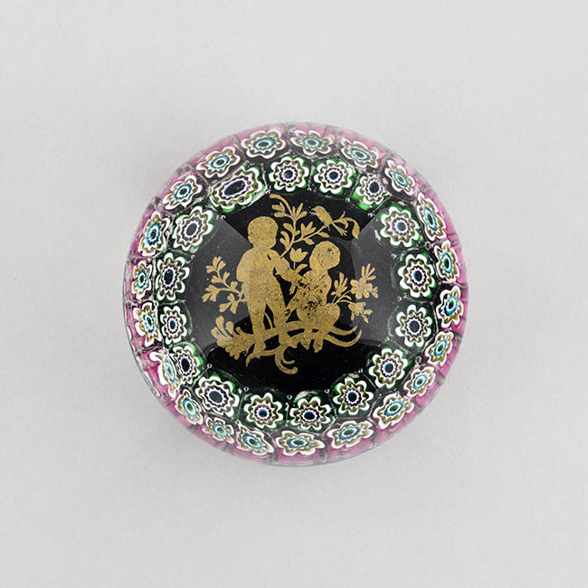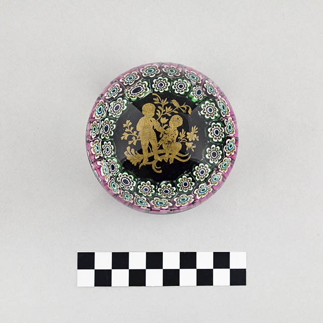 Objeto de uso ornamental y funcional, concebido para sujetar papeles sobre una superficie. Cuerpo de vidrio macizo y transparente con base plana. La decoración interna presenta dos partes diferenciadas: un anillo perimetral compuesto por murrinas sobre una base rosa, con detalles en verde, azul y rojo. El área central consiste en una superficie plana y negra sobre la cual se ha aplicado una escena con dos figuras antropomorfas en color dorado.