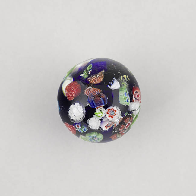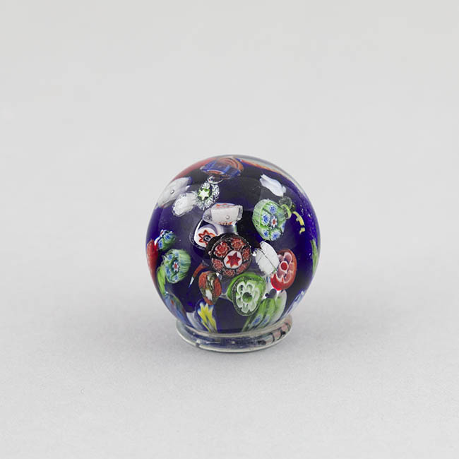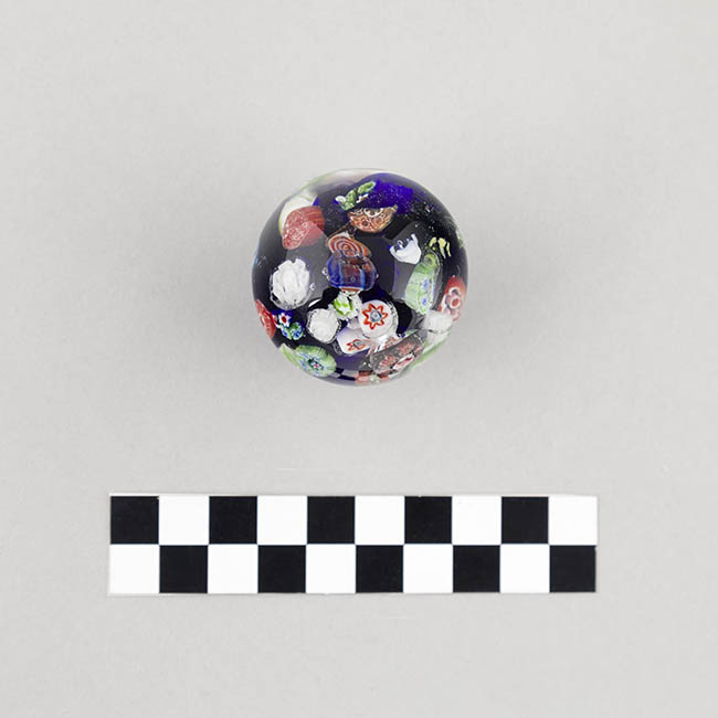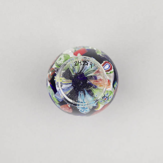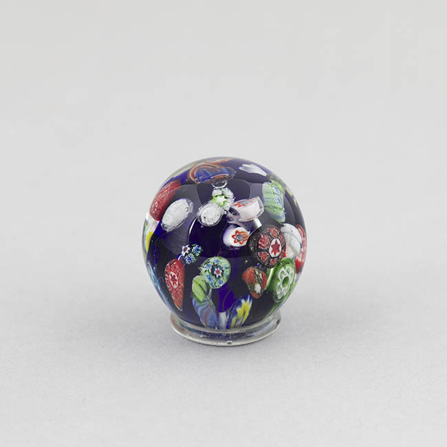 Objeto de uso ornamental y funcional, concebido para sujetar papeles sobre una superficie. Cuerpo de vidrio macizo y transparente con base plana. La decoración interna se compone de una dispersión de murrinas de gran variedad de formas y colores sobre un fondo de vidrio de color azul oscuro. Algunas murrinas presentan diseños complejos, junto a otras de patrones florales y geométricos.
