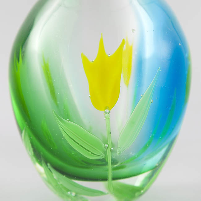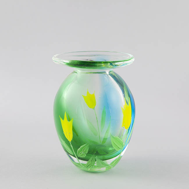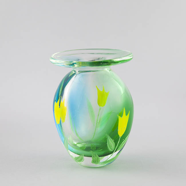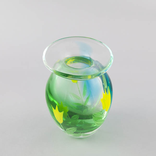 Contenedor de uso doméstico ornamental destinado para poner flores. El objeto presenta un cuerpo globular que se estrecha hacia un cuello corto y una boca circular y base plana.El cuerpo es de un color verdoso translúcido que se mezcla con secciones transparentes. La decoración contiene elementos fitomorfos color amarillo acompañados de trazos verticales. También se aprecian burbujas de aire distribuidas de manera irregular en el vidrio.