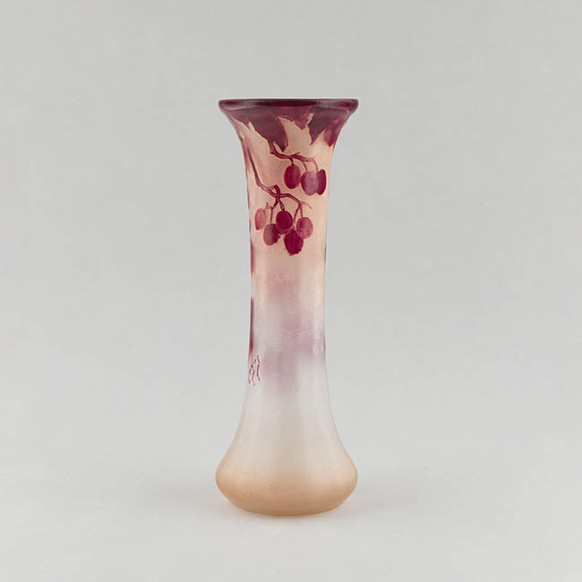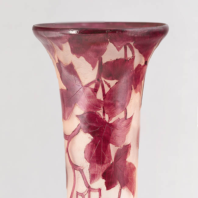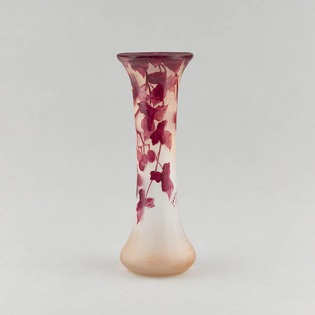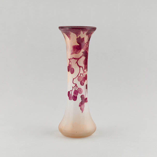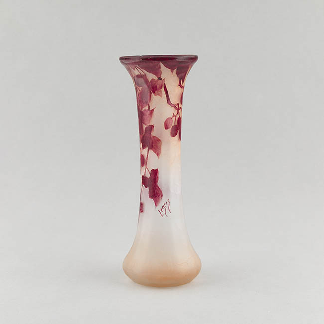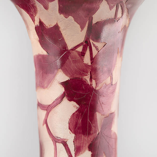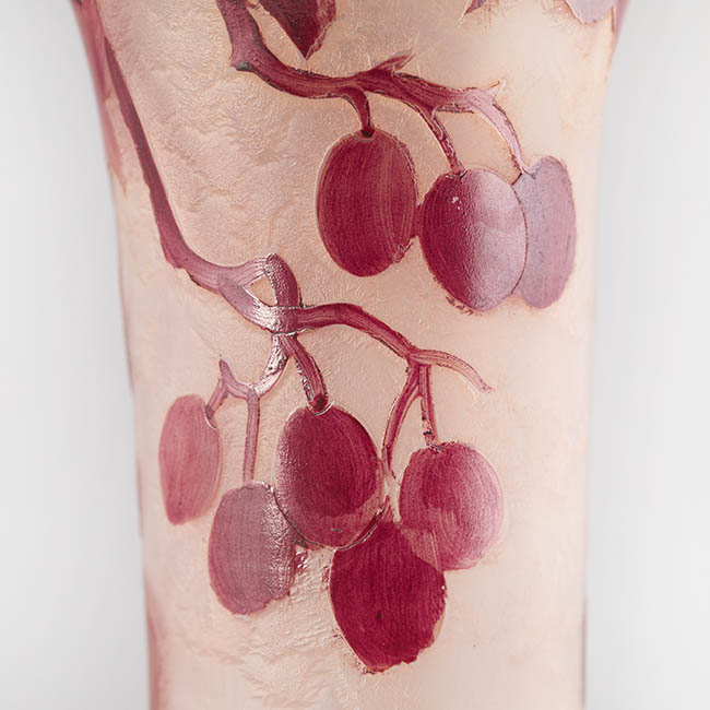 Contenedor de uso doméstico ornamental destinado para poner flores. El recipiente tiene un cuerpo de alto y esbelto con la sección inferior de forma globular que se estrecha y abre hacia la boca. La superficie tiene un acabado mate con decoración fitomorfa en relieve en color rojizo.
