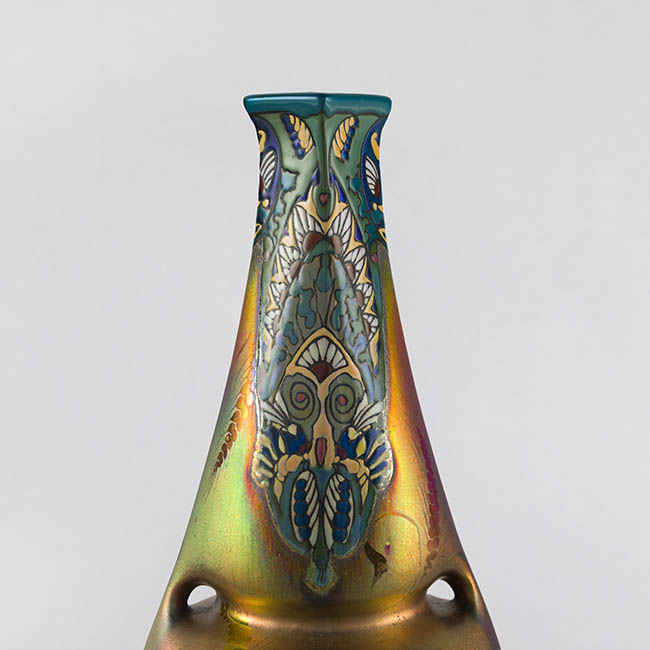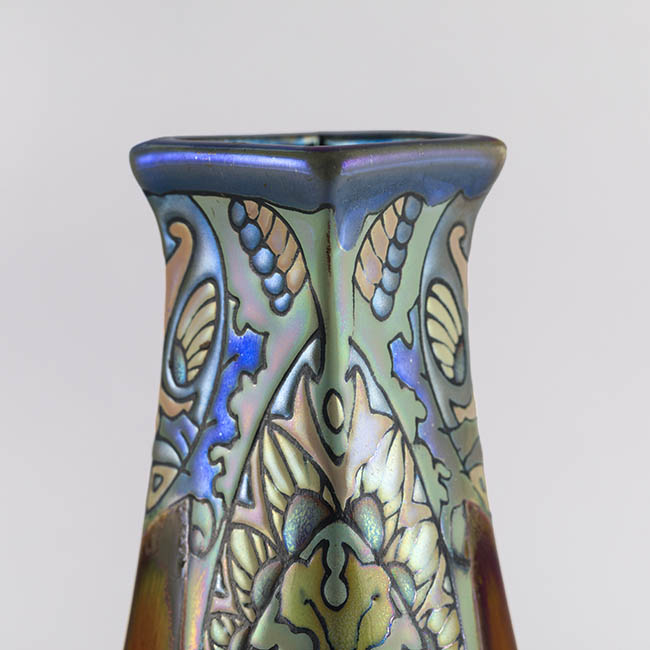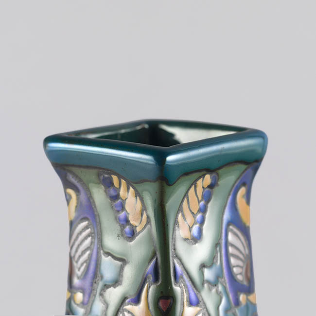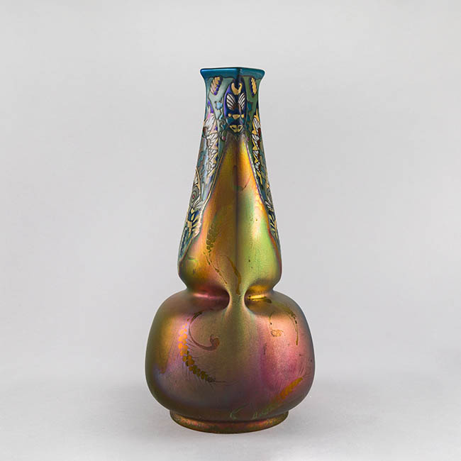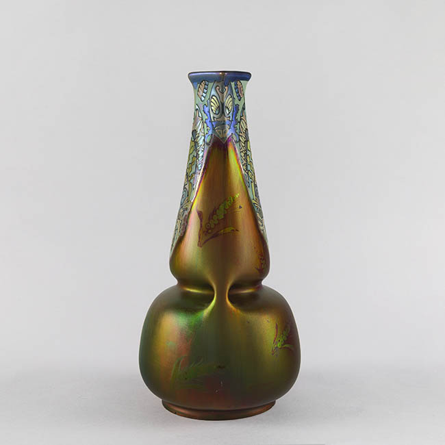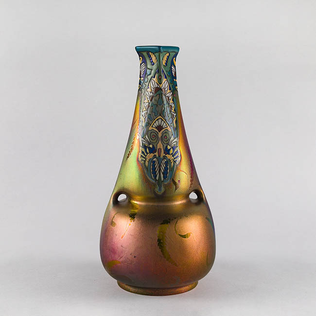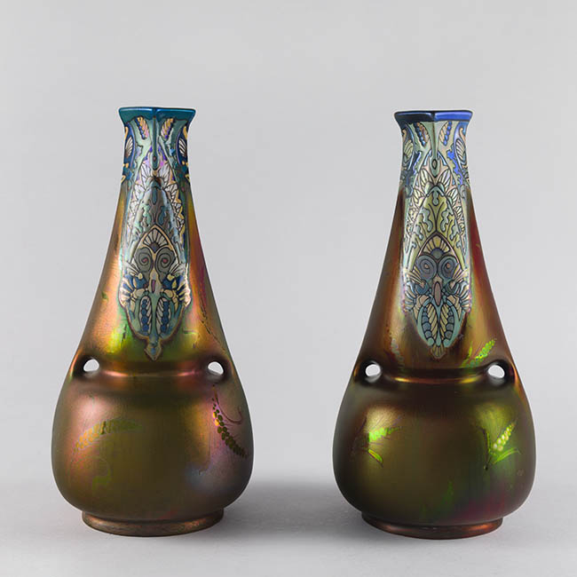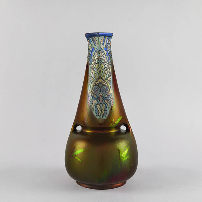 Contenedores de uso doméstico ornamental, de forma troncocónica de base globular, cuello alto y boca estrecha de contorno cuadrangular. En el centro presenta dos asas caladas. El cuerpo está recubierto por un esmalte de lustre metálico con iridiscencias. El cuello tiene una decoración esmaltada en relieve con motivos fitomorfos.