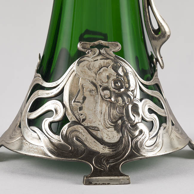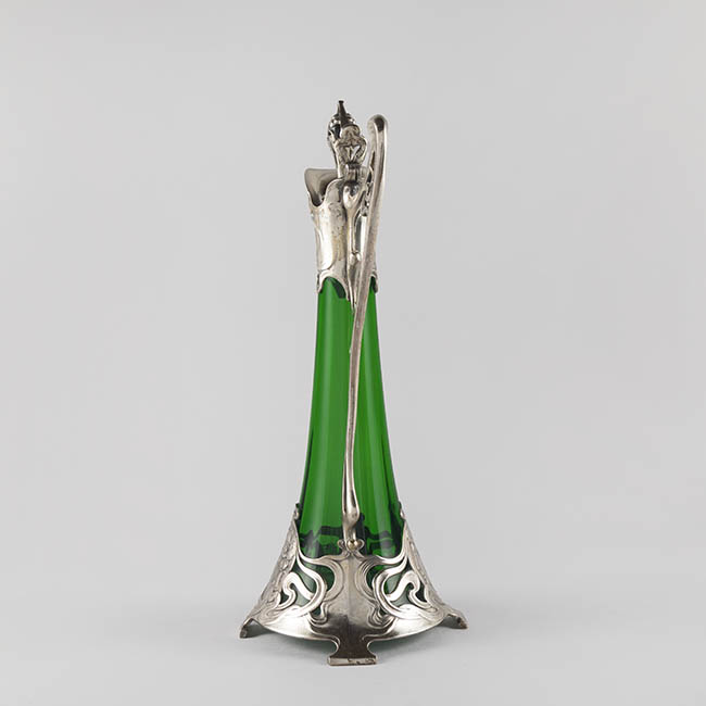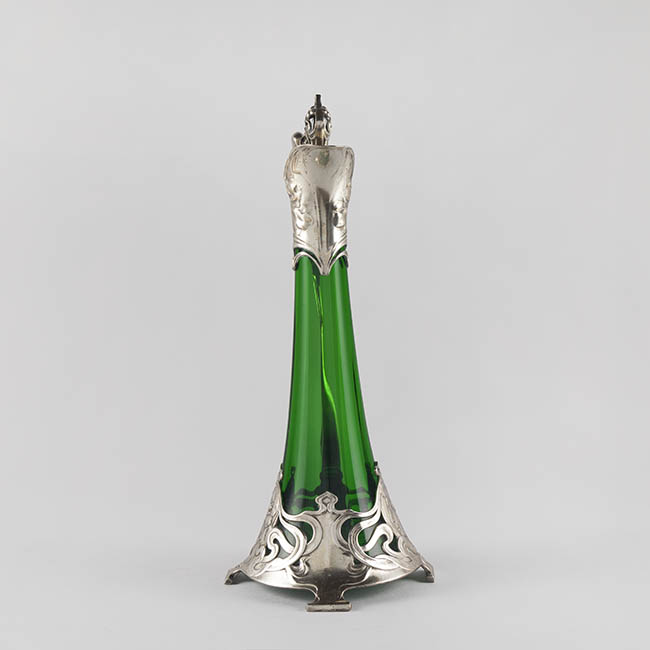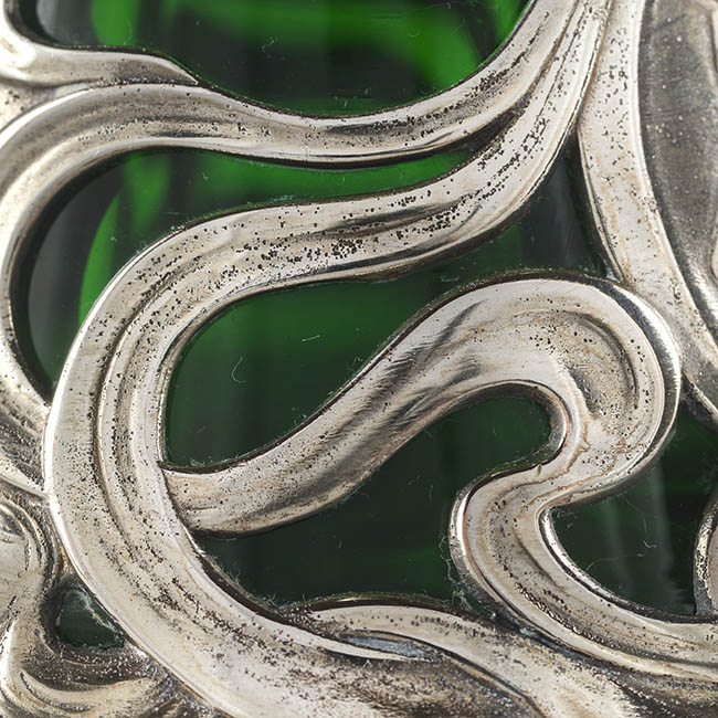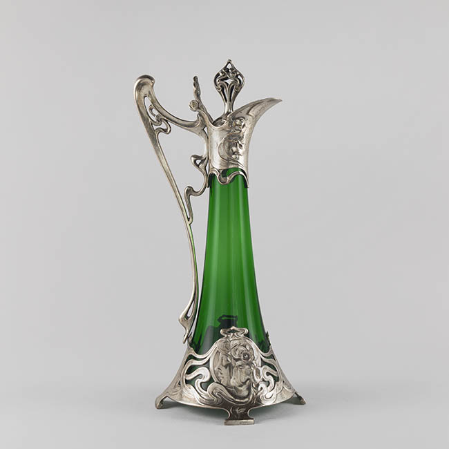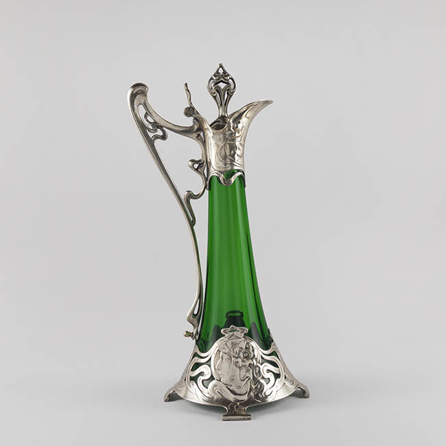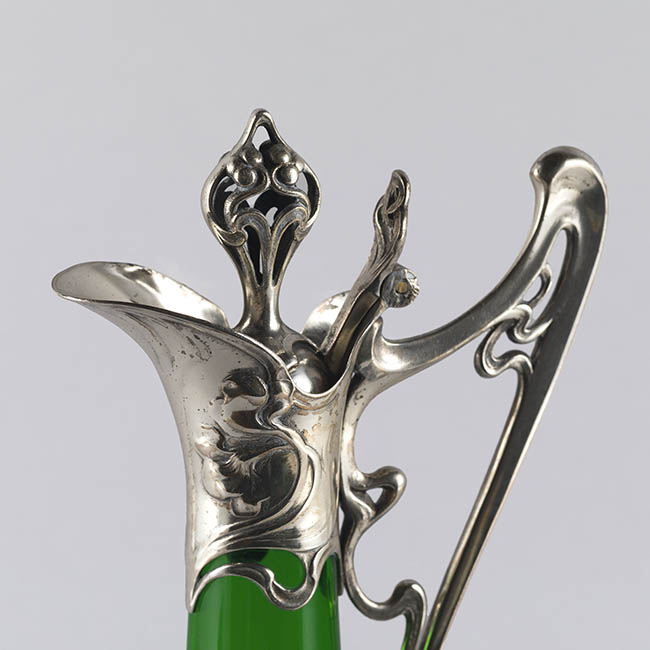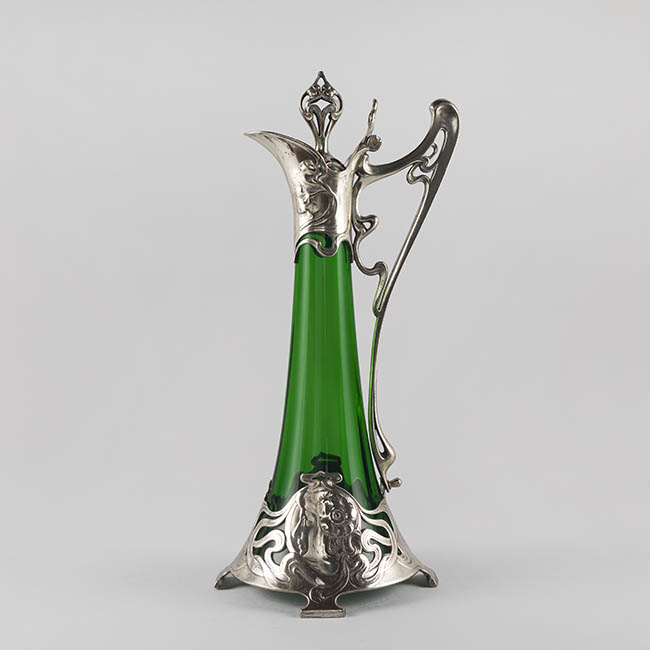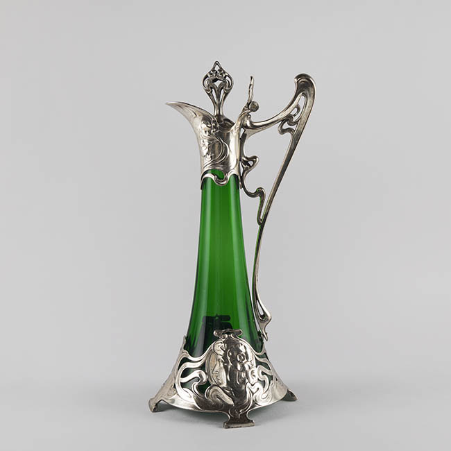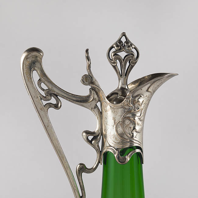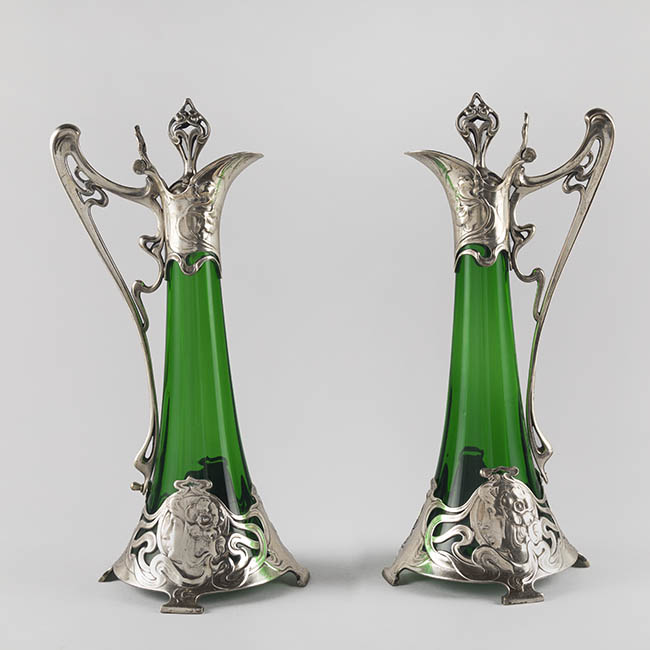 Par de contenedores para servir líquidos de uso doméstico ornamental. Los objetos presentan una base circular que se eleva en un cuerpo de forma cónica invertida, y un cuello estrecho que se abre en una boca en forma de vertedero Tienen un asa lateral y una tapa con una protuberancia decorativa en la parte superior. El cuerpo es de vidrio esmeralda translúcido y homogéneo. La decoración consiste en una montura de metal plateado ornamentado en la base, cuello, vertedor, asa y tapa. La montura presenta patrones complejos con elementos fitomorfos, incluyendo relieves qen la base de la montura.