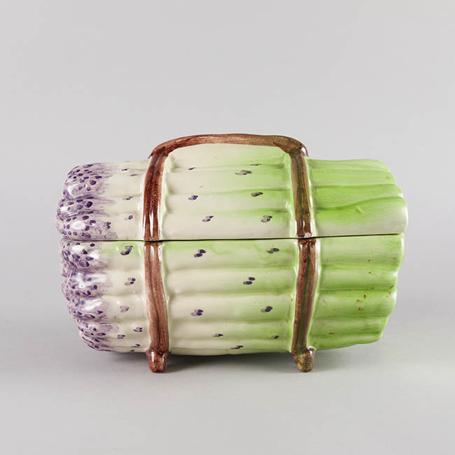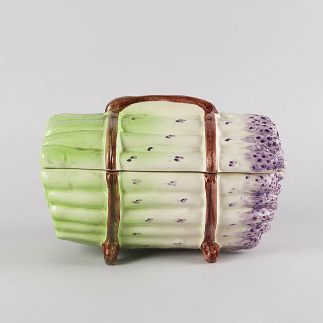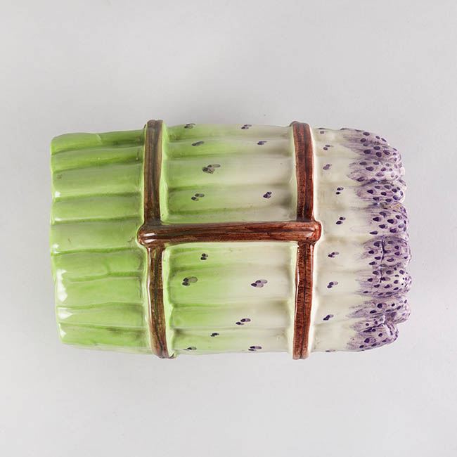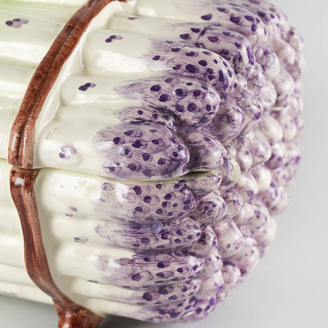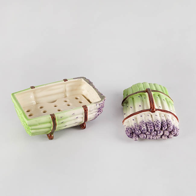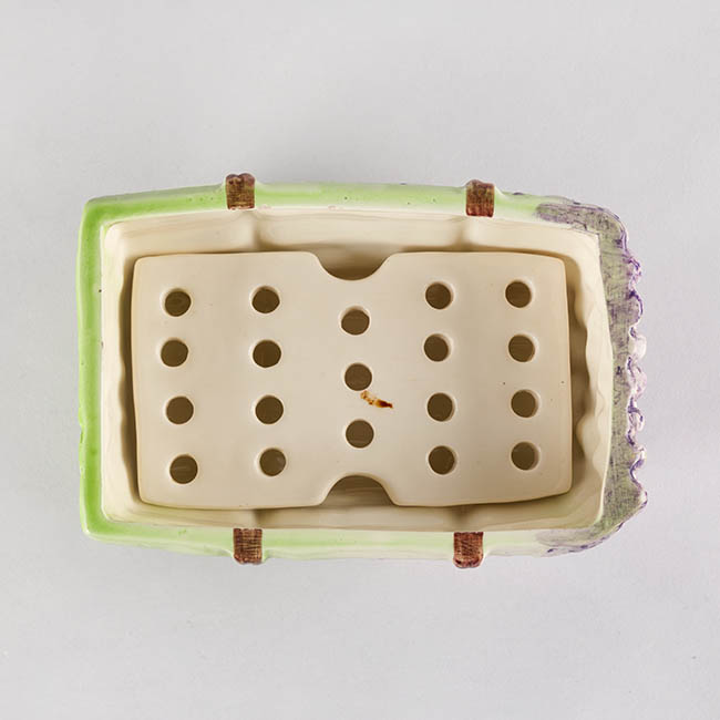 La pieza está elaborada en cerámica vidriada. Su superficie exterior presenta modelado en altorrelieve continuo, con elementos tubulares paralelos y tres bandas transversales que los agrupan visualmente. La policromía exterior emplea una gama de tonos de verde, con áreas blanquecinas y aplicaciones puntuales en tono púrpura. Las bandas transversales están destacadas en color marrón. El acabado es brillante. El interior es liso, de color marfil, con superficie esmaltada brillante, al igual que la bandeja interna.