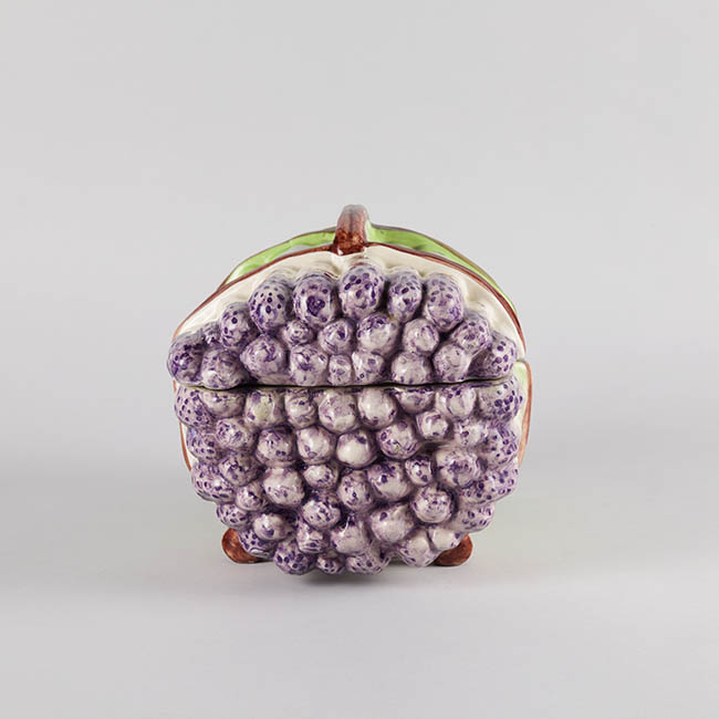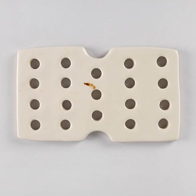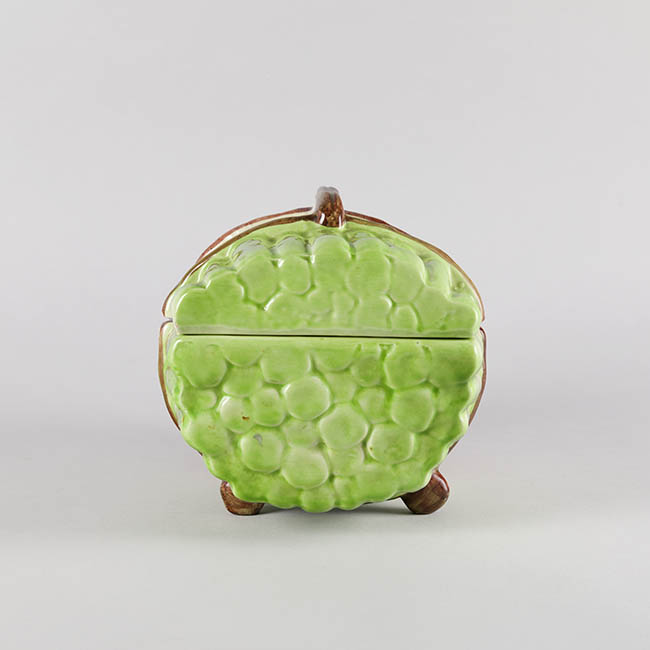Contenedor doméstico ornamental compuesto por dos partes encajables: una base y una tapa. La estructura general es horizontal, de planta ovalada y con apoyo en cuatro pequeños pies. La base presenta paredes ligeramente curvas y un interior hueco, donde se ubica una bandeja removible con perforaciones circulares regulares. La tapa se ajusta sobre la ba. Tiene superficie modelada en relieve y líneas longitudinales marcadas.