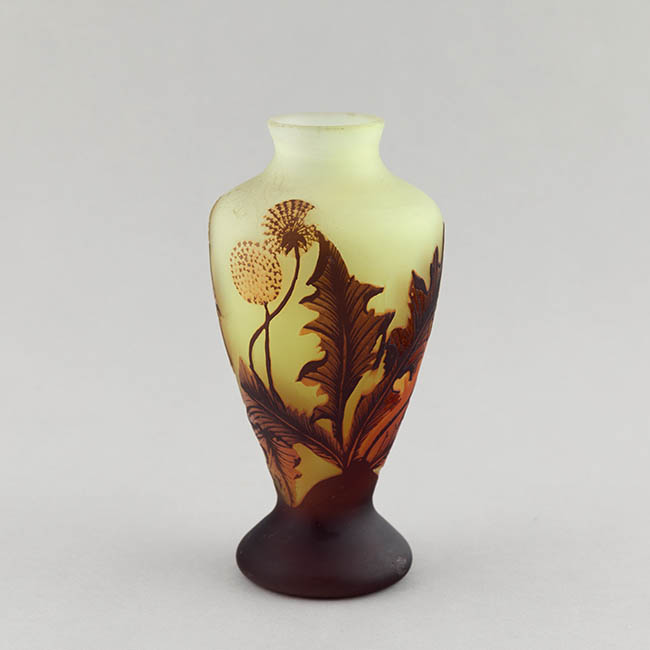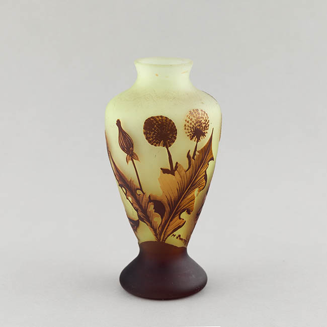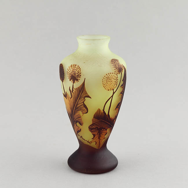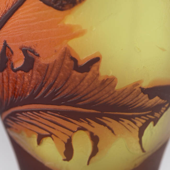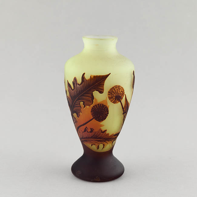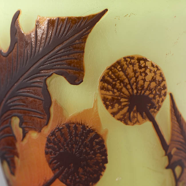 Contenedor de uso doméstico ornamental destinado para poner flores, se compone de una base circular de color marrón oscuro, un cuerpo cónico que se ensancha hacia arriba y un cuello corto. La capa interna del vidrio es de color amarillo verdoso con acabado mate. Las capas externas son de color naranja y marrón. La decoración es externa, fitomorfa y en altorrelieve, representando un motivo fitomorfo.