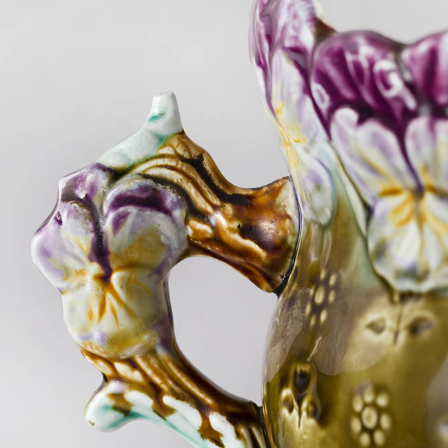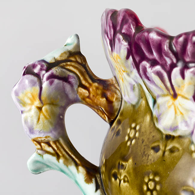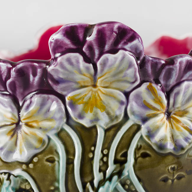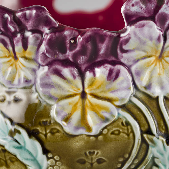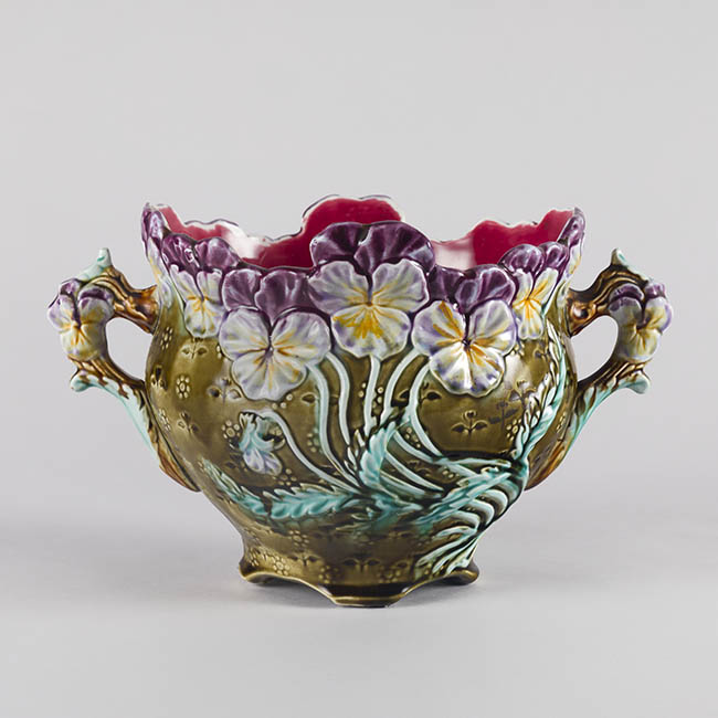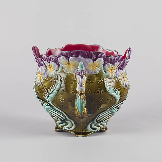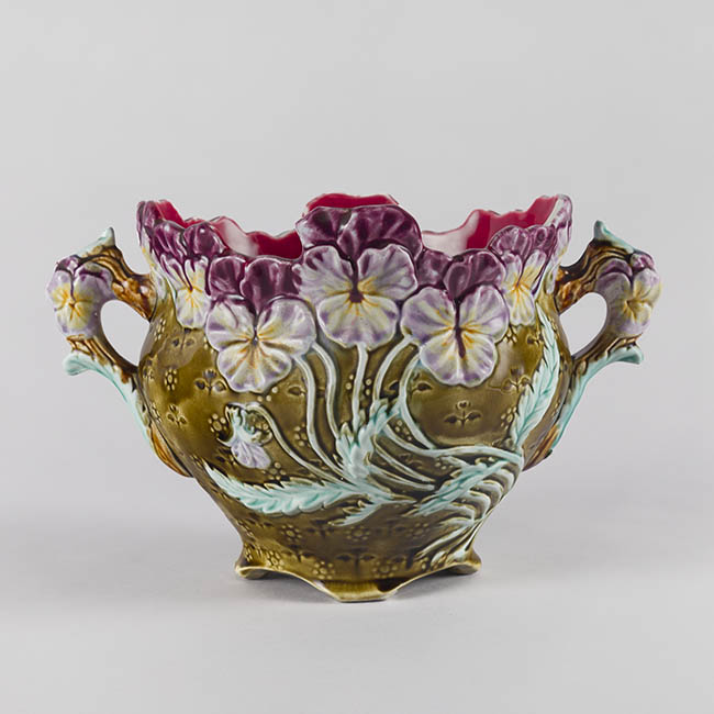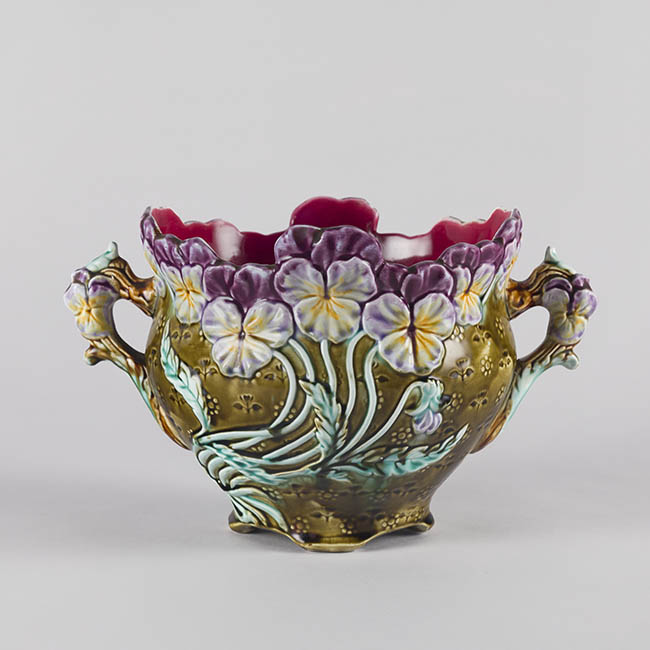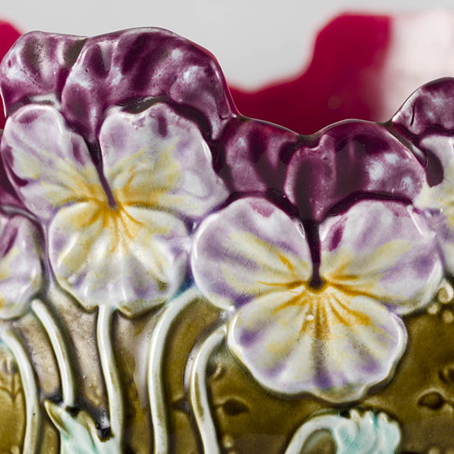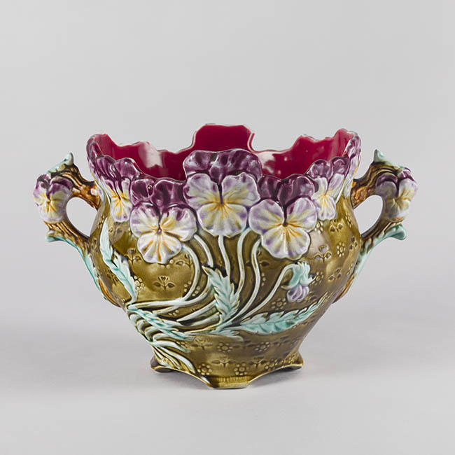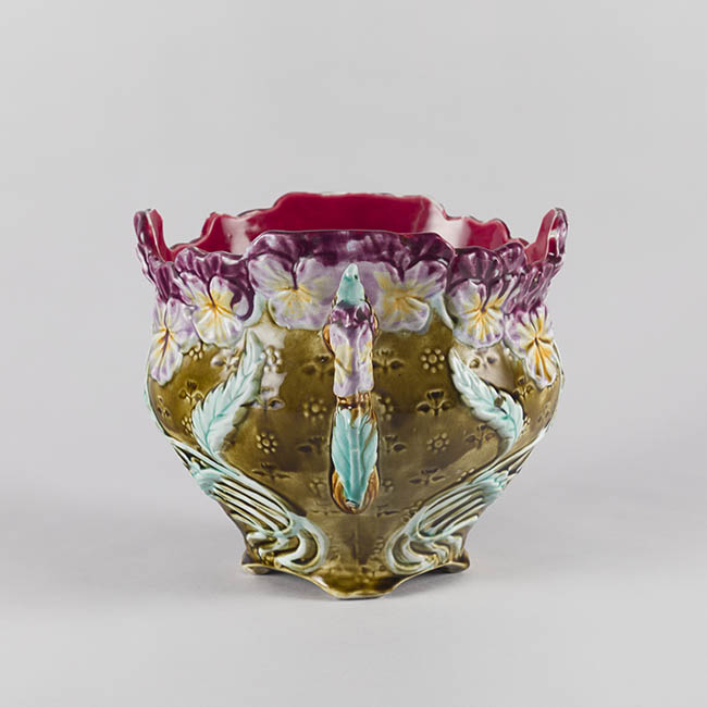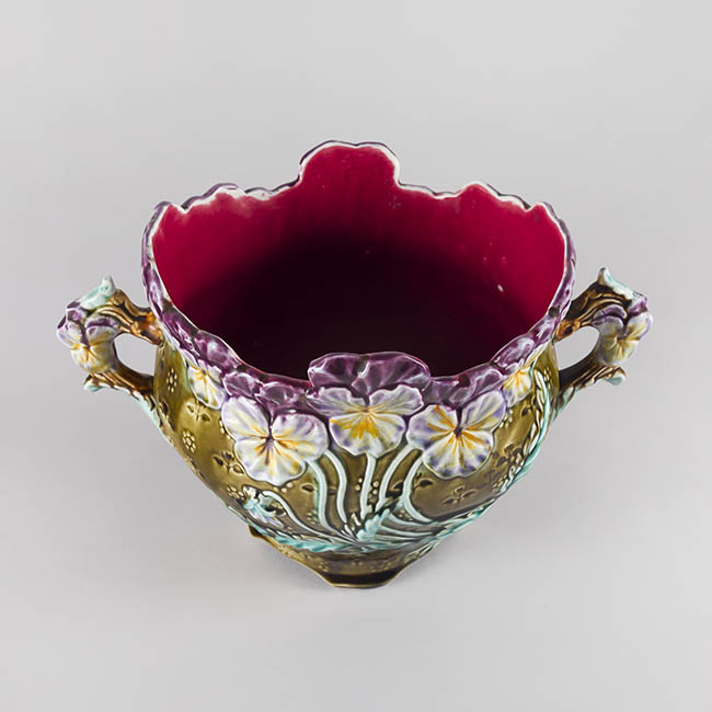 Par de contenedores de uso doméstico para plantas, de base de cuadrada que se abre a un cuerpo globular y de perfil sinuoso. Posee dos asas laterales elaboradas, con formas vegetales. El interior está esmaltado en un color magenta liso. La decoración es en altorrelieve, de tipo fitomorfo, cubriendo el cuerpo y las asas.