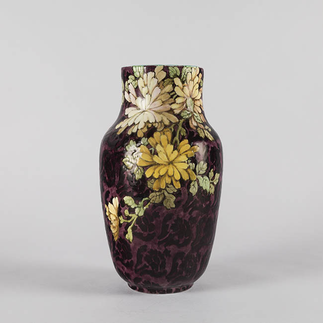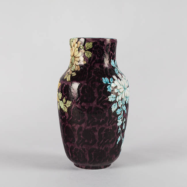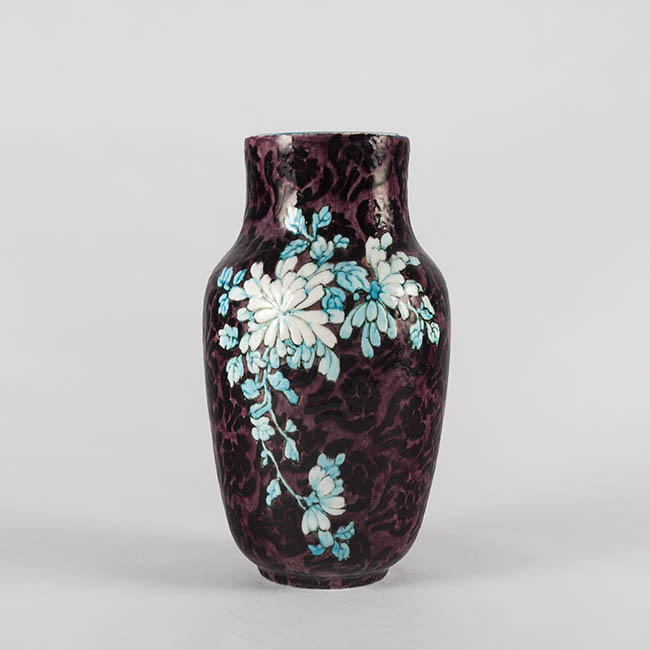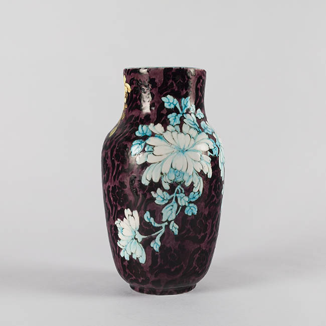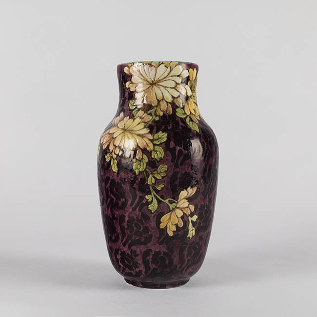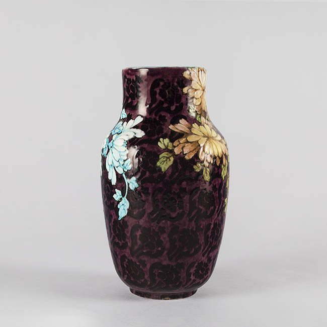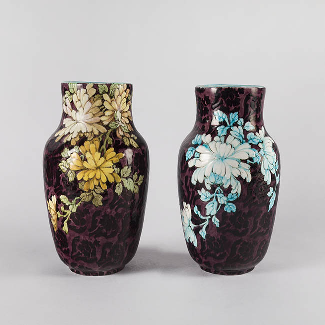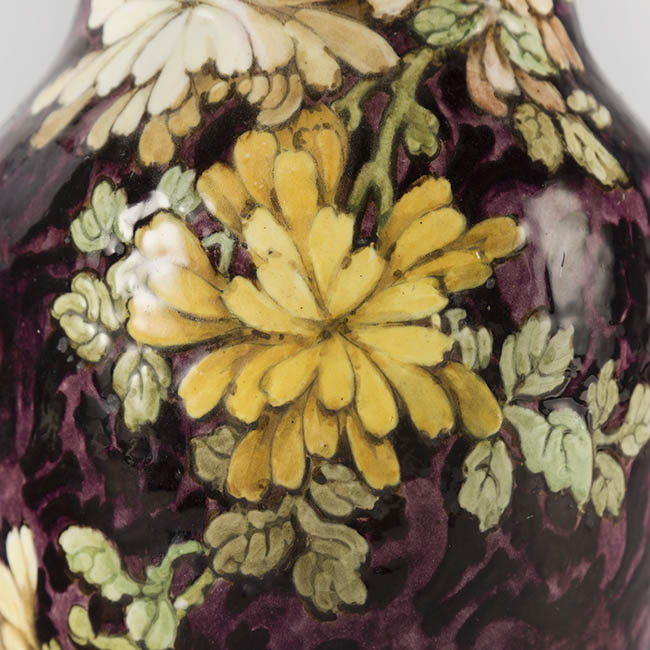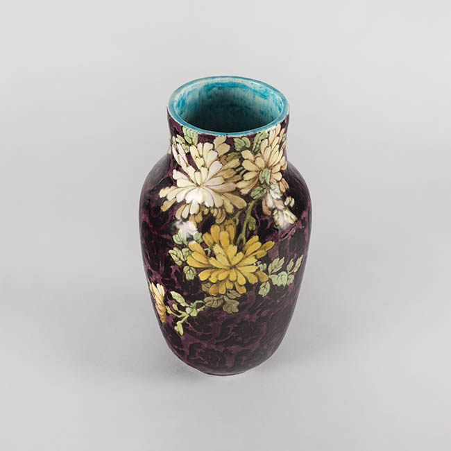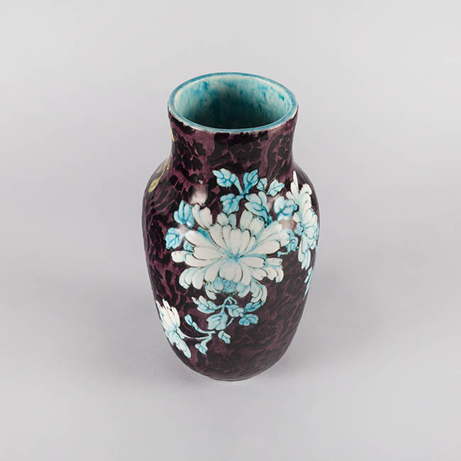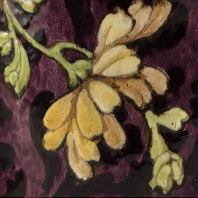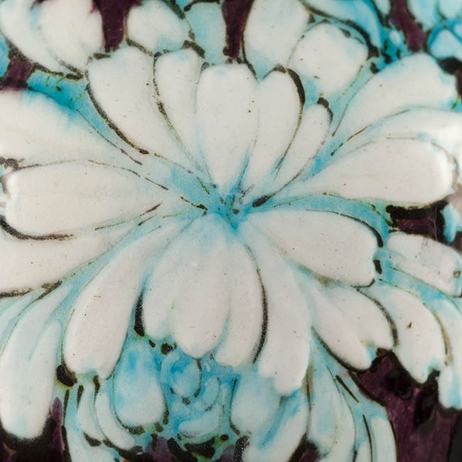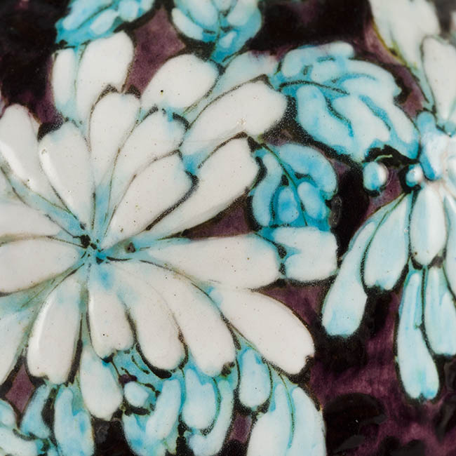 La superficie exterior está cubierta por una capa vidriada de acabado brillante, con fondo de tonalidad oscura y pintura superpuesta que conforma un patrón orgánico repetido. Sobre este fondo se tiene una decoración aplicada de forma asimétrica en torno al cuerpo, compuesta por conjuntos de elementos vegetales estilizados que se despliegan vertical y diagonalmente. El interior de cada objeto tiene un vidriado liso de tono turquesa.