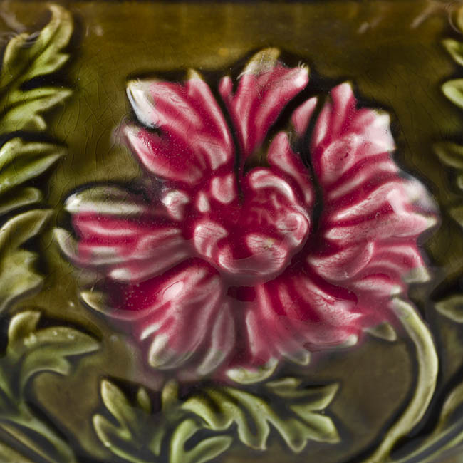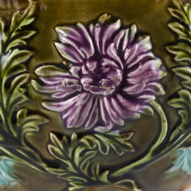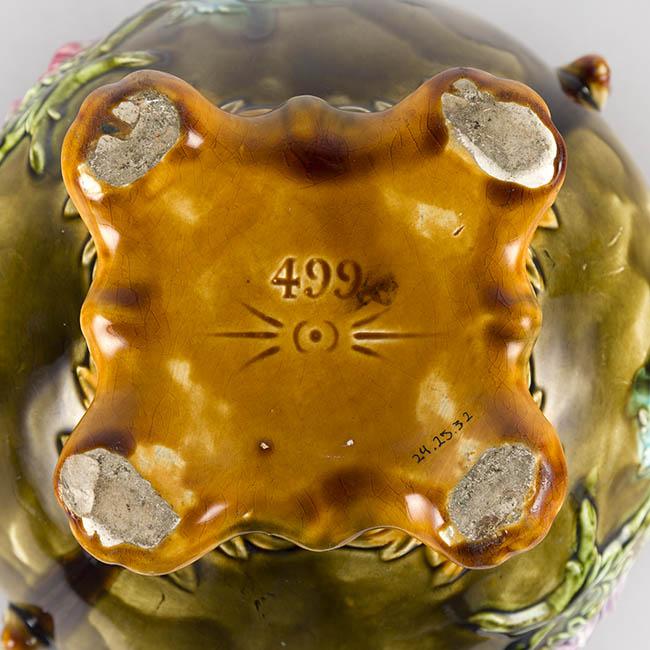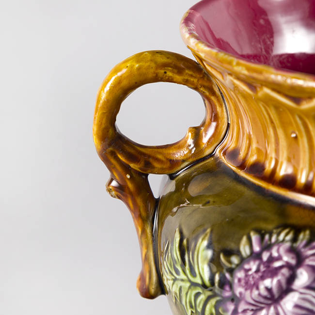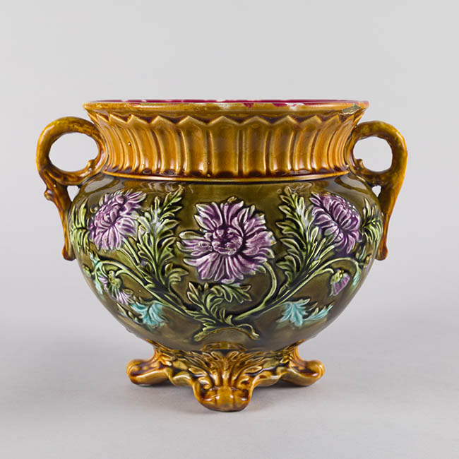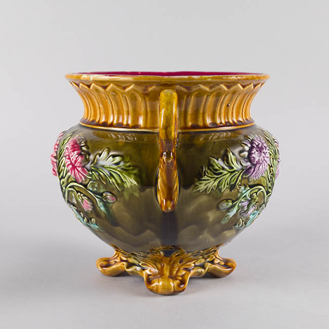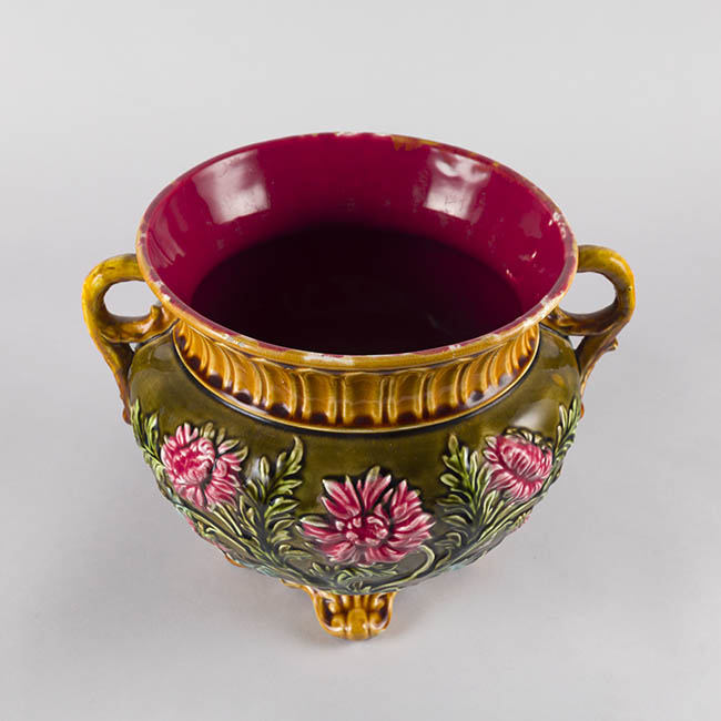 Contenedor de uso doméstico para plantas, con cuerpo de forma globular y dos asas anulares laterales y base con tres pies en forma de voluta. El cuello es ancho, con un borde evertido. El interior está esmaltado en un color rojizo. El cuello está decorado con acanaladuras verticales bajo un esmalte marrón. El cuerpo presenta una decoración en relieve de grandes flores.