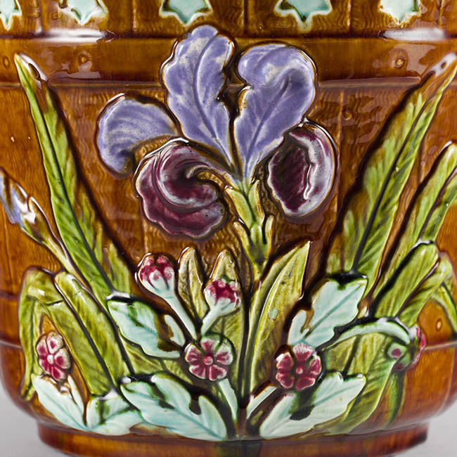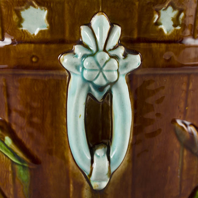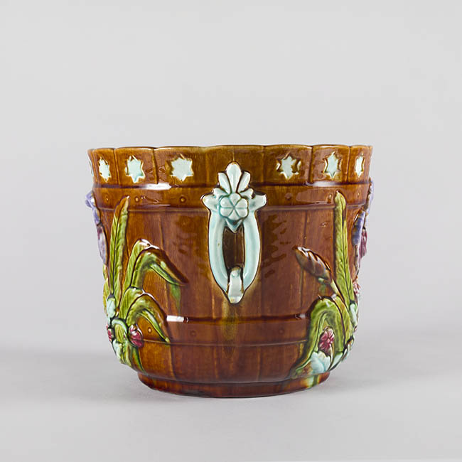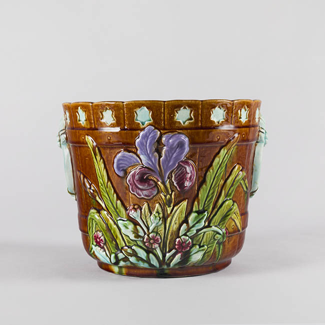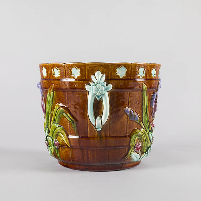 Contenedor cerámico de uso doméstico destinado para plantas. Presenta cuerpo de forma cilíndrica ligeramente abierta hacia la boca, con paredes verticales y borde superior recortado. En los laterales incorpora dos piezas aplicadas a modo de asas ornamentales, compuestas por un aro suspendido de un motivo floral en relieve. La superficie exterior tiene un acabado vidriado brillante en tonalidades marrón y ocre.