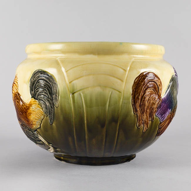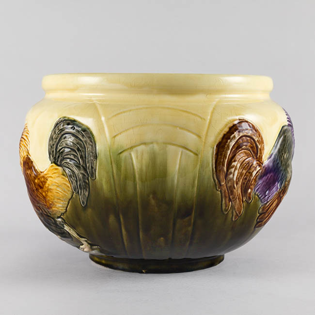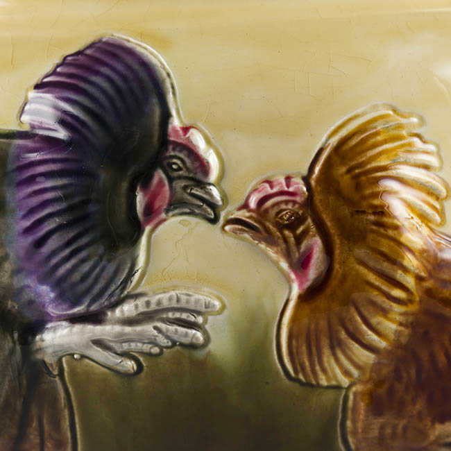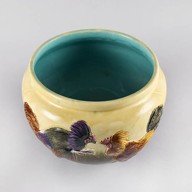 Contenedor de uso doméstico ornamental destinado para uso decorativo o como macetero. El objeto presenta un cuerpo globular que se abre en una boca circular y tiene una base plana. El cuerpo es de cerámica esmaltada con un fondo en tonos beige y marrones. La decoración contiene elementos ornitomorfos, que representan a dos gallos enfrentados, uno con un plumaje de tonos marrón y anaranjado y el otro con plumaje en tonos morados y azules oscuros. El diseño es tridimensional, con los relieves de los gallos que sobresalen de la superficie. Acabado brillante.