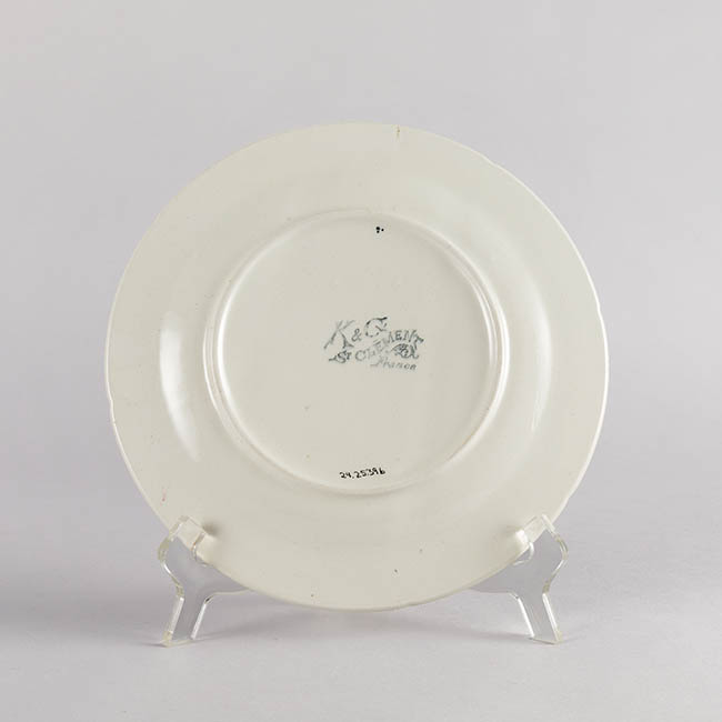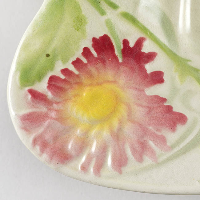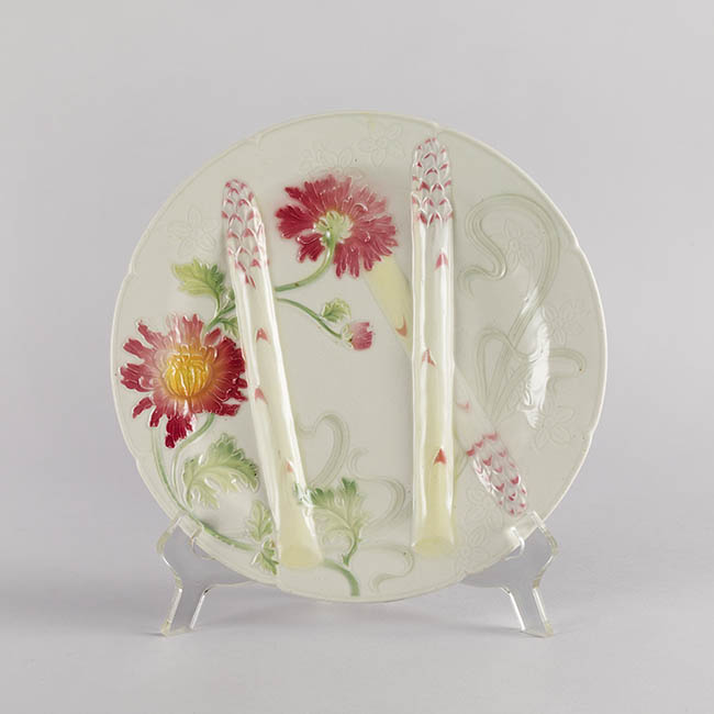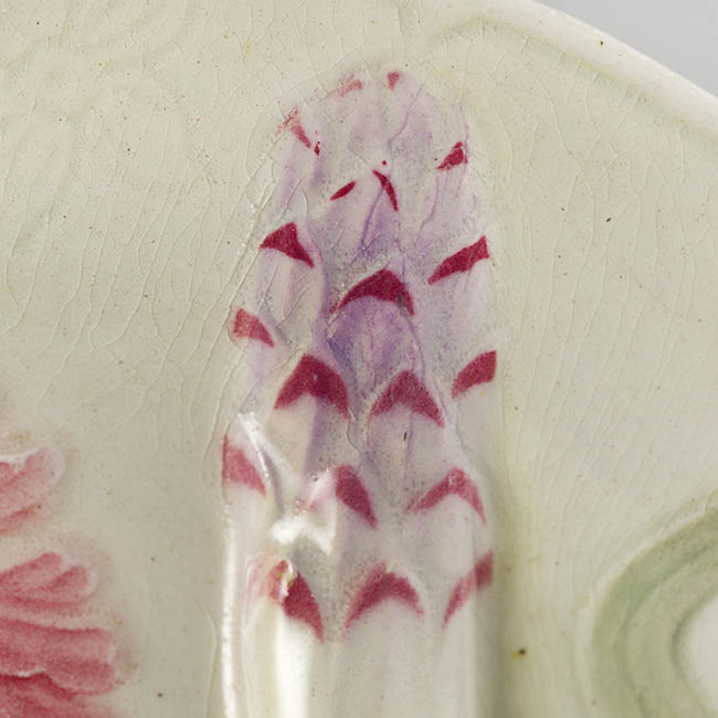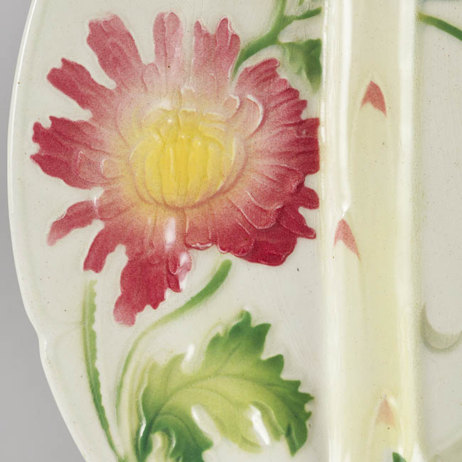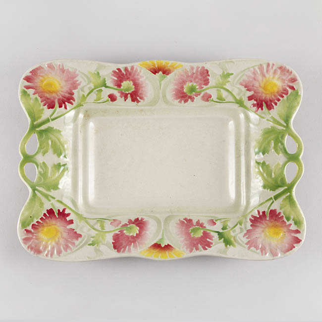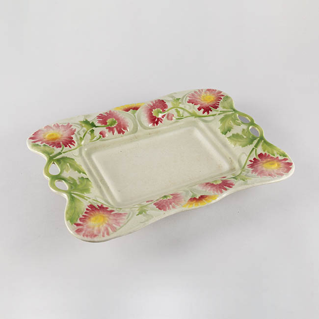 Contenedores de uso doméstico ornamental destinados para servir alimentos o como pieza decorativa. Conjunto compuesto por dos tipos de onejtos, uno de ellos tiene una forma rectangular con los bordes redondeados y ondulados, y un área central cóncava y lisa. La decoración contiene elementos fitomorfos en tonos rosados y amarillos con centros amarillos que forman un marco alrededor de la zona central. Los otros once objetos presentan una forma circular con un borde ligeramente ondulado y una superficie cóncava. La decoración contiene elementos fitomorfos, incluyendo dos figuras tridimensionales cilíndricos de color blanco con puntas moradas, colocadas en paralelo sobre la superficie del plato. A su alrededor, se aprecian flores con pétalos rosados y centros amarillos, acompañadas de hojas verdes.