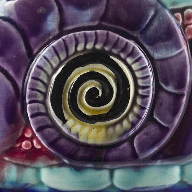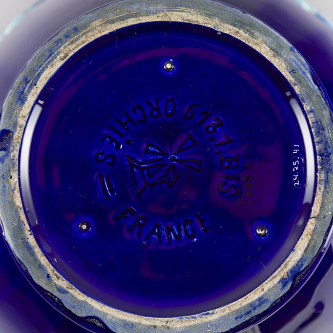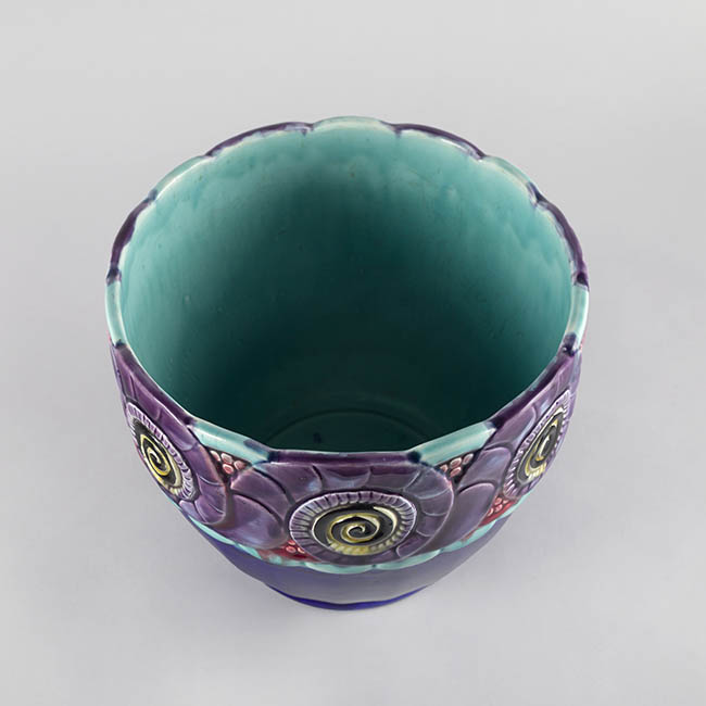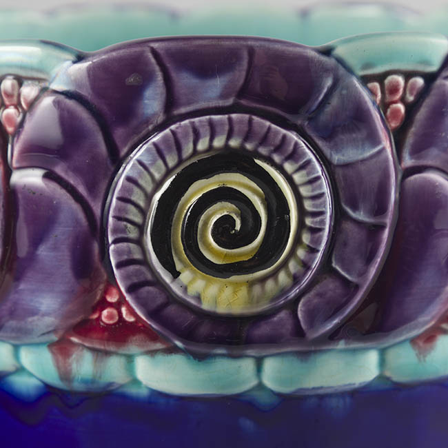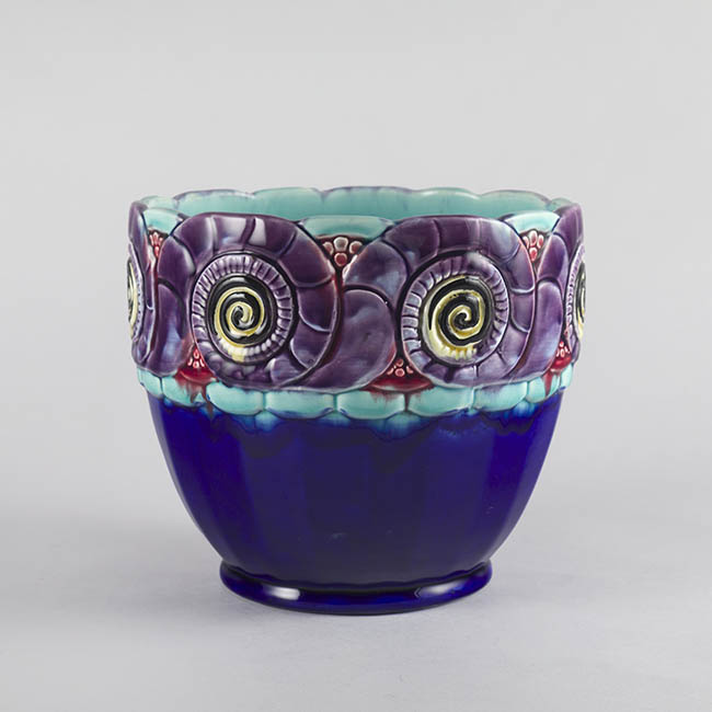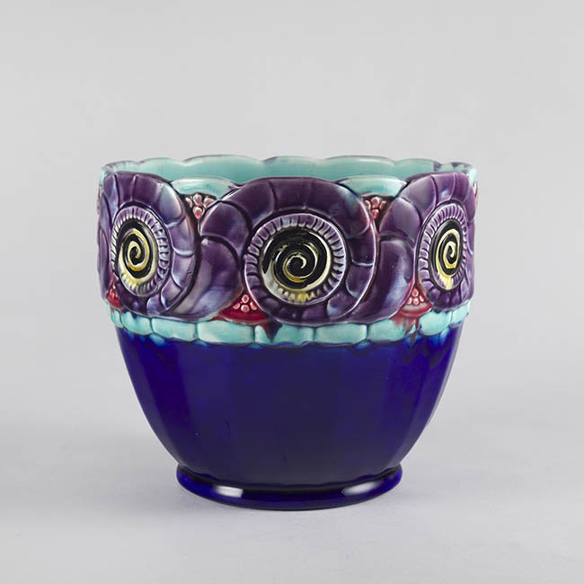 Contenedor de uso doméstico ornamental destinado para uso decorativo o como macetero. El objeto presenta un cuerpo con forma , una boca ancha con el borde ondulado y una base circular. La parte inferior es de color azul oscuro, lisa y con facetas en forma de polígono. La parte superior está decorada con un friso en relieve de elementos fitomorfos y espirales.