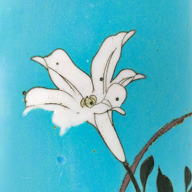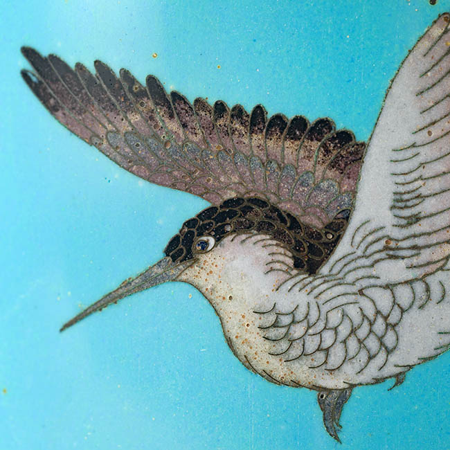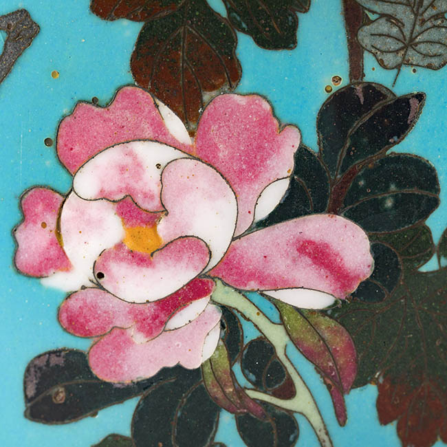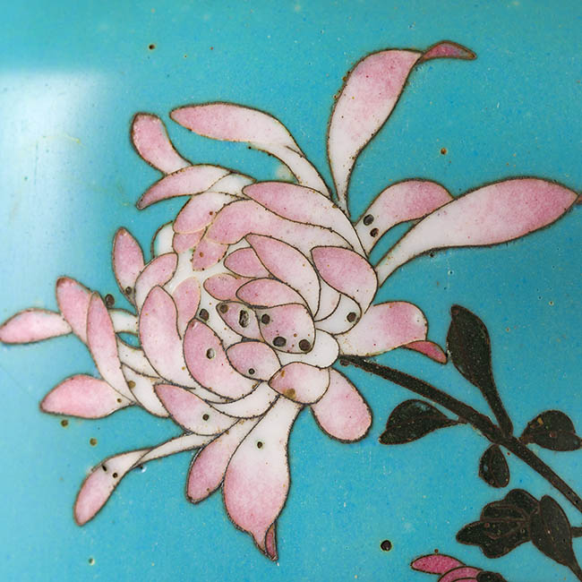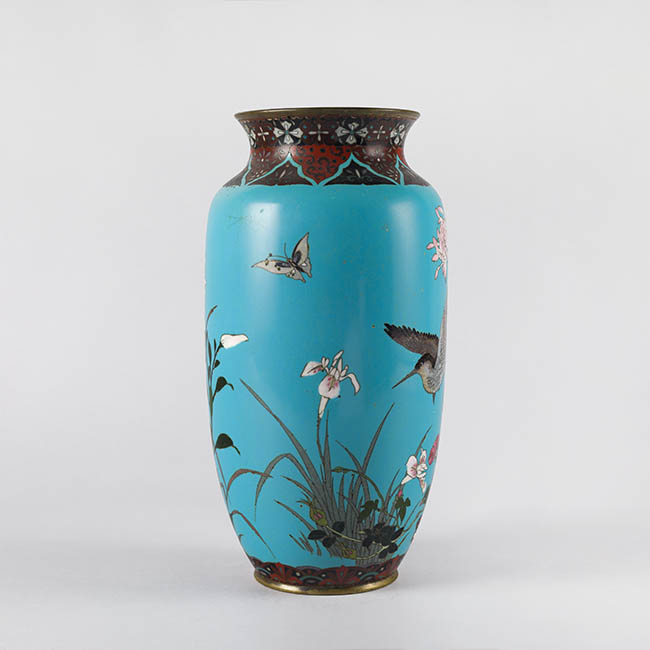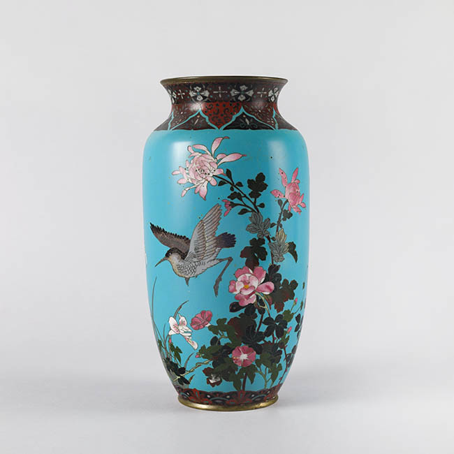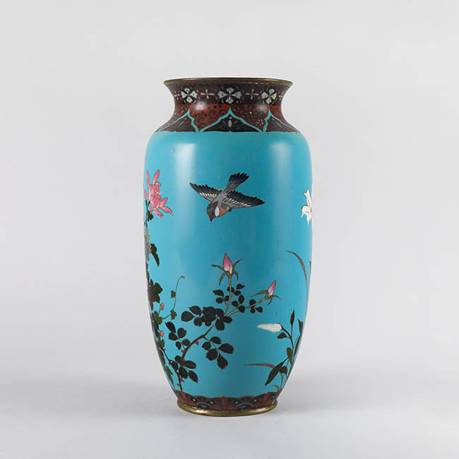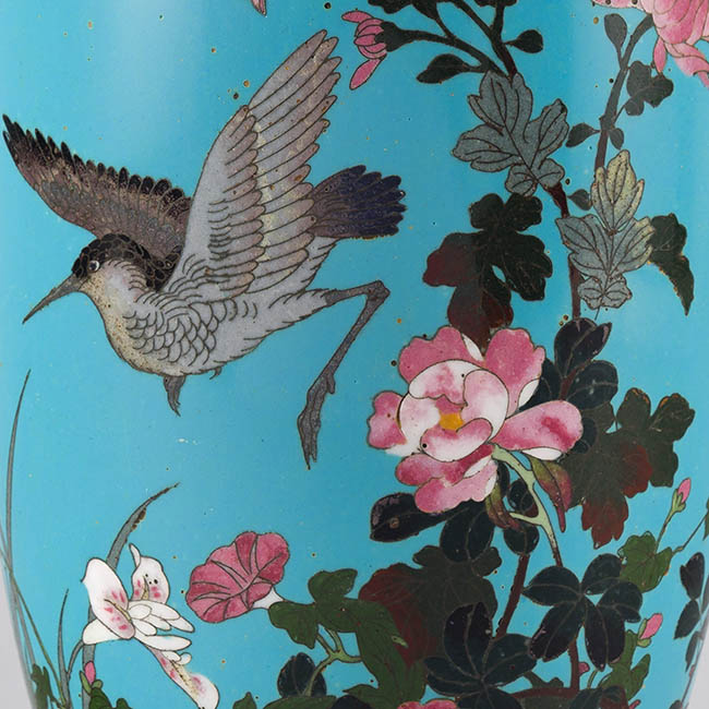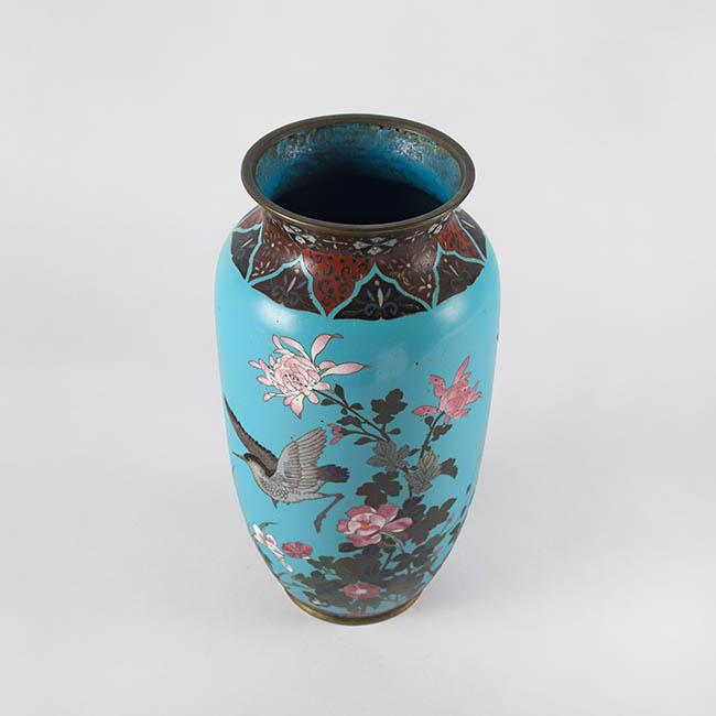 Contenedor de uso ornamental. El objeto tiene un cuerpo de perfil curvo con una base y cuello de boca evertida. La decoración es en base a un motivo continuo con decoración fitomorfa y ornitomorfa de color rosa, verde y ocres sobre una base color turquesa.