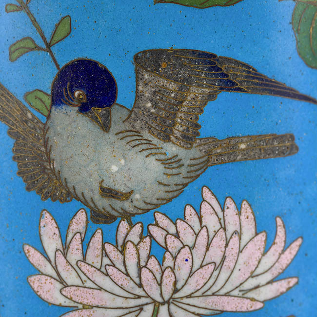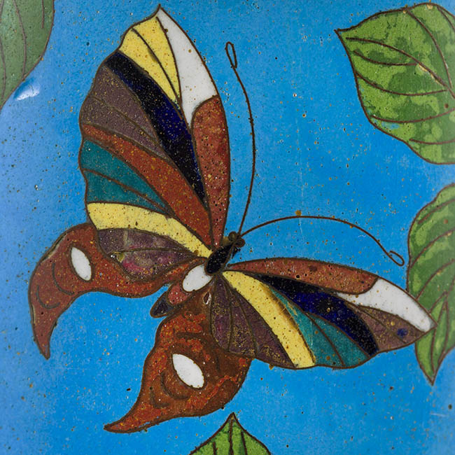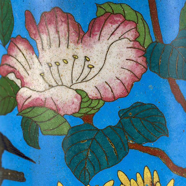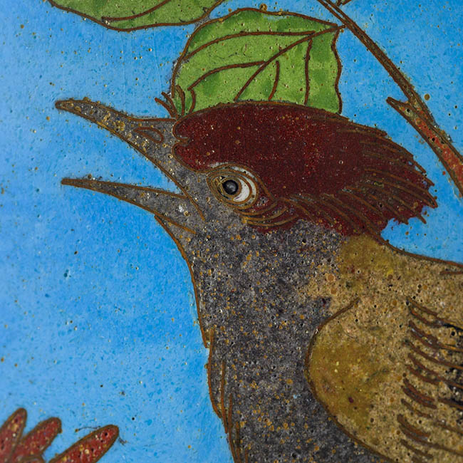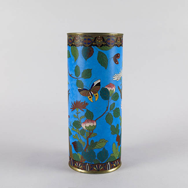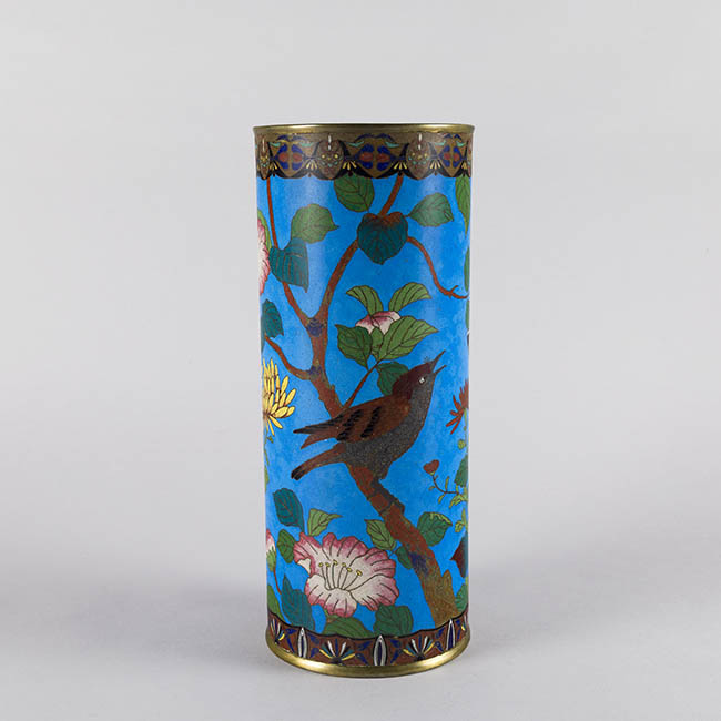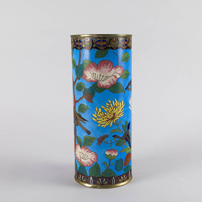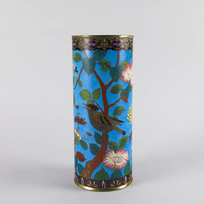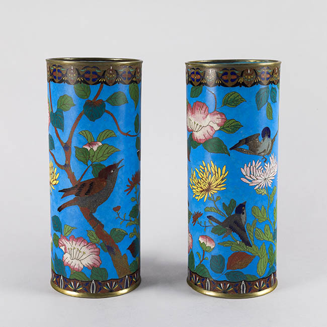 Pareja de contenedeores de uso ornamental. Presentan forma cilindrica con extremos metálicos. La decoración se basa en motivos fito y ornitomorfo. La paleta cromática es en tonos turquesa, verde, rosa y blanco.