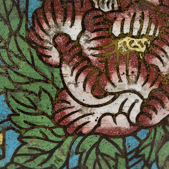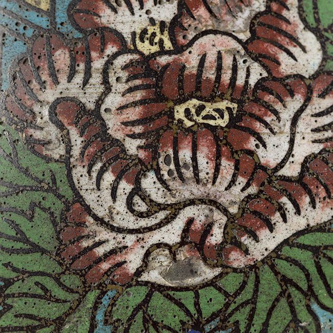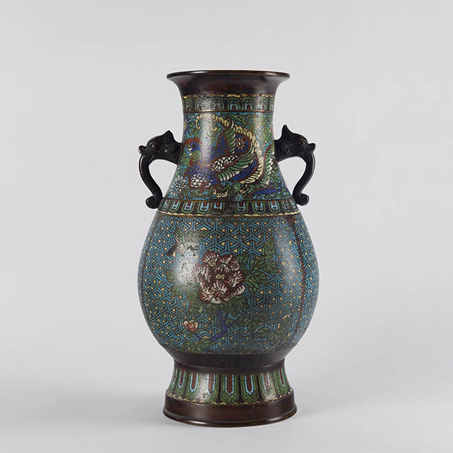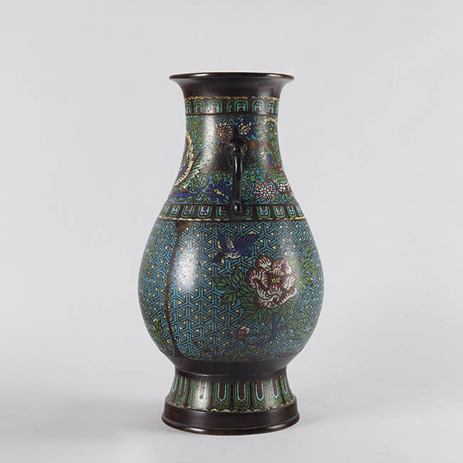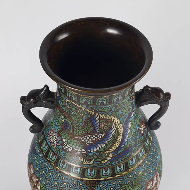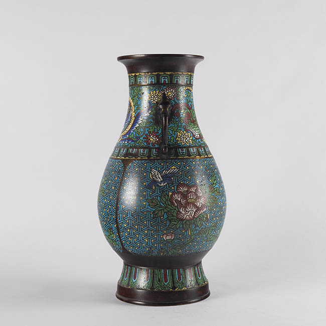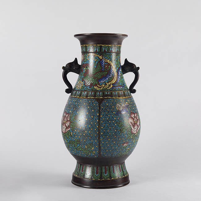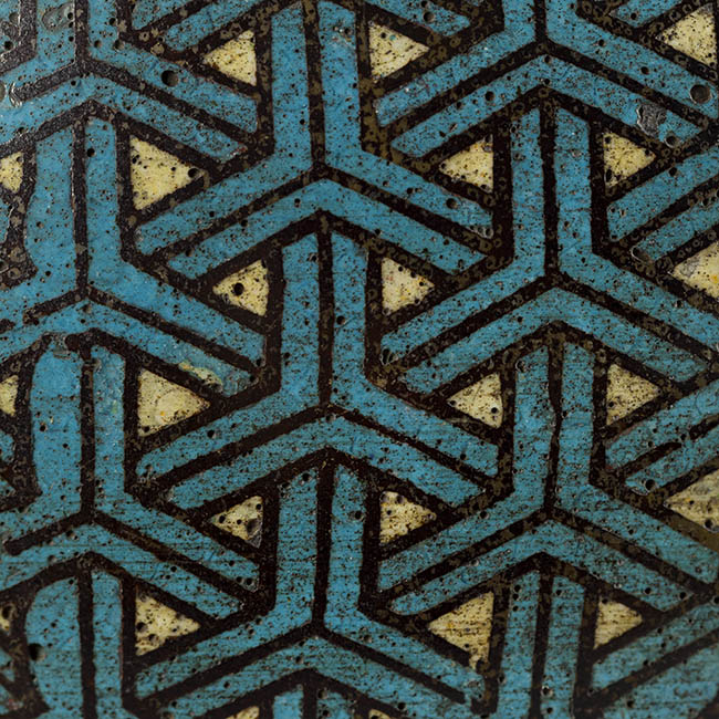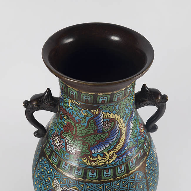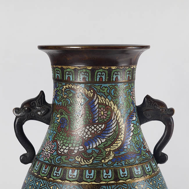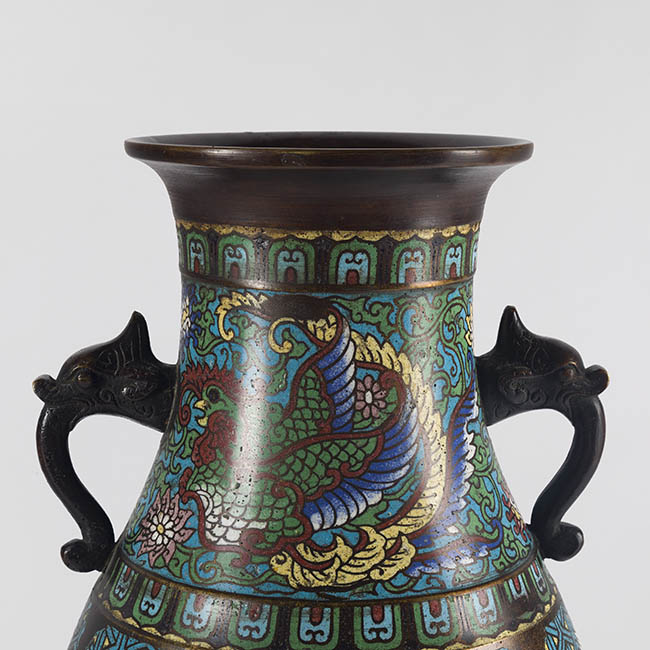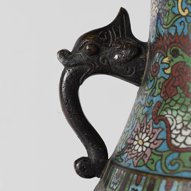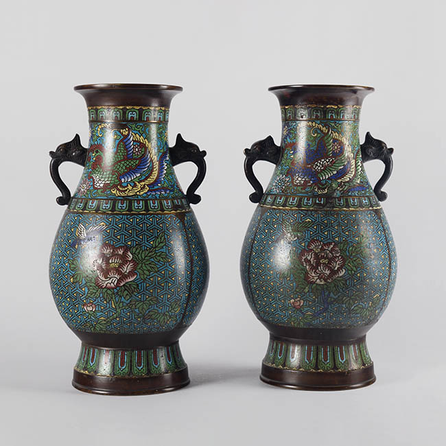 Par de contenedores de uso ornamental. Tienen cuerpo de forma globular, pie alto troncocónico, labio evertido y dos asas. El fondo del cuerpo y el cuello están decorados con un motivo geométrico repetitivo sobre el cual se superponen mtivos ornito y fito morfos. La paleta cromática es en tonos azules, verdes, rojos y marrones,