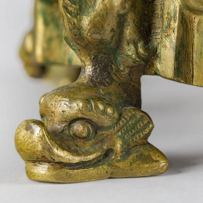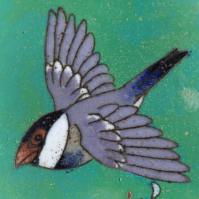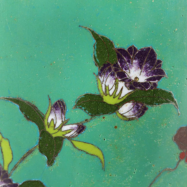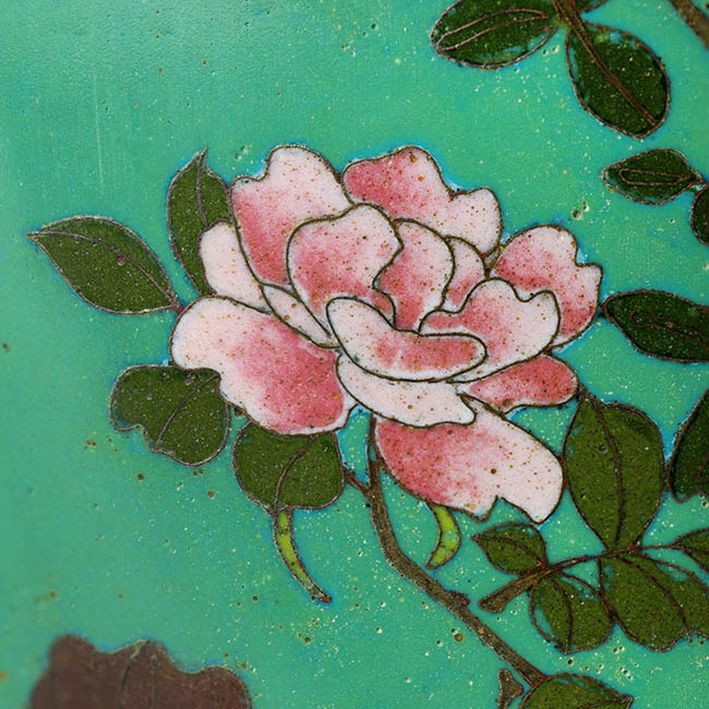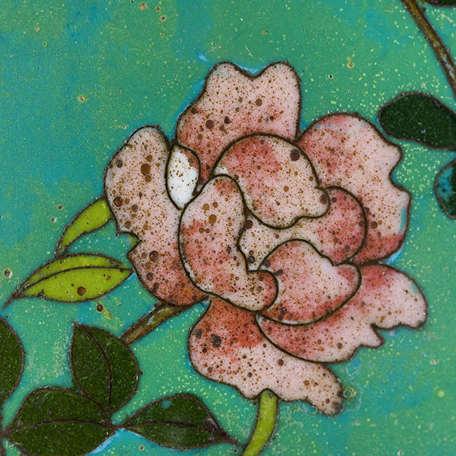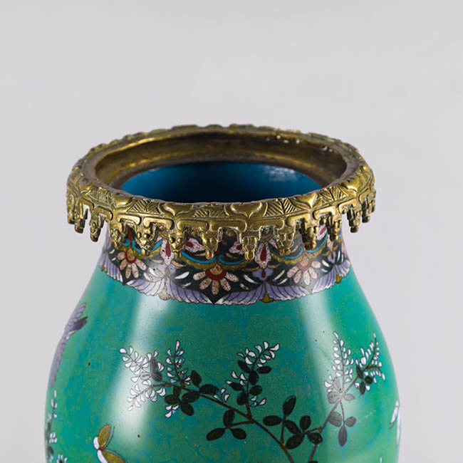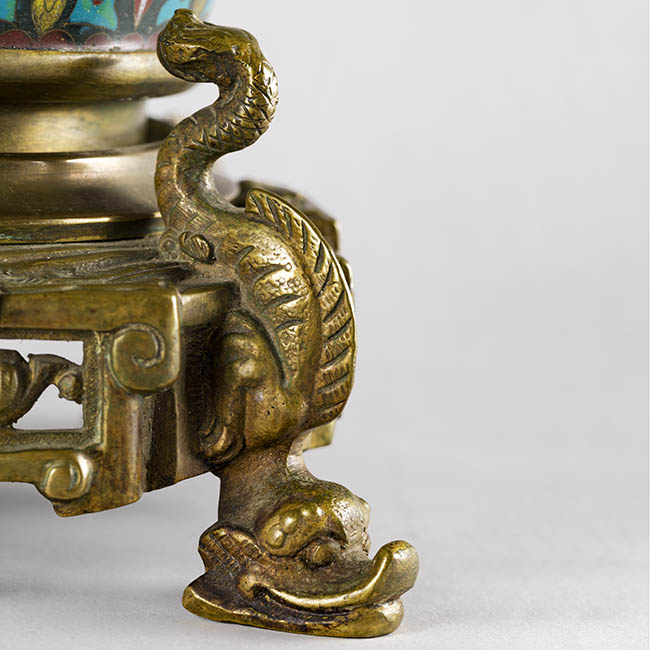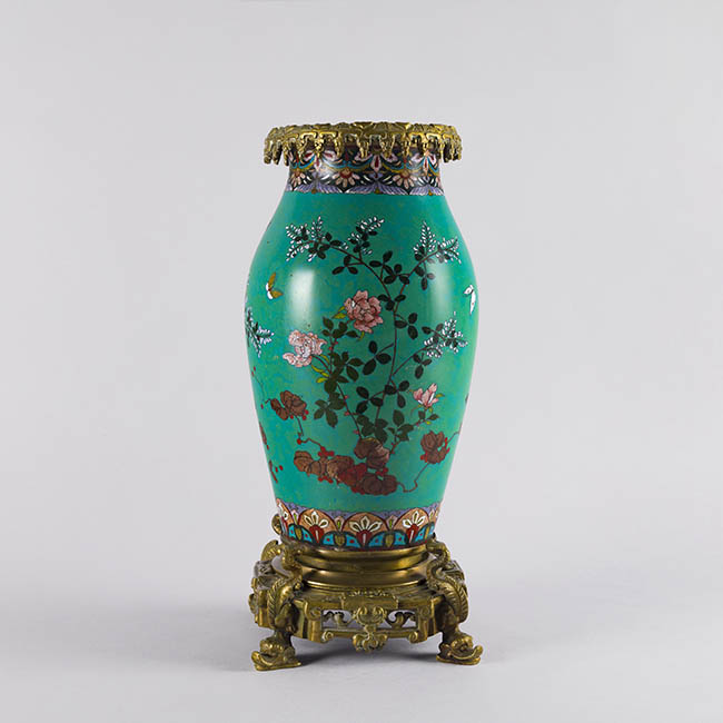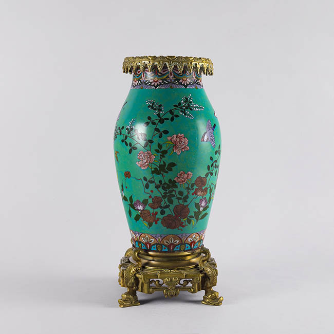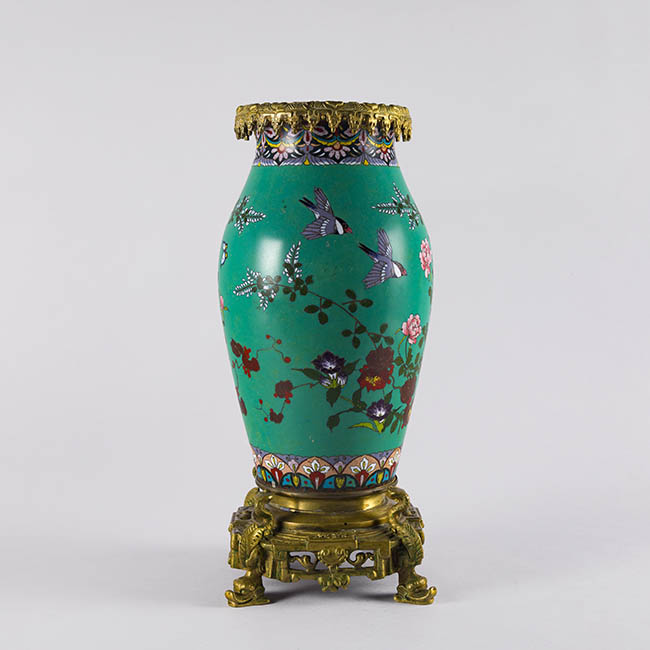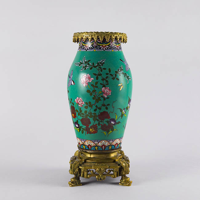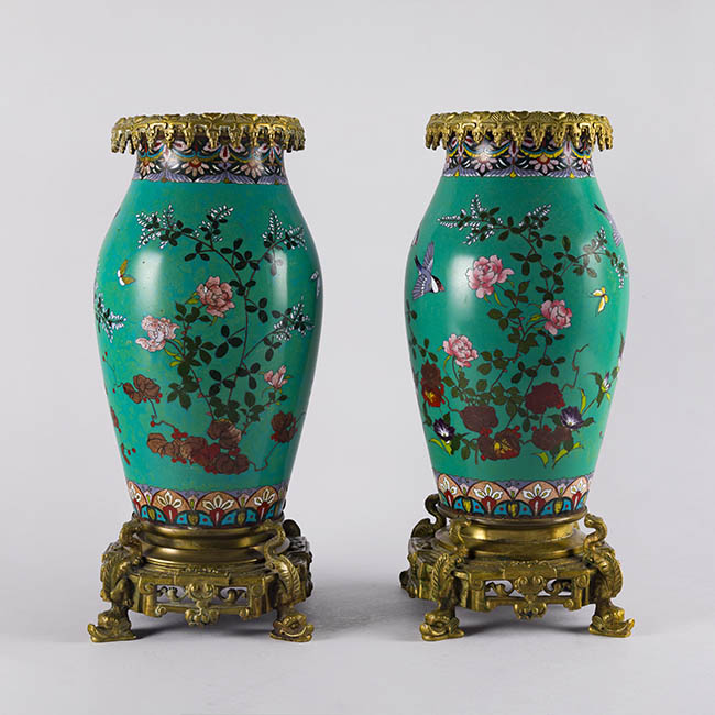 Par de contenedores de uso ornamental. Tienen un cuerpo de forma ovoidal sobre una base de bronce con cuatro pies de voluta y un remate de bronce de borde calado. La decoración es en base a motivos fito y zoomorfos. la paleta cromática es de color verde, rosa y blanco.