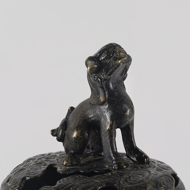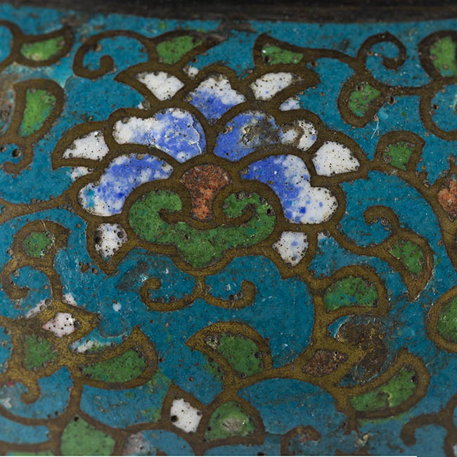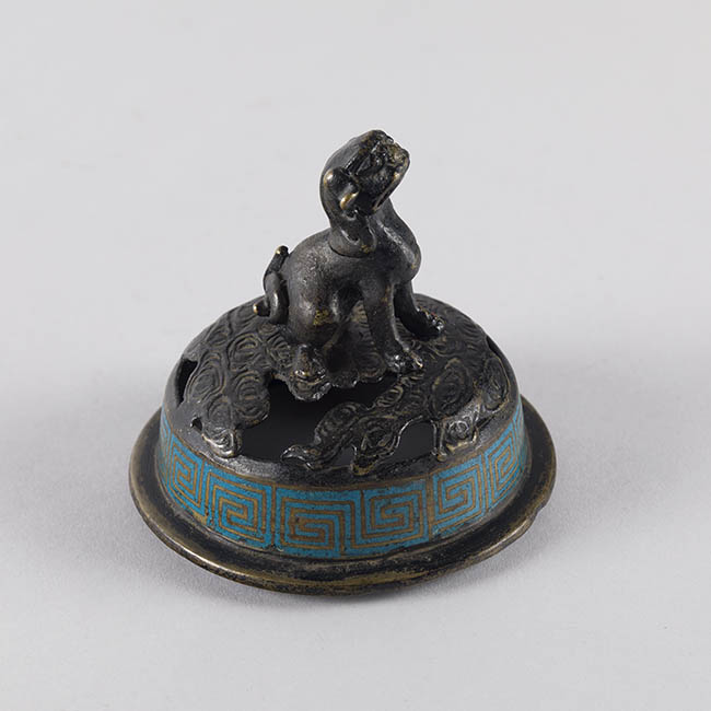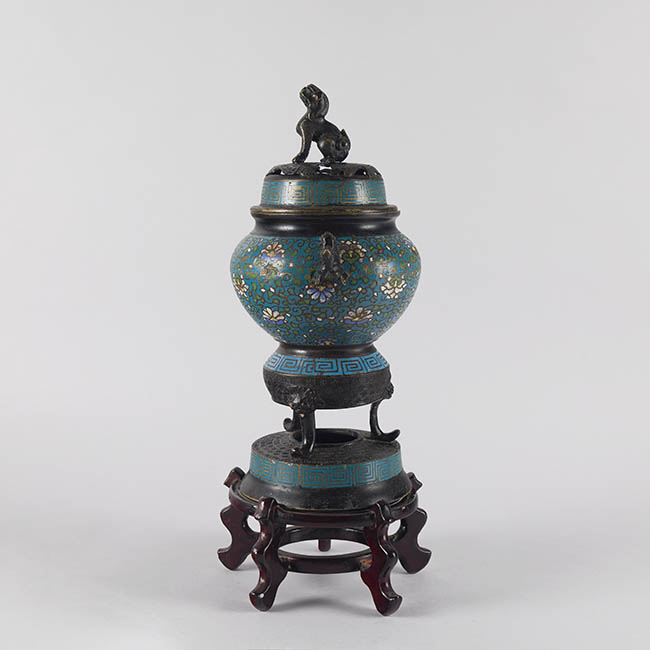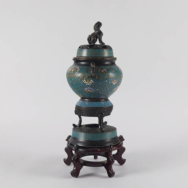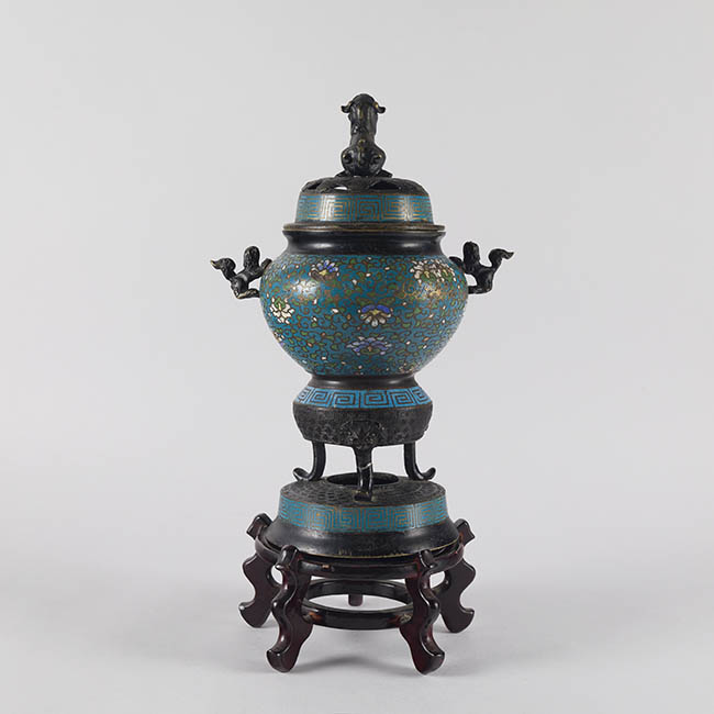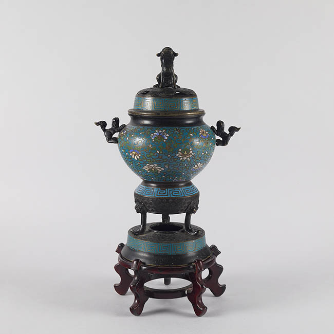 Objeto ornamental utilizado para aromatizar estancias. Cuerpo de forma balaustrada con dos asas zoomorfas y tapa rematada por una figura esciultórica zoomorfa. La decoración del cuerpo es en base a motivos fitomorfos, mientras que la base y el cuello tienen grecas. La paleta cromática es en base a tonos de azul, blanco y verde.