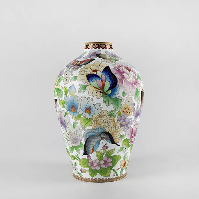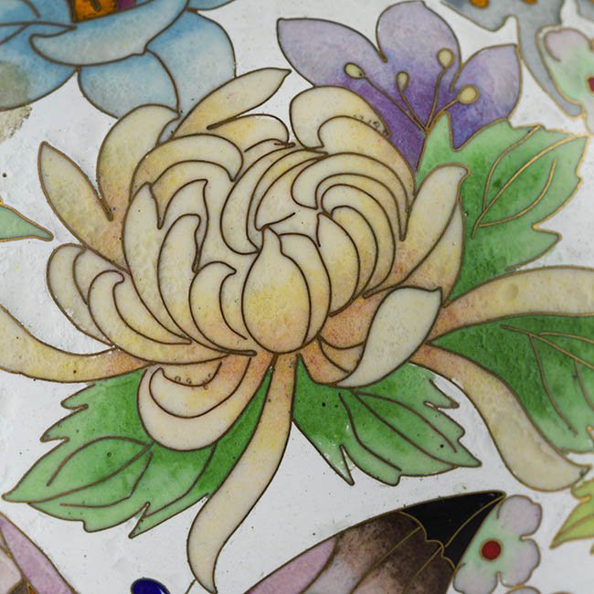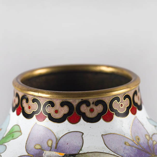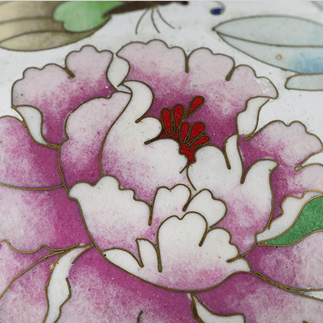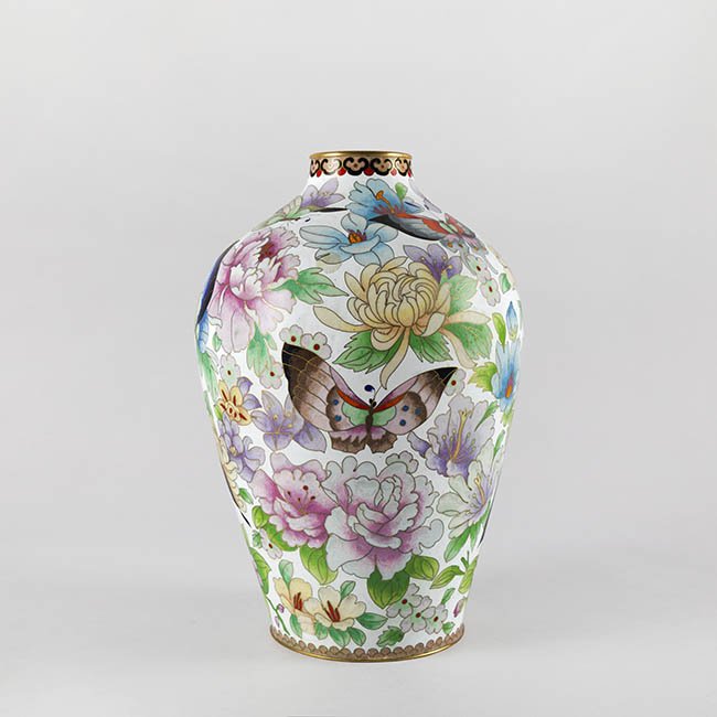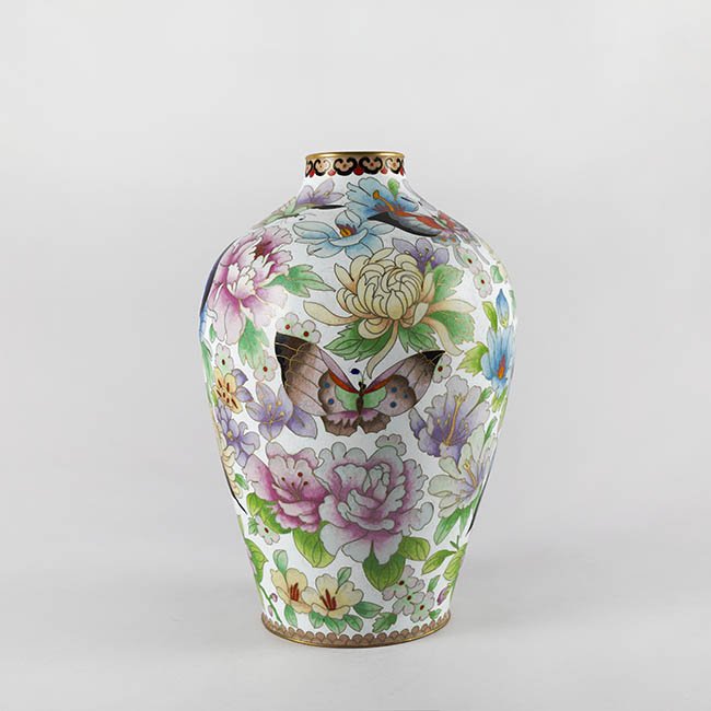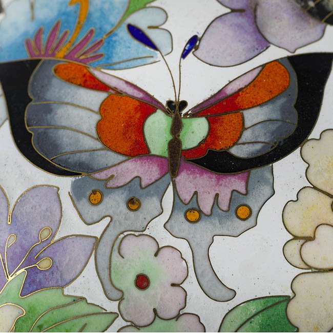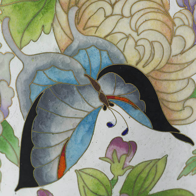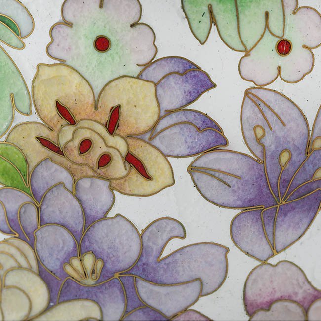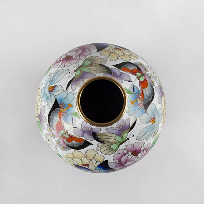 Contenedor de uso ornamental. Cuerpo de forma globular, base circular y cuello angosto. Superficie lisa y brillante con decoración en base a motivos florales y entomológicos. La paleta es en tonos azules, blancos y morados sobre base blanca.