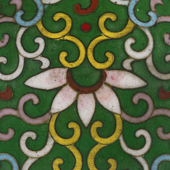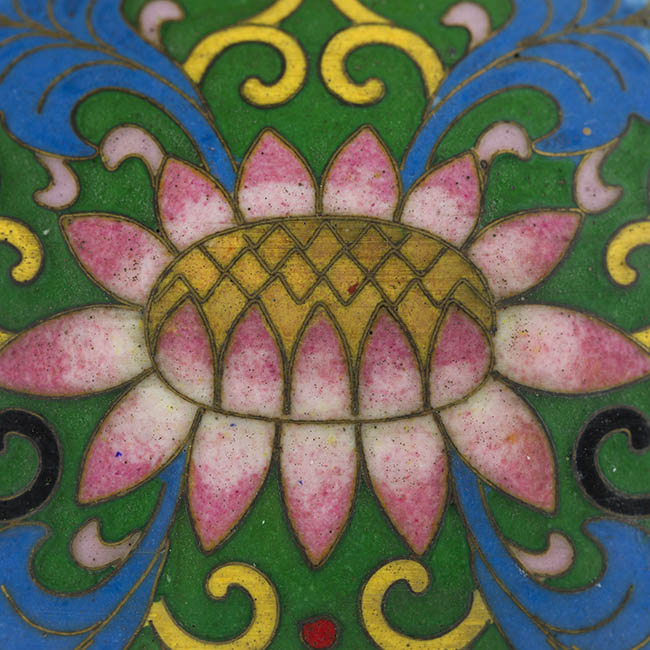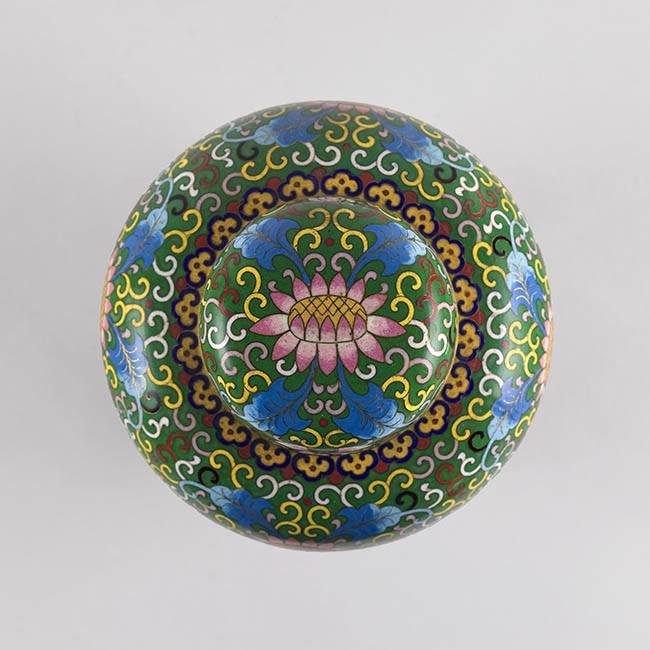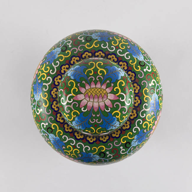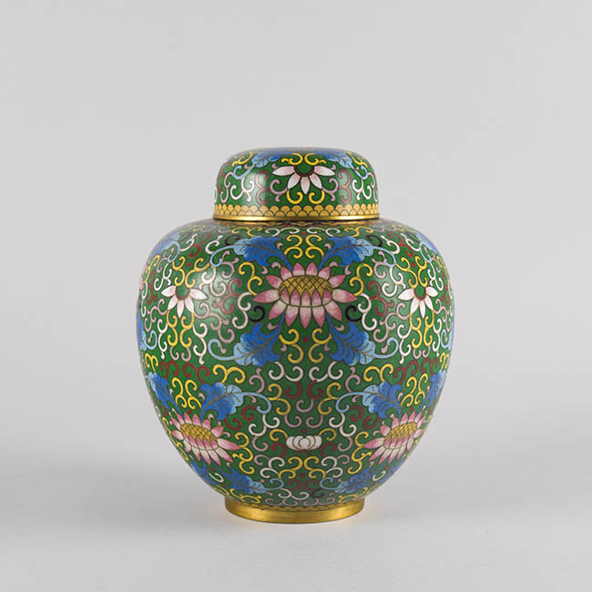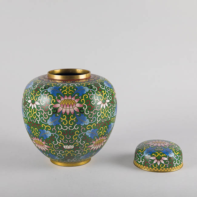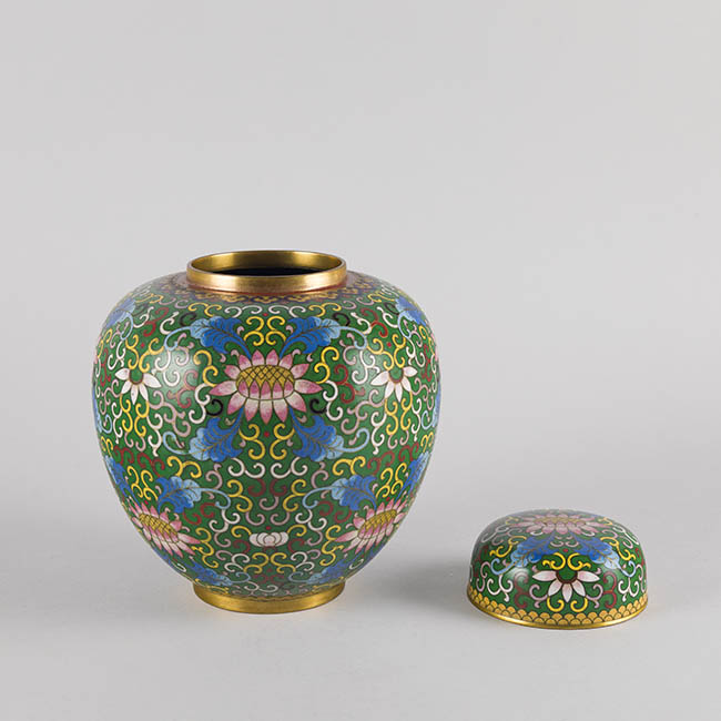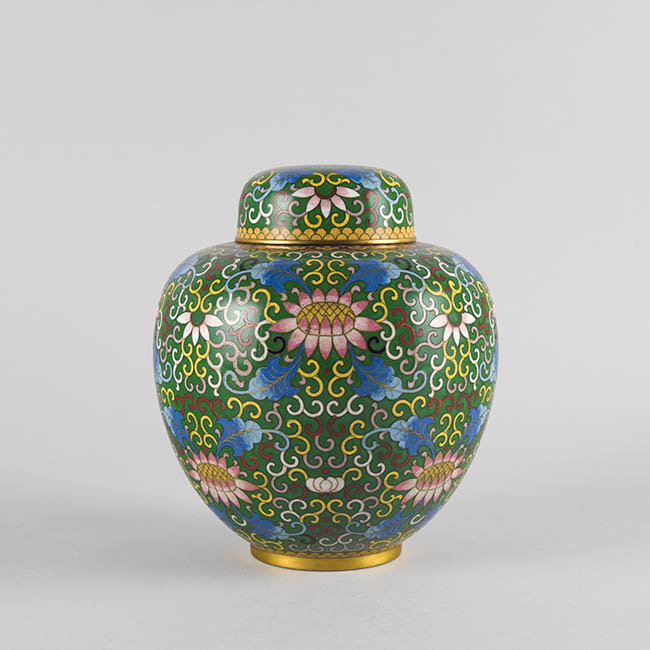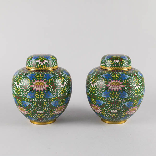 Par de contenedores de almacenamiento. Cuerpo de forma globular con tapa. Los bordes de la boca, tapa y pipé son de metal dorado. Superficie lisa y brillante, decoración en base a motivos florares en tonos rosa, azules, amarillo con fondo verde.