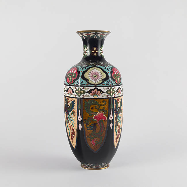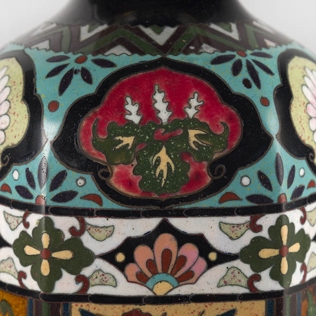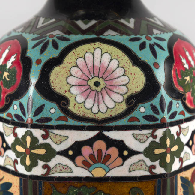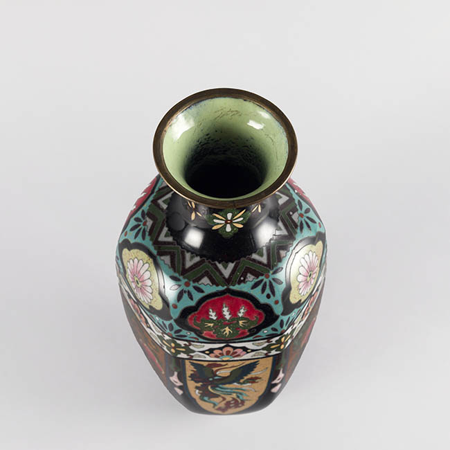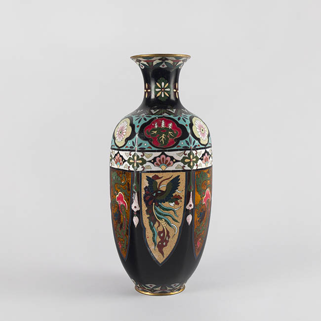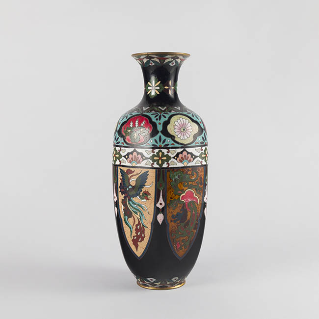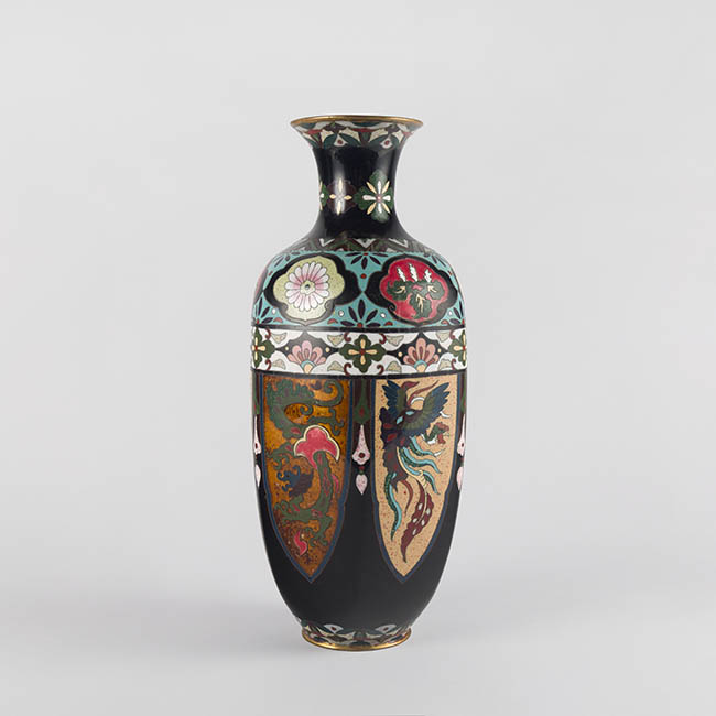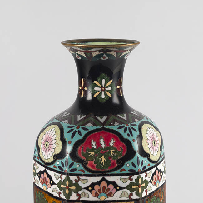Contenedor de uso doméstico ornamental destinado para poner flores. El objeto presenta un cuerpo globular que se estrecha hacia un cuello alargado, y una boca y una base circular. La decoración está dividida en varias secciones horizontales: un friso en el cuello, una banda central con motivos florales y geométricos, y una sección más amplia en el cuerpo con escudos que contienen figuras mitológicas en tonos rojizos, dorados, azules y verdes.