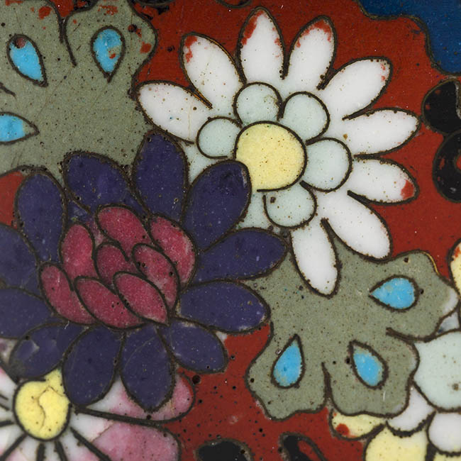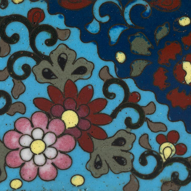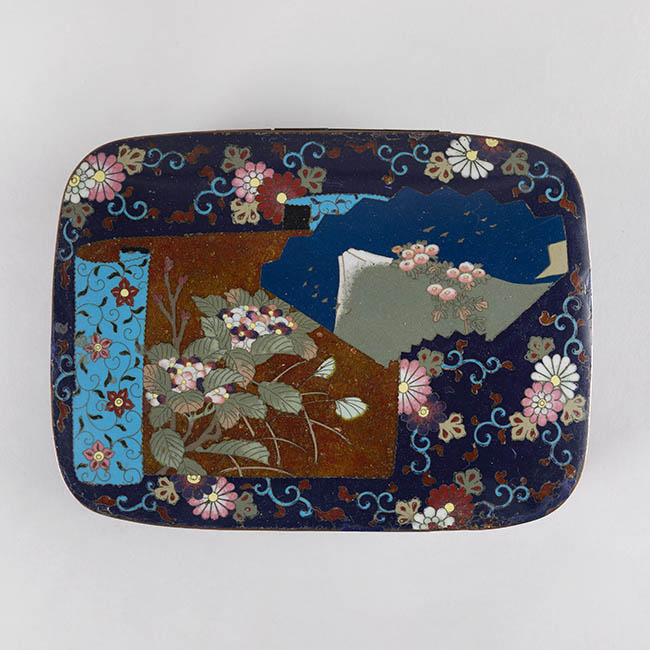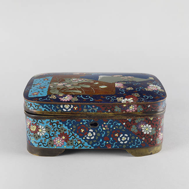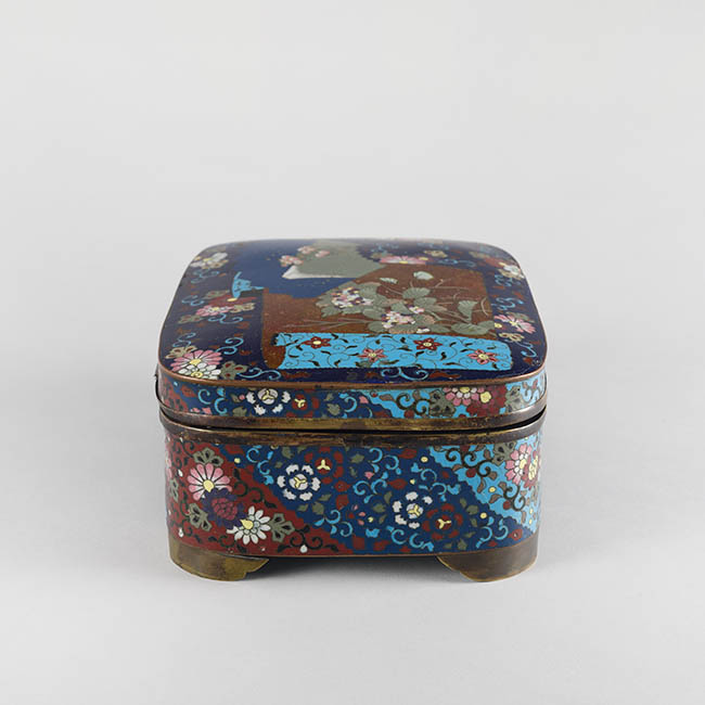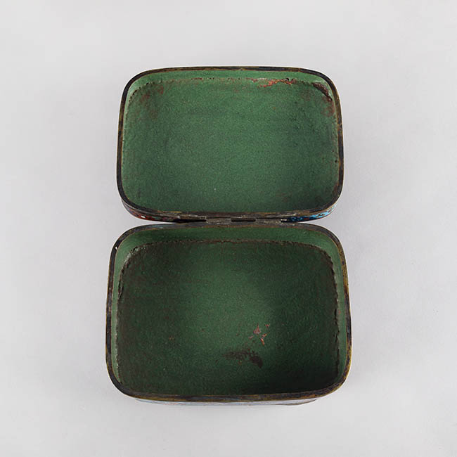 Objeto de uso doméstico ornamental. Caja rectangular con tapa abatible y cuatro pequeñas patas. Fabricada en metal esmaltado con técnica de cloisonné, presenta decoración policroma de motivos florales y volutas en tonos azul, rojo y turquesa. La tapa exhibe composiciones figurativas y florales enmarcadas en secciones ornamentales. El interior es liso y de color verde. El diseño general muestra un acabado brillante.