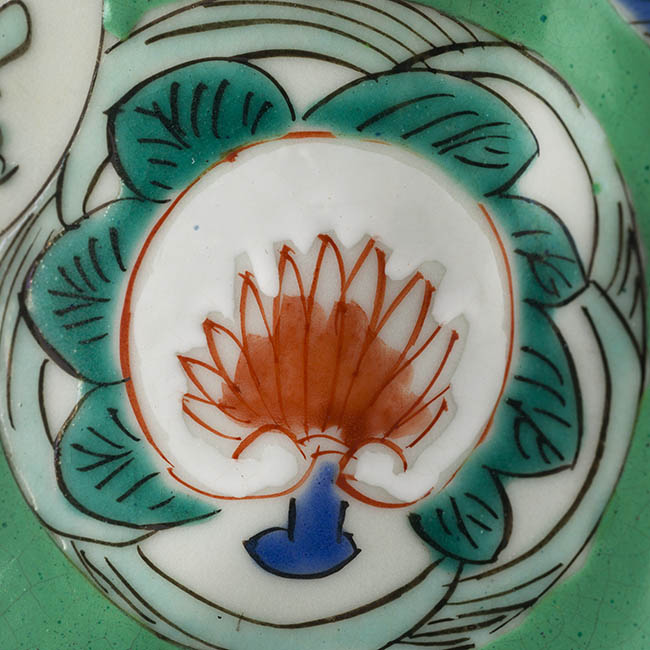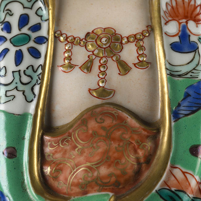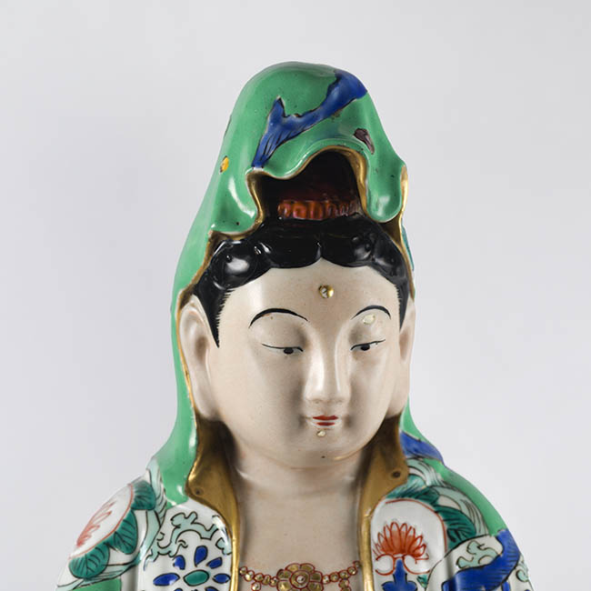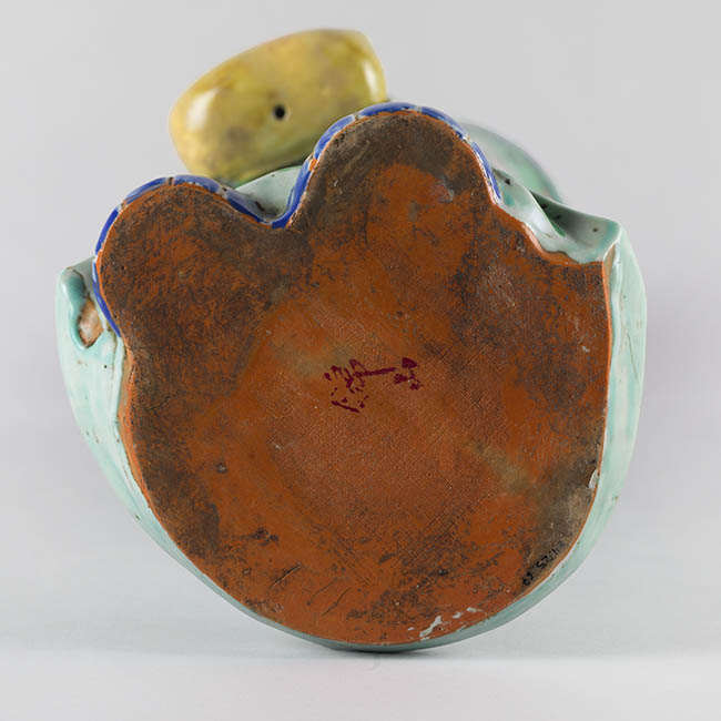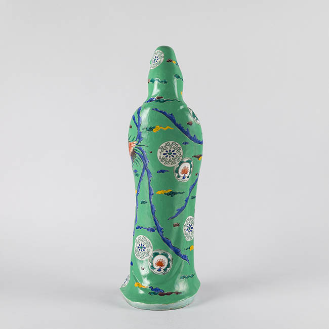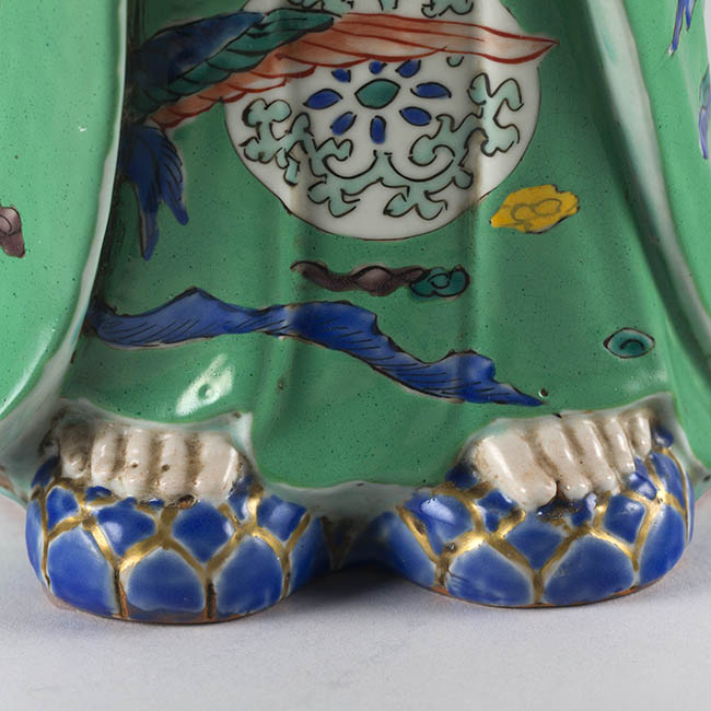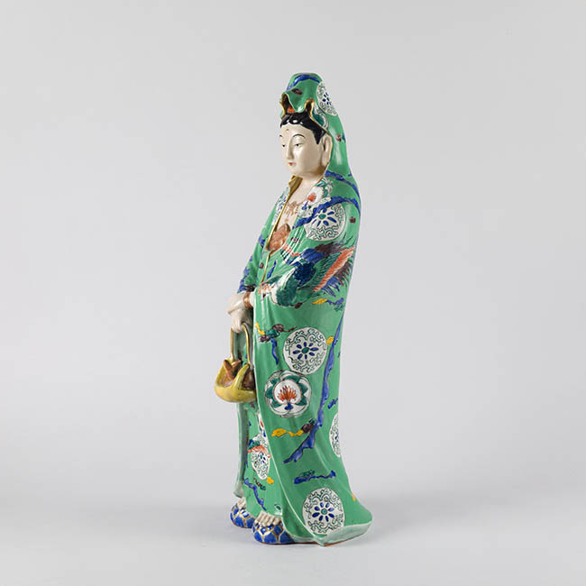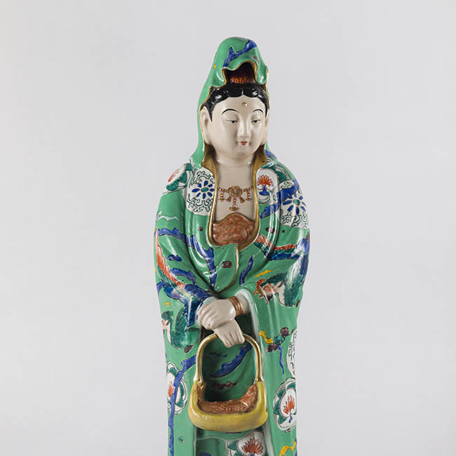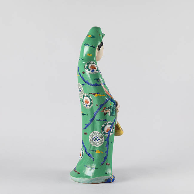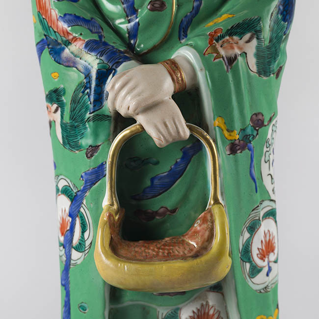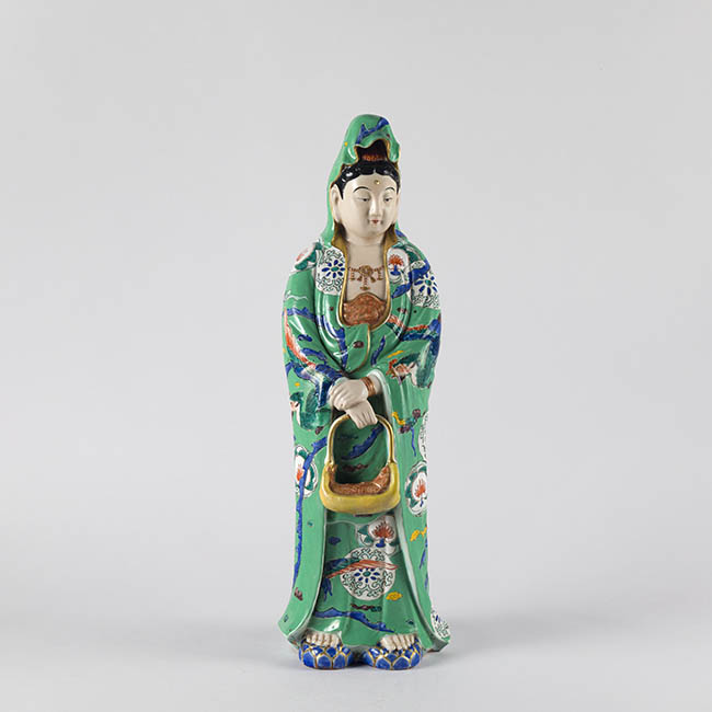 Objeto decorativo que representa a una figura femenina de pie vestida con túnica y velo, de color verde con motivos florales, que cubre la cabeza. Sostienen una cesta con su mano izquierda. Superfcie lisa y brillante .