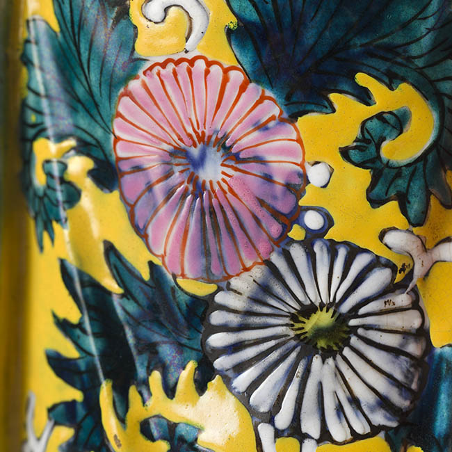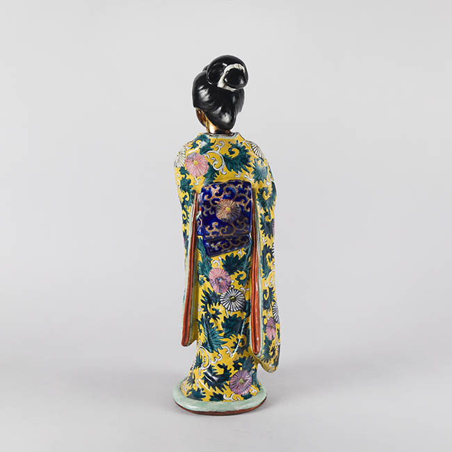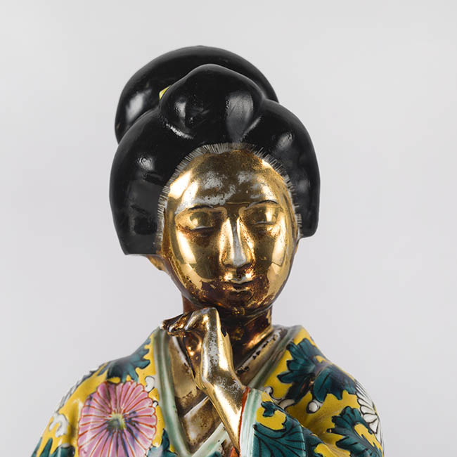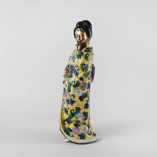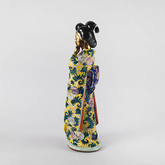 Objeto decorativo que representa una figura femenina de pie, con rostro, cuello y manos con acabado dorado. Lleva el cabello recogido y tiene una mano flectada bajo la barbilla. Viste una túnica color amarillo decorada con motivos florales en tonos rosa, blanco, ver de y azul.