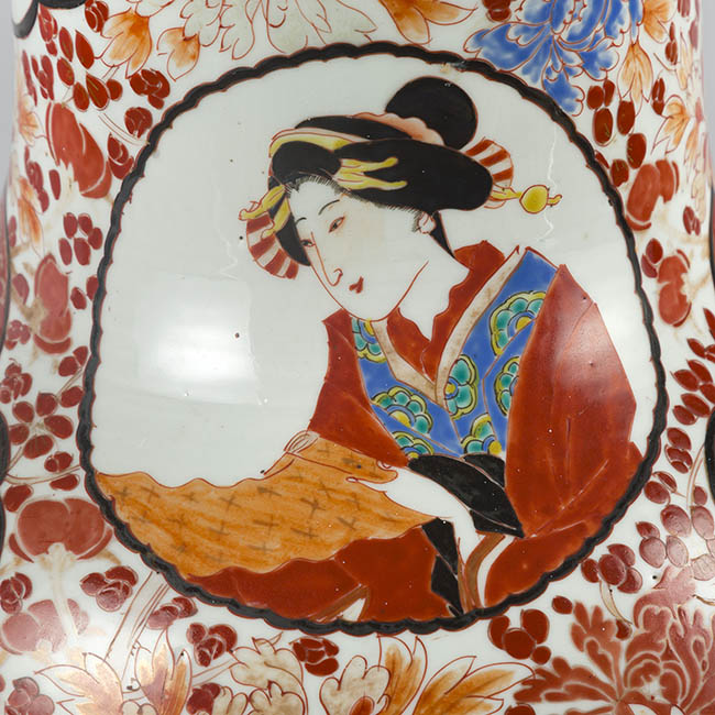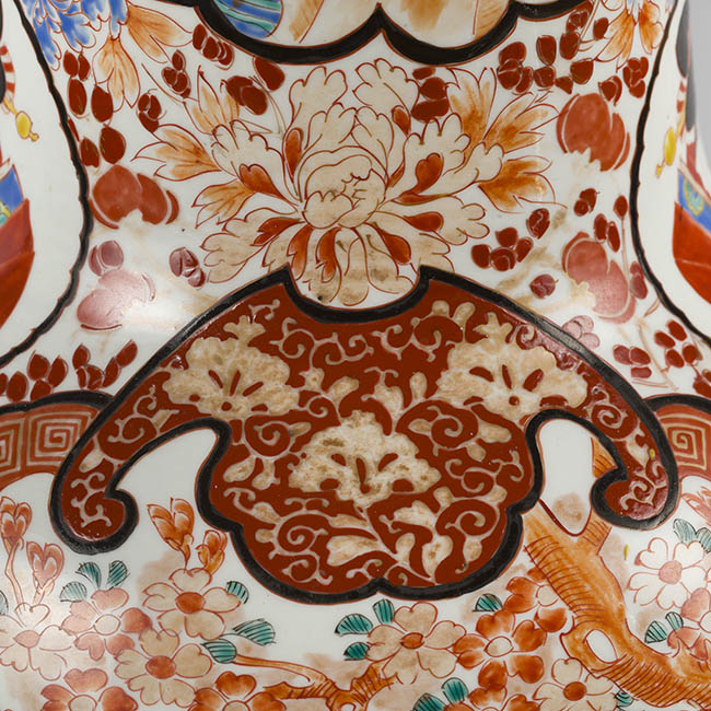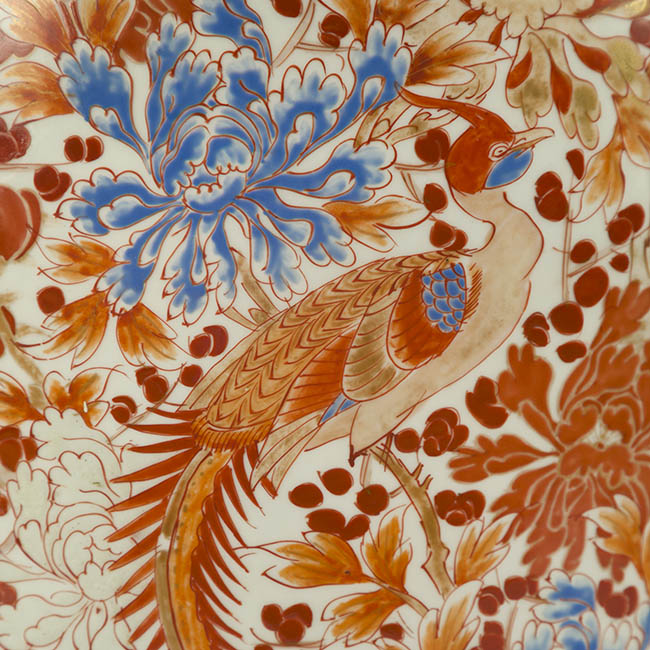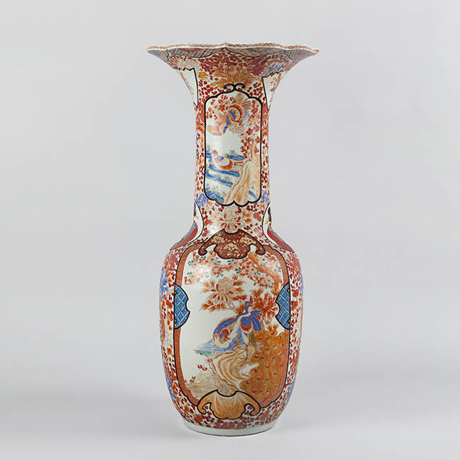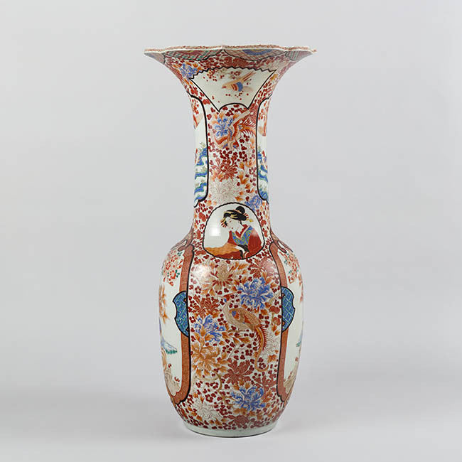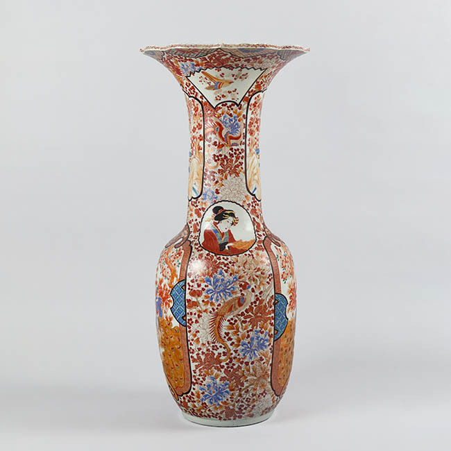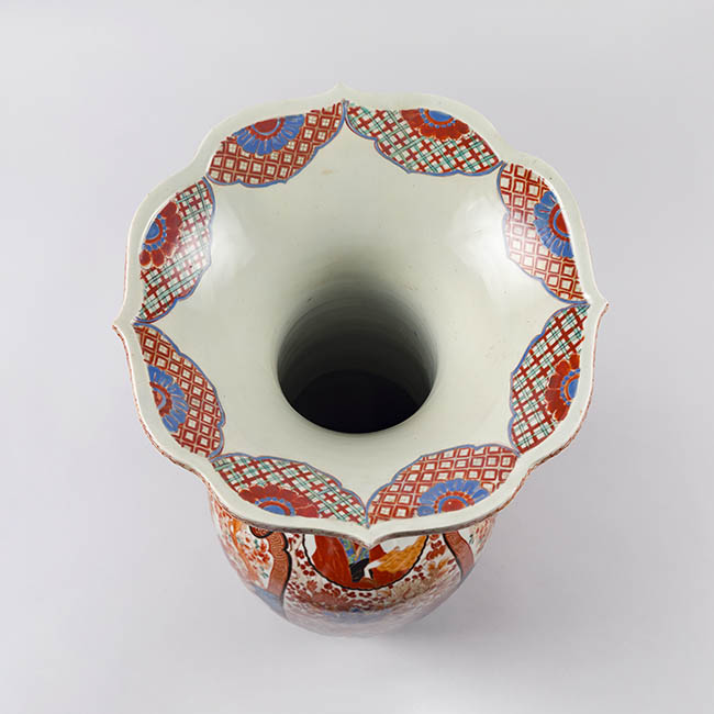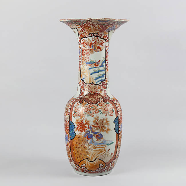 Objeto ornamental de cuerpo abalonado, con cuello alargado y abertura acampanada de borde ondulado. Presenta decoración policroma en tonos rojos, azules y naranjas sobre fondo blanco, organizada en cartelas verticales con escenas de paisaje y aves, alternadas con motivos fitomorfos florales. La superficie restante se encuentra cubierta por follajes y flores estilizadas, en una composición simétrica y detallada.