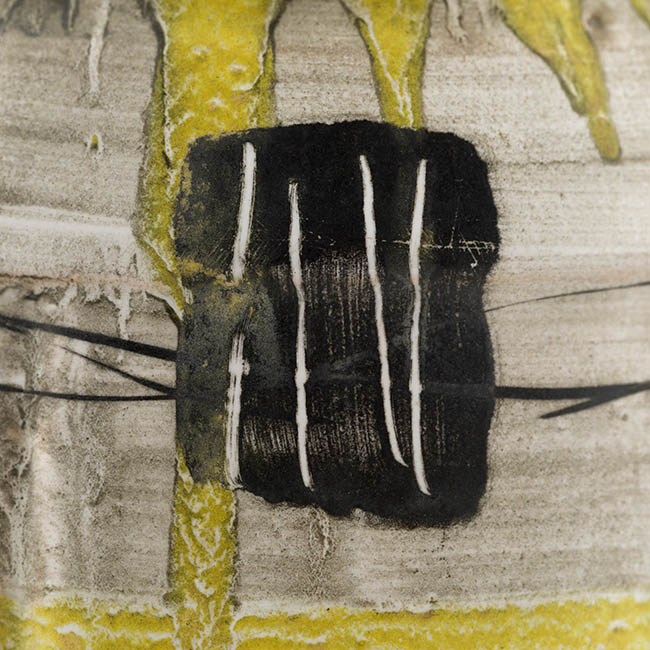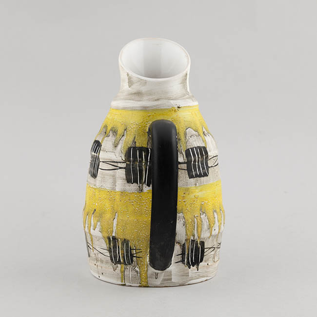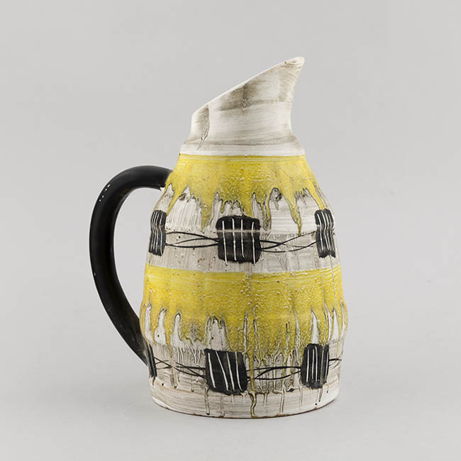 Contenedor diseñado para servir líquidos. Presenta una forma general troncocónica de cuerpo alto, con una embocadura estrecha y un vertedero pronunciado en la parte superior. La superficie externa está recubierta por un esmalte amarillo y blanco dispuesto en bandas irregulares que se fusionan entre sí, sobre las que se incorporan motivos geométricos negros de forma rectangular, alineados en dos registros horizontales. Tiene un asa de sección curva.