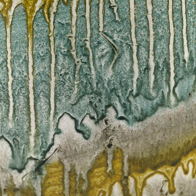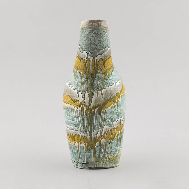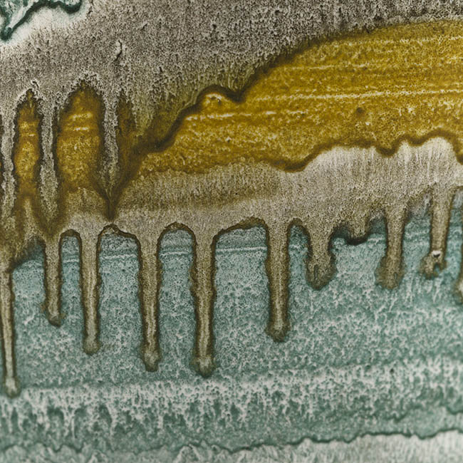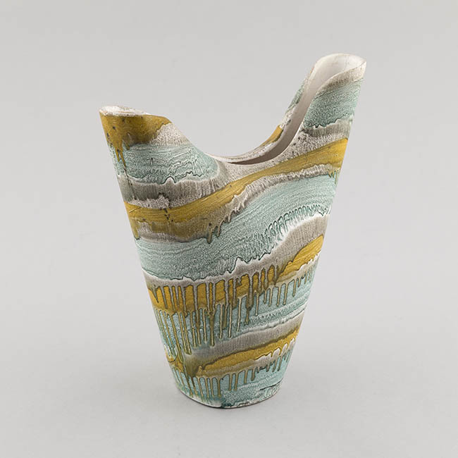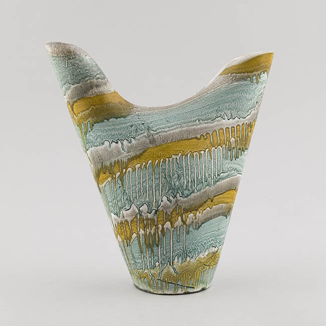 Contenedor destinado a exhibir flores. Tiene cuerpo en forma de “V” con boca abierta y bordes superiores elevados en sus laterales. La superficie está recubierta por esmaltes superpuestos en tonos amarillos, anaranjados y verdes. Las transiciones cromáticas generan un aspecto estratificado.