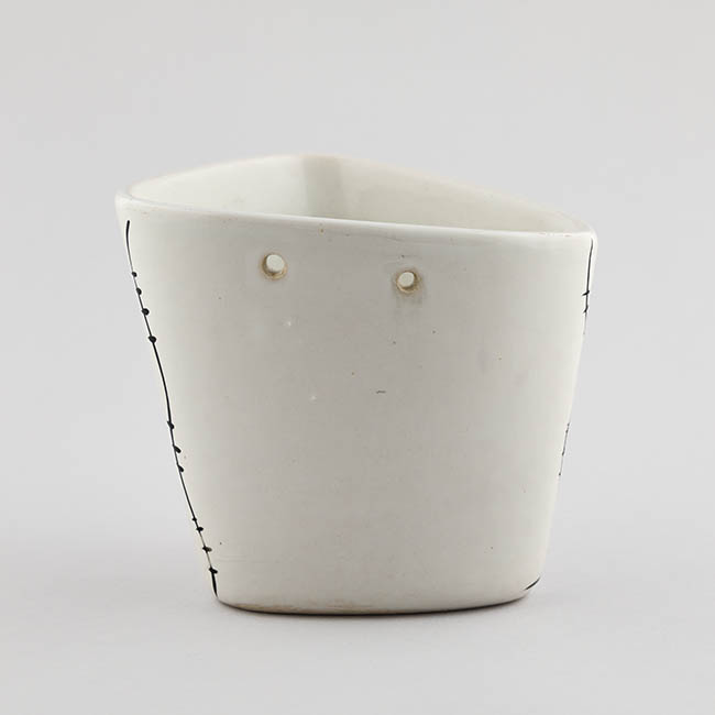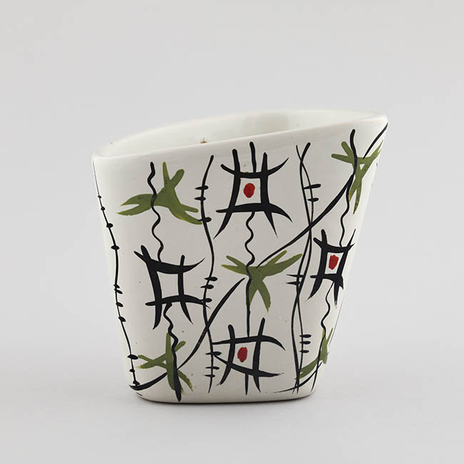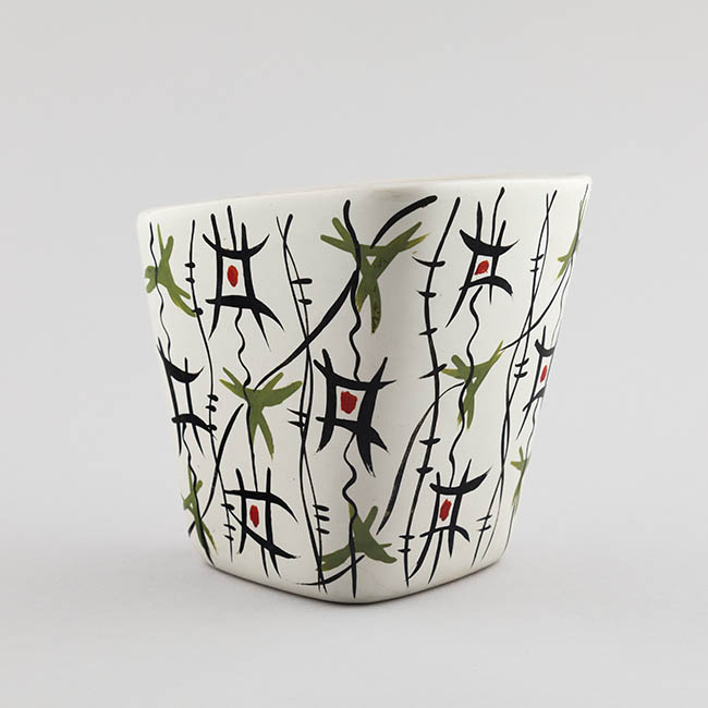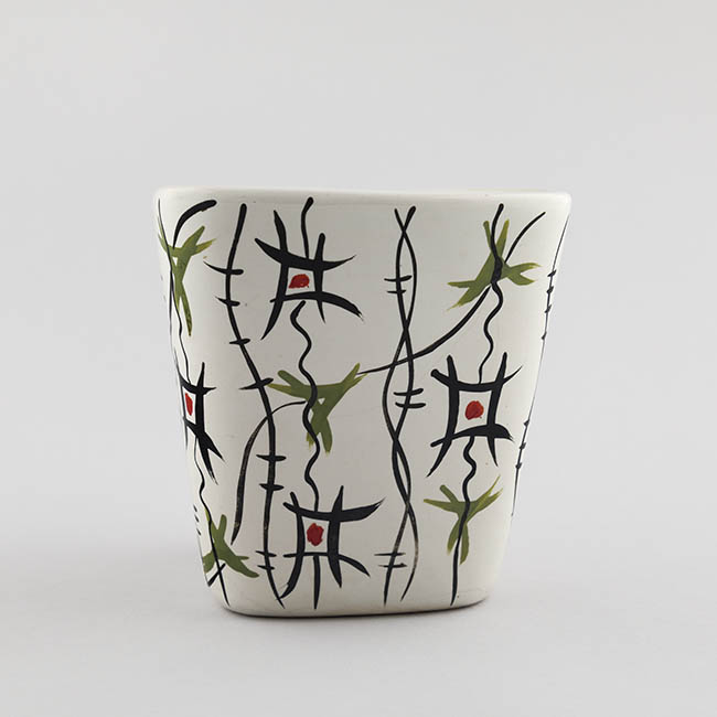 Contenedor para plantas de forma troncocónica invertida y boca amplia. Sobre un fondo blanco se disponen motivos lineales negros que forman figuras estrelladas o radiales, acompañadas de elementos en verde y pequeños elementos en rojos en los centros. La decoración se distribuye de manera continua alrededor del cuerpo.