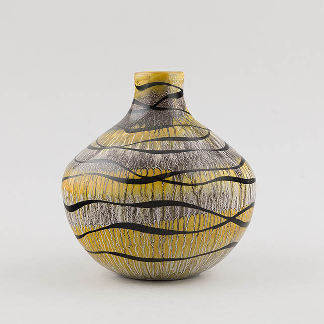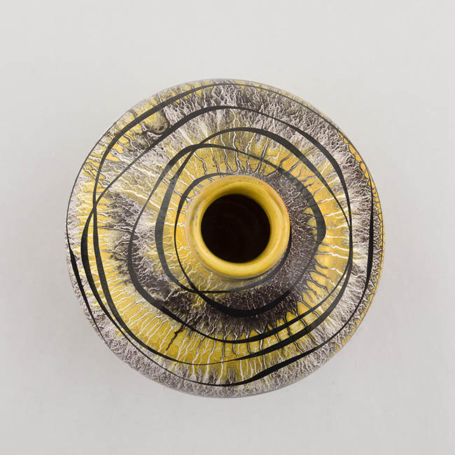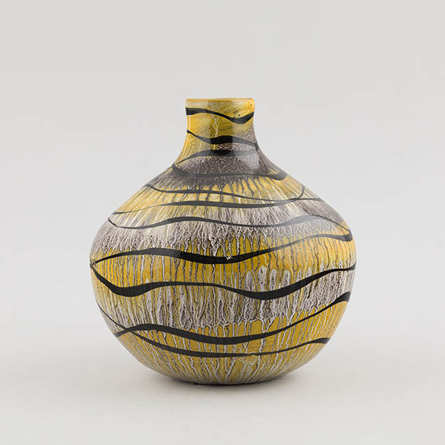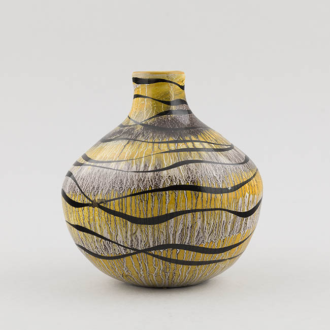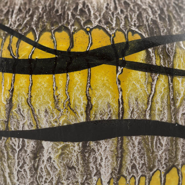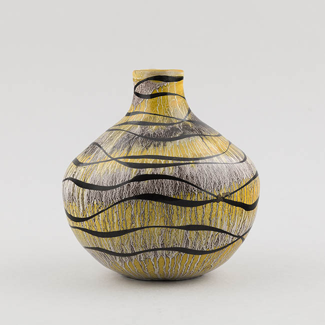 Contenedor para exhibir flores de forma globular y cuello corto. La superficie está decorada con un fondo amarillo integrado con zonas blancas y grises, sobre el cual se disponen líneas negras ondulantes que recorren el cuerpo en sentido horizontal.