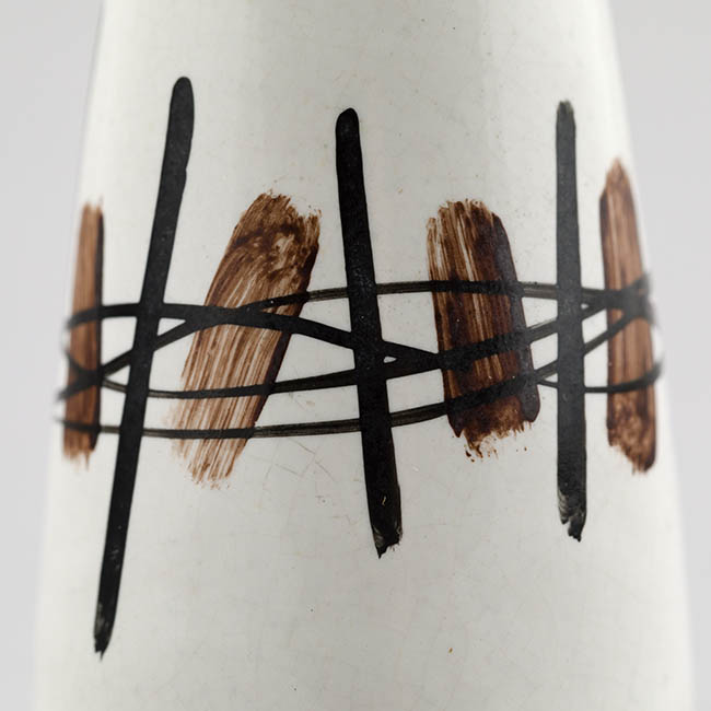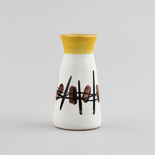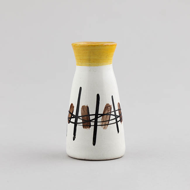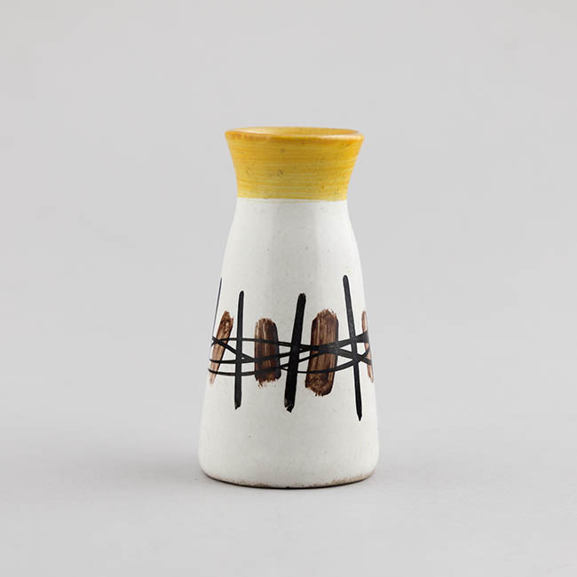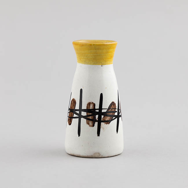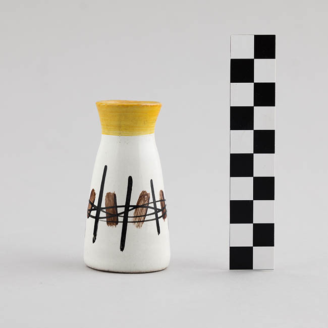 Contenedor destinado a alojar líquidos en su interior. Presenta una forma general troncocónica invertida, con un cuerpo que se ensancha progresivamente hacia la base y una boca recta de contorno circular. La zona superior tiene y una franja de esmalte amarillo uniforme, mientras que en la superficie blanca del cuerpo presenta decoración de disposición horizontal compuesta de por trazos verticales negros alternados con manchas oblongas en tono marrón, intersectados por líneas negras cruzadas.