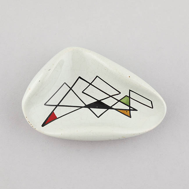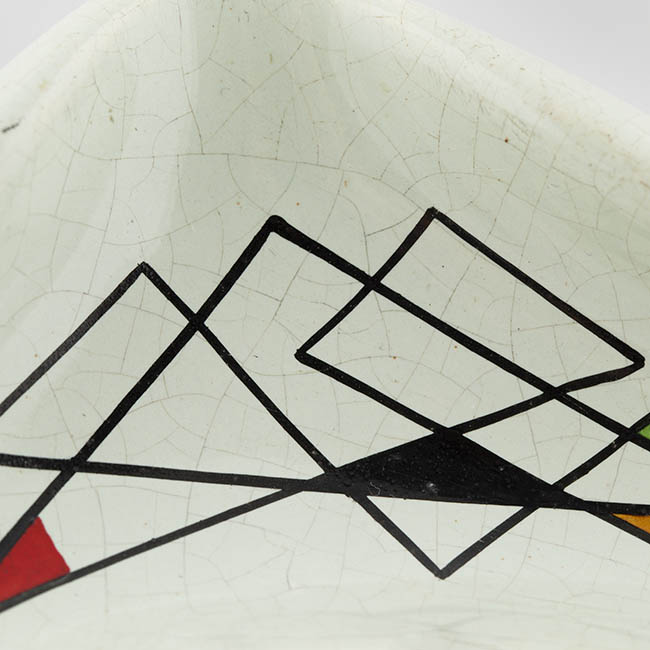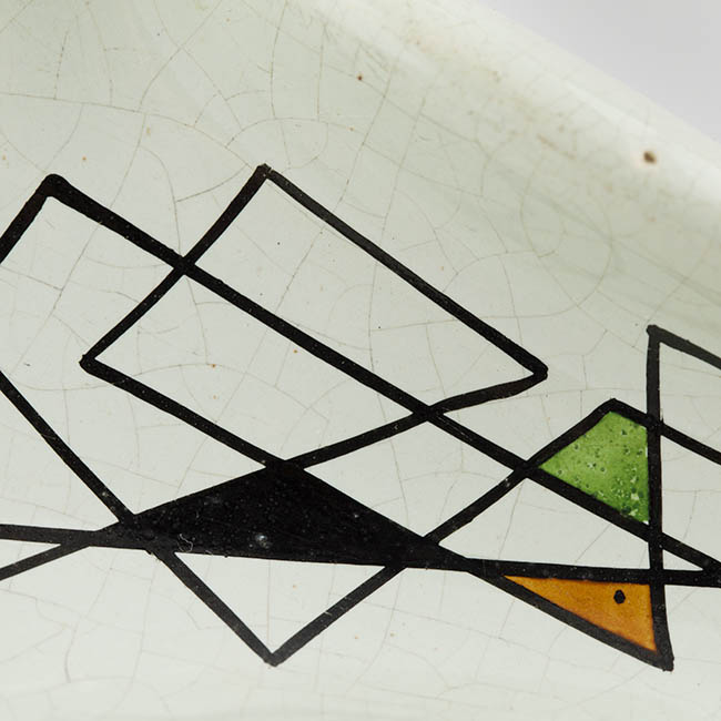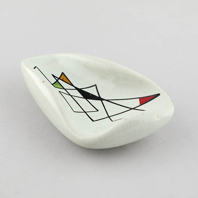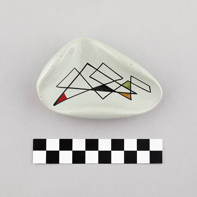 Recipiente para dejar las cenizas de tabaco de forma asimétrica y cóncava, con bordes suaves y contorno irregular. Decoración interior compuesta por un conjunto de líneas negras rectas que se entrecruzan formando ángulos agudos y figuras poligonales abiertas. En varios de los vértices se integran acentos cromáticos en tonos naranja y verde.