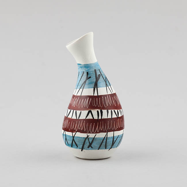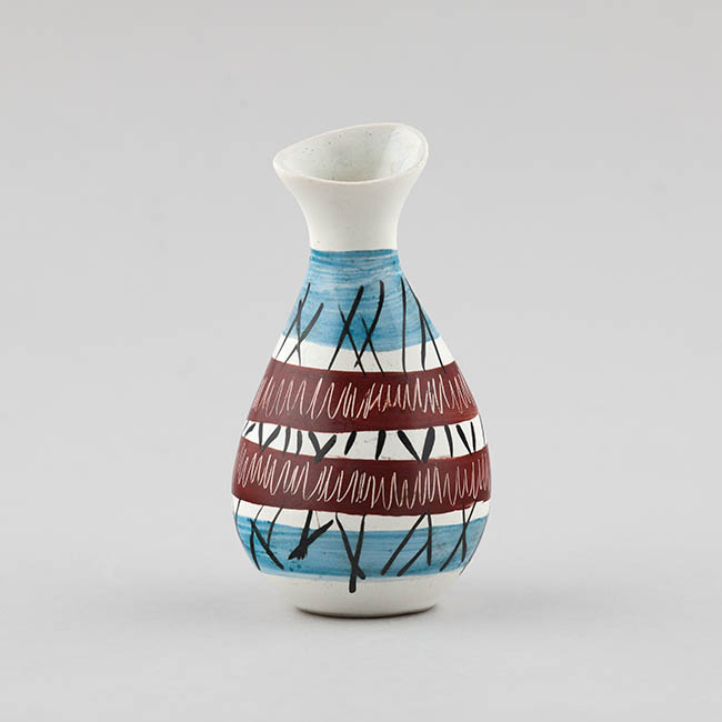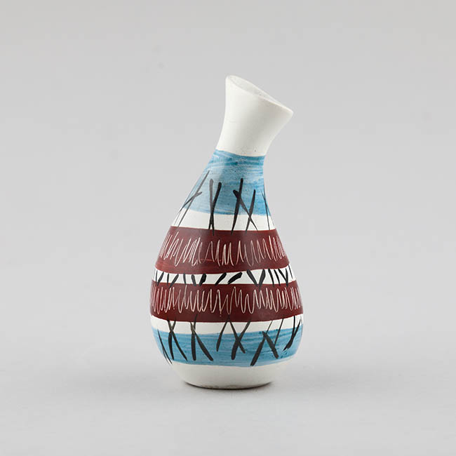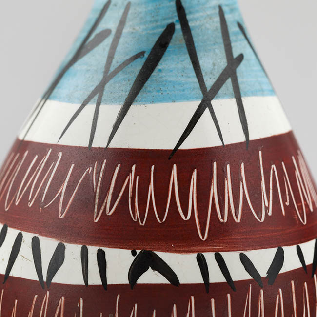 Contenedor para exhibir flores, de forma ovoidal y cuello ligeramente inclinado. El cuerpo presenta una decoración en franjas horizontales: bandas azules en la parte superior e inferior y, entre ellas, bandas en tono rojizo. Sobre estas franjas se superponen trazos lineales negros que se cruzan vertical y diagonalmente, junto con líneas blancas onduladas.