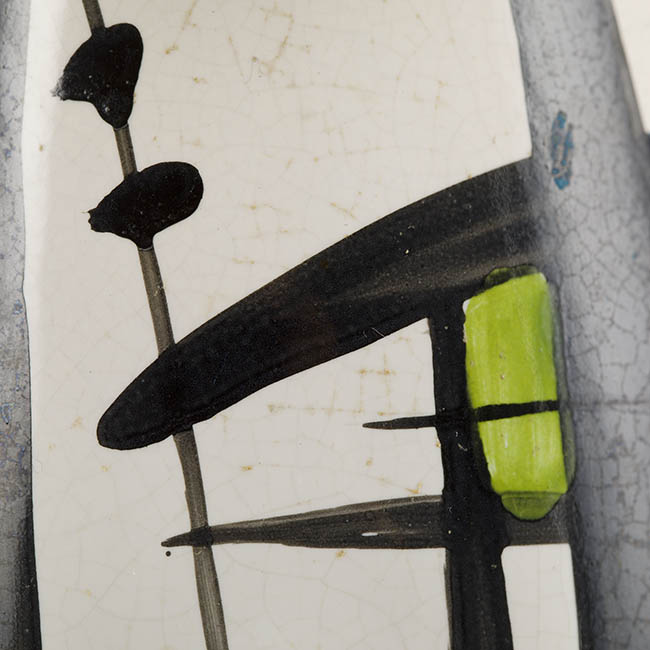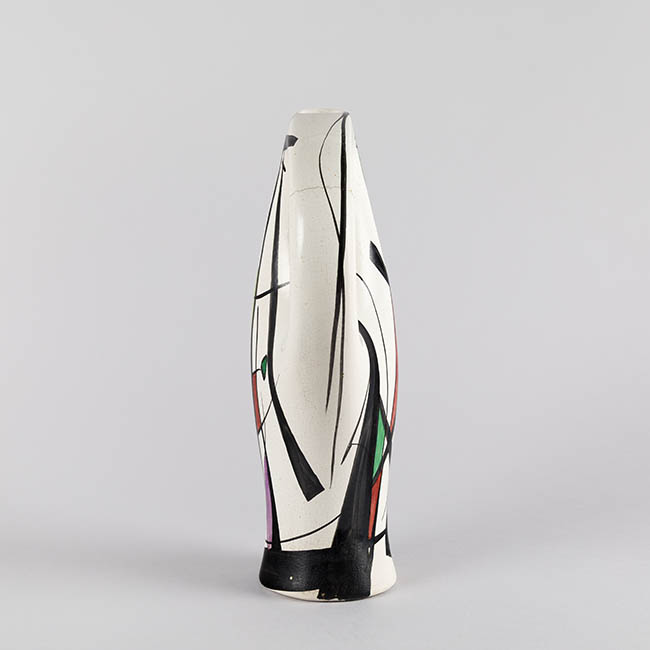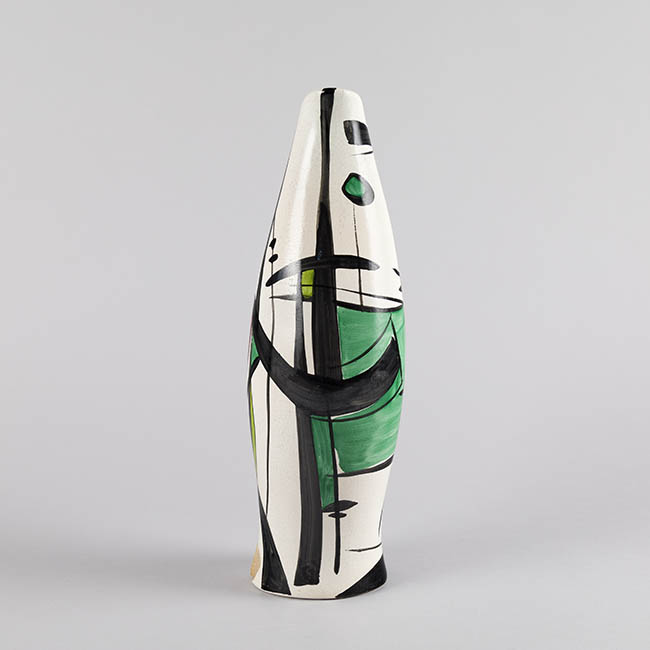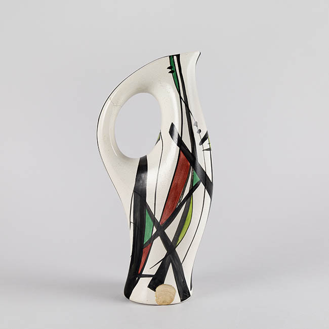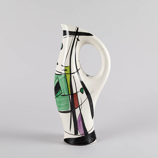 Contenedor destinado a servir líquidos de forma alargada y asimétrica, con un cuerpo que se inclina levemente y un asa integrada al volumen posterior. La superficie blanca presenta una composición abstracta delineada en negro, acompañada de áreas de color verde, púrpura y amarillo aplicadas en grandes campos de color. Los trazos lineales siguen la curvatura del cuerpo.