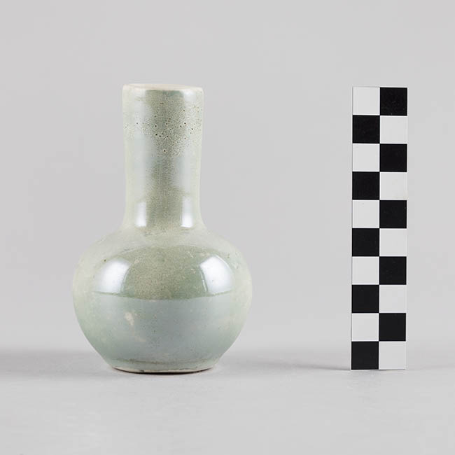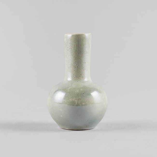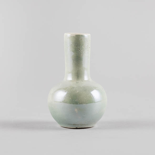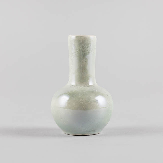 Contenedor para exhibir flores, compuesto por un cuerpo globular y un cuello recto y delgado. La superficie presenta un acabado brillante en tonos blanco y beige, con variaciones nacaradas y ligeras manchas dispersas.