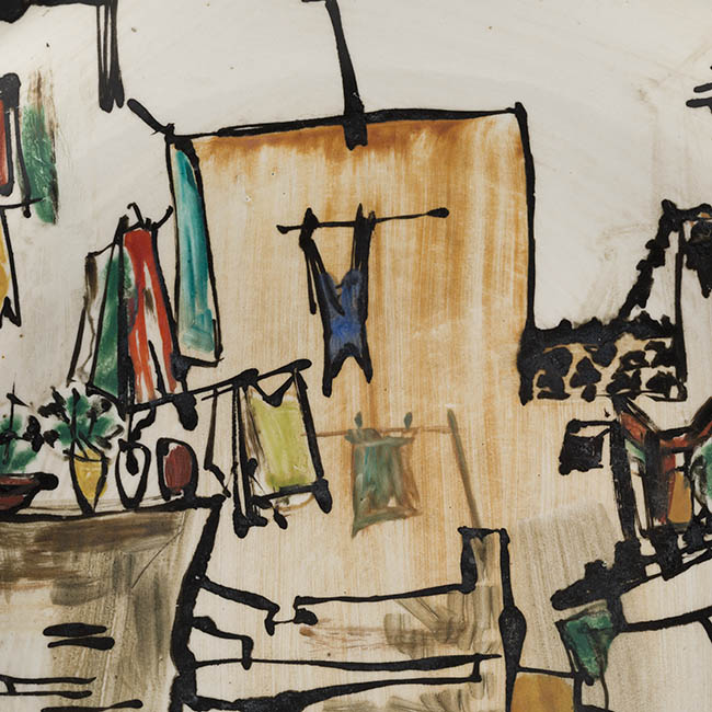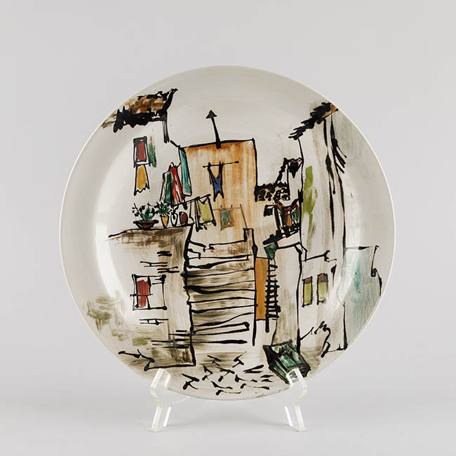 Objeto decorativo de superficie plana y forma circular, con borde continuo y levemente elevado. Sobre un fondo blanco se dispone una composición con estructuras arquitectónicas de trazos lineales en negro, complementados con áreas de color ocre, rojo y verde. La escena presenta una organización fragmentada con planos superpuestos.