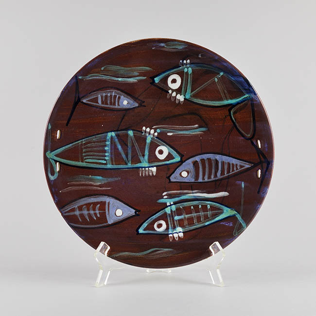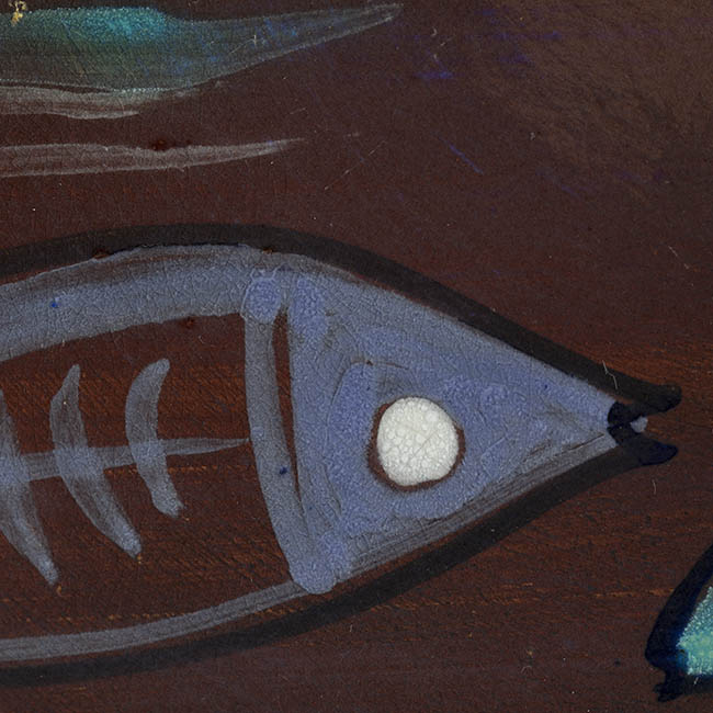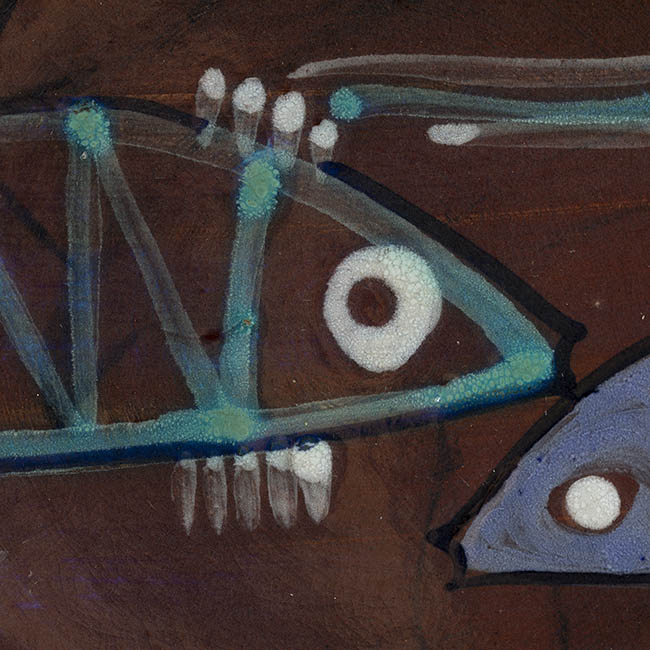Objeto decorativo de forma circular y superficie cóncava. Sobre un fondo café rojizo se distribuyen varias figuras ictiomorfas delineadas en verde y blanco, con detalles internos de líneas paralelas y puntos. La disposición es radial e incorpora líneas curvas.