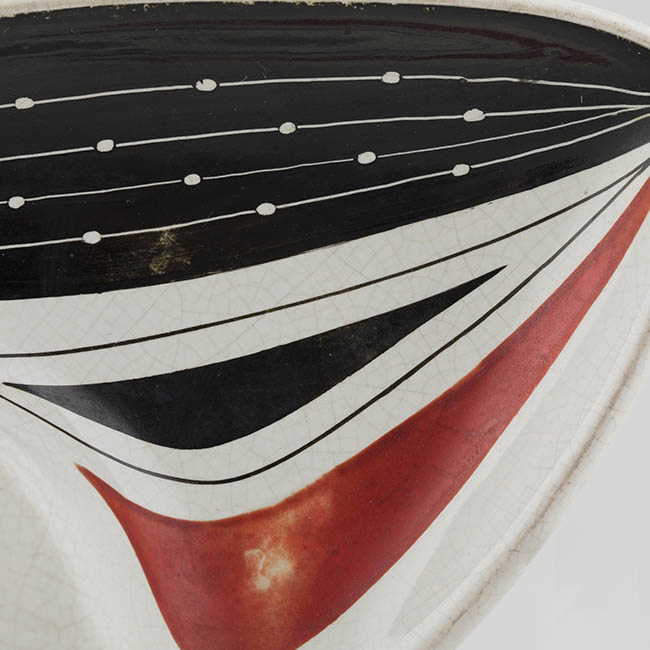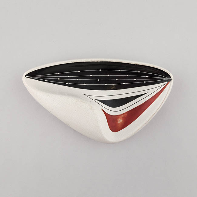 Recipiente para dejar las cenizas de tabaco, de forma irregular alargada y borde asimétrico. La superficie blanca presenta una composición geométrica formada por áreas angulares en negro, blanco y rojo, organizadas en capas superpuestas. Líneas negras finas conectan las distintas secciones cromáticas, y puntos blancos se distribuyen en el área oscura.